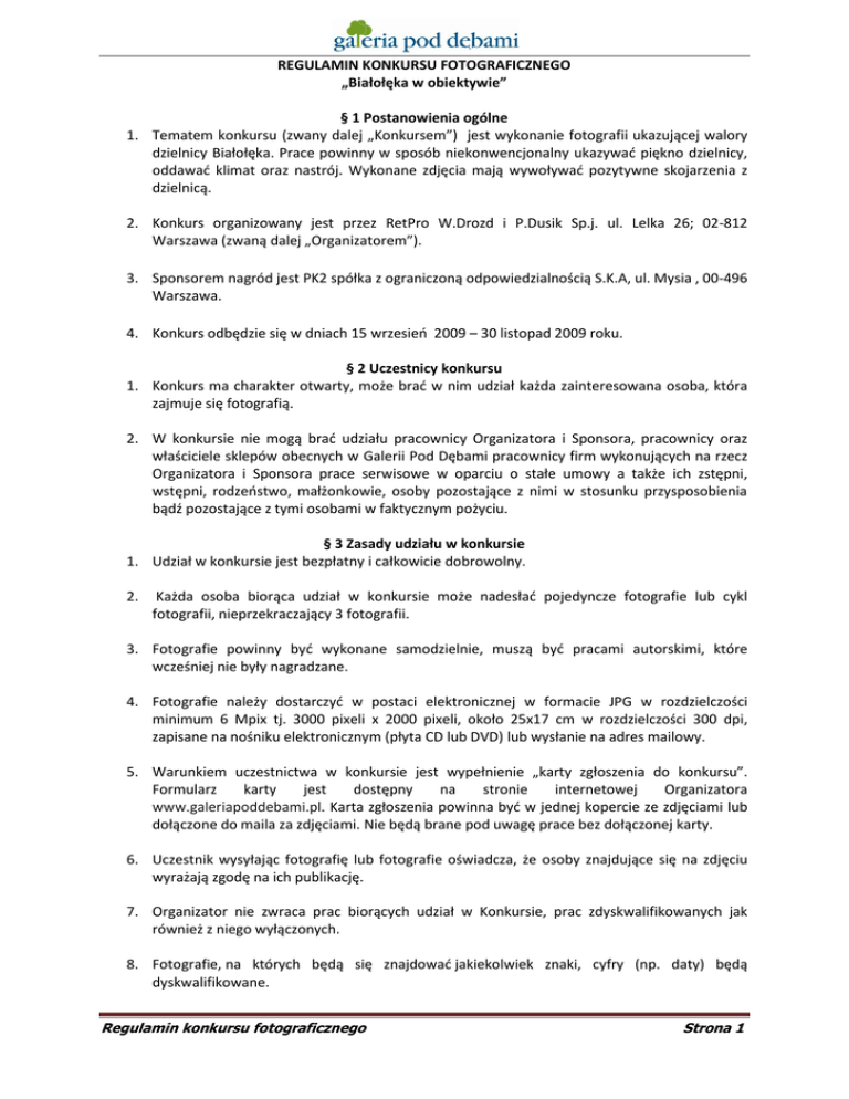 REGULAMIN KONKURSU FOTOGRAFICZNEGO „Białołęka w obiektywie” § 1 Postanowienia ogólne 1. Tematem konkursu (zwany dalej „Konkursem”) jest wykonanie fotografii ukazującej walory dzielnicy Białołęka. Prace powinny w sposób niekonwencjonalny ukazywad piękno dzielnicy, oddawad klimat oraz nastrój. Wykonane zdjęcia mają wywoływad pozytywne skojarzenia z dzielnicą. 2. Konkurs organizowany jest przez RetPro W.Drozd i P.Dusik Sp.j. ul. Lelka 26; 02-812 Warszawa (zwaną dalej „Organizatorem”). 3. Sponsorem nagród jest PK2 spółka z ograniczoną odpowiedzialnością S.K.A, ul. Mysia , 00-496 Warszawa. 4. Konkurs odbędzie się w dniach 15 wrzesieo 2009 – 30 listopad 2009 roku. § 2 Uczestnicy konkursu 1. Konkurs ma charakter otwarty, może brad w nim udział każda zainteresowana osoba, która zajmuje się fotografią. 2. W konkursie nie mogą brad udziału pracownicy Organizatora i Sponsora, pracownicy oraz właściciele sklepów obecnych w Galerii Pod Dębami pracownicy firm wykonujących na rzecz Organizatora i Sponsora prace serwisowe w oparciu o stałe umowy a także ich zstępni, wstępni, rodzeostwo, małżonkowie, osoby pozostające z nimi w stosunku przysposobienia bądź pozostające z tymi osobami w faktycznym pożyciu. § 3 Zasady udziału w konkursie 1. Udział w konkursie jest bezpłatny i całkowicie dobrowolny. 2. Każda osoba biorąca udział w konkursie może nadesład pojedyncze fotografie lub cykl fotografii, nieprzekraczający 3 fotografii. 3. Fotografie powinny byd wykonane samodzielnie, muszą byd pracami autorskimi, które wcześniej nie były nagradzane. 4. Fotografie należy dostarczyd w postaci elektronicznej w formacie JPG w rozdzielczości minimum 6 Mpix tj. 3000 pixeli x 2000 pixeli, około 25x17 cm w rozdzielczości 300 dpi, zapisane na nośniku elektronicznym (płyta CD lub DVD) lub wysłanie na adres mailowy. 5. Warunkiem uczestnictwa w konkursie jest wypełnienie „karty zgłoszenia do konkursu”. Formularz karty jest dostępny na stronie internetowej Organizatora www.galeriapoddebami.pl. Karta zgłoszenia powinna byd w jednej kopercie ze zdjęciami lub dołączone do maila za zdjęciami. Nie będą brane pod uwagę prace bez dołączonej karty. 6. Uczestnik wysyłając fotografię lub fotografie oświadcza, że osoby znajdujące się na zdjęciu wyrażają zgodę na ich publikację. 7. Organizator nie zwraca prac biorących udział w Konkursie, prac zdyskwalifikowanych jak również z niego wyłączonych. 8. Fotografie, na których będą się znajdowad jakiekolwiek znaki, cyfry (np. daty) będą dyskwalifikowane. Regulamin konkursu fotograficznego Strona 1 § 4 Miejsce i termin nadsyłania prac 1. Fotografie należy przesład pocztą na adres RetPro, ul. Lelka26, 02-812 Warszawa lub dostarczyd osobiście na w/w adres w zamkniętych kopertach z napisem „KONKURS FOTOGRAFICZNY” lub przesłane na adres mailowy [email protected]. Każde zdjęcie biorące udział w konkursie musi byd opisane w następujący sposób: imię i nazwisko autora zdjęcia, miejsce i obiekt znajdujący się na zdjęciu. 2. Termin składania prac upływa z dniem 30 listopad 2009 r. Liczy się data stempla pocztowego. 3. Wyniki zostaną opublikowane na stronie internetowej www.galeriapoddebami.pl. Jednocześnie laureaci i osoby wyróżnione zostaną powiadomieni pocztą. 4. Organizator nie bierze odpowiedzialności za ewentualne uszkodzenia lub zniszczenia źle zabezpieczonych prac. § 5 Jury 1. Prace będą oceniane przez profesjonalne Jury powołane przez Organizatora konkursu, które wyłoni Laureatów. 2. Pełny skład Jury zostanie podany na stronie: www.galeriapoddebami.pl 3. Decyzja Jury o przyznaniu nagrody lub wyróżnienia jest ostateczna i nie przysługuje od niej prawo odwołania. § 6 Nagrody i wyróżnienia 1. W Konkursie zostaną przyznane nagrody dla laureatów najciekawszych prac, wyniki zostaną opublikowane do 6 grudnia 2009r. na stronie www.galeriapoddebami.pl 2. Nagrodami w konkursie są: Weekendowy kursy fotografii Dwie drukarki do zdjęd Trzy ramki cyfrowe do zdjęd 3. Uczestnikom Konkursu nie przysługują roszczenia o wypłatę wartości Nagrody w kwocie pieniężnej, za wyjątkiem nagród pieniężnych. 4. Wręczenie nagród nastąpi podczas uroczystego otwarcia wystawy pokonkursowej. Informacje o terminie i miejscu wręczenia nagród zamieszczone będą na stronie internetowej www.galeriapoddebami.pl 5. Organizator zastrzega sobie możliwośd nie przyznania nagrody głównej lub nie przyznania żadnych wyróżnieo w związku z niskim poziomem prac. 6. Jury ma prawo dokonania innego podziału nagród z zachowaniem zasady rozdysponowania całej ich puli. 7. Wytypowane pracy przez Jury będą wyeksponowane na terenie Galerii Pod Dębami, przy ul. Pasłęckiej 8d w Warszawie. Regulamin konkursu fotograficznego Strona 2 § 7 Prawa autorskie 1. Przesłane prace przechodzą na własnośd Organizatora. 2. Organizator zastrzega sobie prawo publikowania i reprodukowania prac konkursowych bez wypłacenia honorariów autorskich. 3. Organizator zastrzega sobie prawo do bezpłatnego prezentowania i publikacji fotografii konkursowych w celach promocyjnych w prasie, telewizji, na stronach internetowych Organizatora. 4. Prawa autorskie do fotografii, które będą publikowane pozostają własnością ich autorów. Z tego tytułu Organizator nie ponosi żadnej odpowiedzialności prawnej a w razie skierowania przeciwko Organizatorowi roszczenia przez osobę trzecią ze względu na naruszenie jej praw autorskich, uczestnik konkursu zobowiązuje się ponosid cywilno-prawną odpowiedzialnośd z tytułu wad prawnych wykonanych fotografii. § 8 Postanowienia koocowe 1. Organizator zastrzega sobie prawo przerwania, zmiany lub przedłużenia Konkursu w razie wystąpienia przyczyn od niego niezależnych. 2. Organizatorowi przysługuje prawo unieważnienia konkursu bez podania przyczyny oraz do nie wyłaniania zwycięzcy. 3. Osoby, które nie spełnią któreg