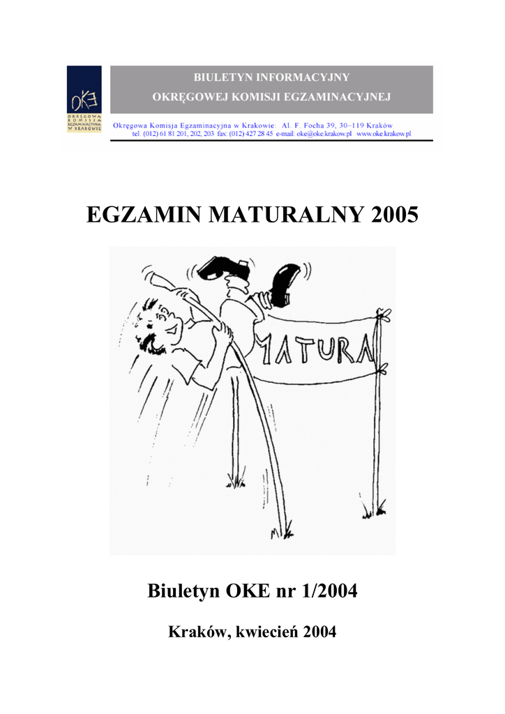 EGZAMIN MATURALNY 2005 Biuletyn OKE nr 1/2004 Kraków, kwiecień 2004 Spis treści: strona 1. Wstęp 3 2. Informacja o zasadach organizacji egzaminu maturalnego 4 A. B. C. D. E. F. G. H. I. J. K. L. Podstawy prawne egzaminu Zasady organizacji egzaminu maturalnego Deklaracje uczniów Dostosowywanie warunków egzaminu do potrzeb uczniów Zwolnienia z egzaminu Zmiany w deklaracji wyboru Wyniki egzaminu Warunki zdania egzaminu maturalnego Świadectwa Tryb odwoławczy Unieważnienia egzaminu Kolejne sesje egzaminacyjne 3. Wybrane zadania Przewodniczących Szkolnych Zespołów Egzaminacyjnych 9 4. Terminarz realizacji wybranych zadań Przewodniczących Szkolnych Zespołów Egzaminacyjnych (PSZE) 10 5. Informacja dla uczniów, którzy przystąpią do egzaminu maturalnego w sesji wiosennej 2004/2005 14 A. B. C. D. E. F. G. H. I. J. K. L. M. Opis egzaminu Zwolnienie z egzaminu maturalnego Zgłoszenie tematu do części ustnej egzaminu z języka polskiego… Dostosowanie warunków i formy egzaminu maturalnego Zmiany w deklaracji wyboru przedmiotów egzaminacyjnych Zdający zdał egzamin maturalny, jeżeli… Przebieg egzaminu – informacje ogólne Część ustna egzaminu maturalnego Część pisemna egzaminu maturalnego Komunikowanie wyników egzaminu maturalnego Tryb odwoławczy Unieważnienie egzaminu Kolejne sesje egzaminacyjne 6. Przykłady informacji o zasadach rekrutacji na rok akademicki 2005/2006 w uczelniach państwowych 22 7. Organizacja próbnego egzaminu maturalnego – czerwiec 2004 r. 28 Egzamin Maturalny 2005 – Biuletyn Informacyjny OKE w Krakowie Nr 1/2004 -2- 1. Wstęp W roku 2002 w systemie edukacji w Polsce pojawiły się szkoły ponadgimnazjalne. Ich uczniowie – absolwenci gimnazjów – w maju 2002 roku przystąpili do pierwszego egzaminu gimnazjalnego. Egzamin gimnazjalny należy do systemu egzaminów zewnętrznych, przeprowadzanych według procedur obowiązujących w całej Polsce, wykorzystujących te same arkusze egzaminacyjne w całym kraju, ocenianym kryterialnie przez egzaminatorów spoza danego gimnazjum, którzy są szkoleni przez okręgowe komisje egzaminacyjne (OKE). Praca egzaminatorów jest koordynowana przez OKE dla zapewnienia porównywalnego i jednolitego stosowania kryteriów oceniania prac egzaminacyjnych. Wprowadzenie zewnętrznego egzaminu na zakończenie gimnazjów pozwoliło na rezygnację z przeprowadzania egzaminów wstępnych do szkół ponadgimnazjalnych. W roku 2005 zakończy się ważny etap reformy edukacji w Polsce. Absolwenci dwóch typów trzyletnich szkół ponadgimnazjalnych – liceów ogólnokształcących i liceów profilowanych – przystąpią do pierwszego zewnętrznego egzaminu maturalnego („nowej matury”). Egzamin ten będzie przeprowadzany według procedur obowiązujących w całej Polsce. W części pisemnej wykorzystane zostaną te same arkusze w całym kraju. W zespole nadzorującym przebieg egzaminu na sali będzie co najmniej jeden nauczyciel z innej szkoły. Prace egzaminacyjne będą oceniane kryterialnie w sposób jednolity i porównywalny przez przeszkolonych egzaminatorów okręgowych komisji egzaminacyjnych. Wprowadzenie tego egzaminu ma doprowadzić do rezygnacji z przeprowadzania egzaminów wstępnych przez wyższe uczelnie. Oddajemy do rąk Państwa pierwszy Biuletyn Informacyjny OKE „Egzamin maturalny 2005”. Zebraliśmy tu w skondensowanej formie podstawowe informacje na temat egzaminu maturalnego 2005 i prosimy o udostępnienie tych informacji wszystkim nauczycielom i uczniom. Zachęcamy do poświęcenia tej tematyce spotkań Rady Pedagogicznej, lekcji wychowawczych, spotkań z rodzicami. Pełną informację o egzaminie 2005 można czerpać z Informatorów o Egzaminie Maturalnym 2005, Biuletynów Maturalnych CKE oraz z rozporządzenia MENiS poświęconego temu egzaminowi (ostatnia nowelizacja w dniu 7 stycznia 2003). Wersja elektroniczna tego Biuletynu będzie dostępna w serwisie internetowym OKE w Krakowie (www.oke.krakow.pl). Planujemy, że w jesieni roku 2004 ukaże się numer drugi Biuletynu (wraz z płytką CD), natomiast 1 czerwca 2004 roku uruchomimy internetowy serwis MOODLE dla egzaminu maturalnego 2005. Pierwsze szkolenia „na odległość” za pomocą tego serwisu – dla dyrektorów szkół i nauczycieli – będą służyły koordynacji oceniania prac próbnego egzaminu dla uczniów obecnych klas drugich. Zapraszamy do częstego korzystania z serwisów internetowych OKE w Krakowie. Dzięki nim będziecie Państwo mieli stały dostęp do aktualnych informacji i przez to będziecie mogli lepiej przygotować swoje szkoły do ważnego historycznego wydarzenia edukacyjnego w Polsce, jakim na pewno będzie egzamin maturalny 2005. W imieniu Okręgowej Komisji Egzaminacyjnej w Krakowie zapraszam Państwa do stałej współpracy w zakresie doskonalenia systemu oceniania pracy uczniów. Z poważaniem Dyrektor OKE Marek Legutko Egzamin Maturalny 2005 – Biuletyn Informacyjny OKE w Krakowie Nr 1/2004 -3- 2. Informacja o zasadach organizacji egzaminu maturalnego A. Podstawy prawne egzaminu Egzamin maturalny przeprowadzany jest w szkołach ponadgimnazjalnych, o których mowa w Art. 9 ust. 3. Ustawy o systemie oświaty. Są to: 1. trzyletnie licea ogólnokształcące, których ukończenie umożliwia uzyskanie świadectwa dojrzałości po zdaniu egzaminu maturalnego, 2. trzyletnie licea profilowane kształcące w profilach kształcenia ogólnozawodowego, których ukończenie umożliwia uzyskanie świadectwa dojrzałości po zdaniu egzaminu maturalnego, 3. czteroletnie technika, których ukończenie umożliwia uzyskanie dyplomu potwierdzającego kwalifikacje zawodowe po zdaniu egzaminu, a także umożliwiające uzyskanie świadectwa dojrzałości po zdaniu egzaminu maturalnego, 4. dwuletnie uzupełniające licea ogólnokształcące dla absolwentów szkół zawodowych, których ukończenie umożliwia uzyskanie świadectwa dojrzałości po zdaniu egzaminu maturalnego, 5. trzyletnie technika uzupełniające d
