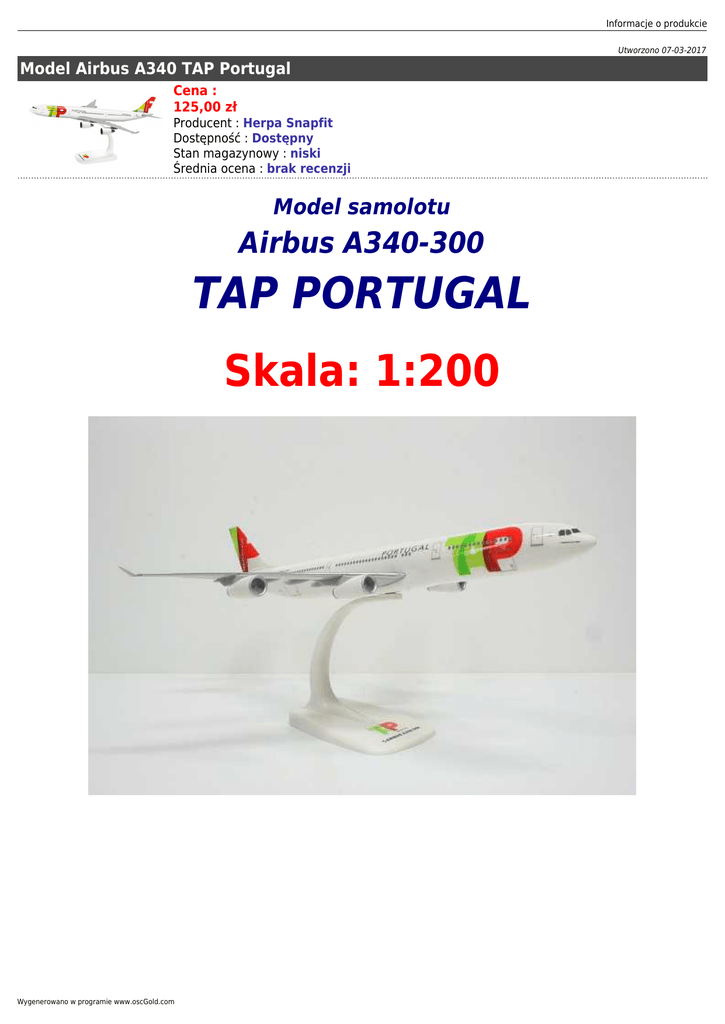Informacje o produkcie Utworzono 07-03-2017 Model Airbus A340 TAP Portugal Cena : 125,00 zł Producent : Herpa Snapfit Dostępność : Dostępny Stan magazynowy : niski Średnia ocena : brak recenzji Model samolotu Airbus A340-300 TAP PORTUGAL Skala: 1:200 Wygenerowano w programie www.oscGold.com WYMIARY: Długość kadłuba: 32 cm Rozpiętość skrzydeł: 30 cm Produkt do szybkiego i bardzo łatwego złożenia bezklejowego - kwestia wpięcia w kadłub skrzydeł, stateczników i podstawki - składa się z kilku elementów. Elementy zabezpieczone w plastikowych blistrach, całość opakowana w pudełko. Na potrzeby wysyłki model dodatkowo solidnie zabezpieczamy. Informacje o produkcie PRODUCENT - HERPA SNAPFIT Wygenerowano w programie www.oscGold.com