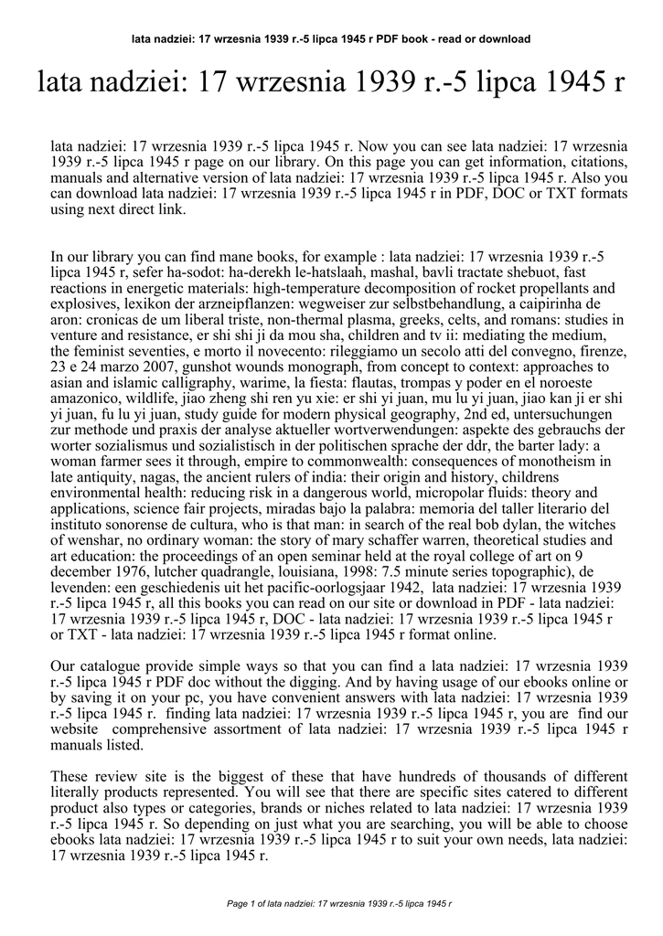 lata nadziei: 17 wrzesnia 1939 r.-5 lipca 1945 r PDF book - read or download lata nadziei: 17 wrzesnia 1939 r.-5 lipca 1945 r lata nadziei: 17 wrzesnia 1939 r.-5 lipca 1945 r. Now you can see lata nadziei: 17 wrzesnia 1939 r.-5 lipca 1945 r page on our library. On this page you can get information, citations, manuals and alternative version of lata nadziei: 17 wrzesnia 1939 r.-5 lipca 1945 r. Also you can download lata nadziei: 17 wrzesnia 1939 r.-5 lipca 1945 r in PDF, DOC or TXT formats using next direct link. In our library you can find mane books, for example : lata nadziei: 17 wrzesnia 1939 r.-5 lipca 1945 r, sefer ha-sodot: ha-derekh le-hatslaah, mashal, bavli tractate shebuot, fast reactions in energetic materials: high-temperature decomposition of rocket propellants and explosives, lexikon der arzneipflanzen: wegweiser zur selbstbehandlung, a caipirinha de aron: cronicas de um liberal triste, non-thermal plasma, greeks, celts, and romans: studies in venture and resistance, er shi shi ji da mou sha, children and tv ii: mediating the medium, the feminist seventies, e morto il novecento: rileggiamo un secolo atti del convegno, firenze, 23 e 24 marzo 2007, gunshot wounds monograph, from concept to context: approaches to asian and islamic calligraphy, warime, la fiesta: flautas, trompas y poder en el noroeste amazonico, wildlife, jiao zheng shi ren yu xie: er shi yi juan, mu lu yi juan, jiao kan ji er shi yi juan, fu lu yi juan, study guide for modern physical geography, 2nd ed, untersuchungen zur methode und praxis der analyse aktueller wortverwendungen: aspekte des gebrauchs der worter sozialismus und sozialistisch in der politischen sprache der ddr, the barter lady: a woman farmer sees it through, empire to commonwealth: consequences of monotheism in late antiquity, nagas, the ancient rulers of india: their origin and history, childrens environmental health: reducing risk in a dangerous world, micropolar fluids: theory and applications, science fair projects, miradas bajo la palabra: memoria del taller literario del instituto sonorense de cultura, who is that man: in search of the real bob dylan, the witches of wenshar, no ordinary woman: the story of mary schaffer warren, theoretical studies and art education: the proceedings of an open seminar held at the royal college of art on 9 december 1976, lutcher quadrangle, louisiana, 1998: 7.5 minute series topographic), de levenden: een geschiedenis uit het pacific-oorlogsjaar 1942, lata nadziei: 17 wrzesnia 1939 r.-5 lipca 1945 r, all this books you can read on our site or download in PDF - lata nadziei: 17 wrzesnia 1939 r.-5 lipca 1945 r, DOC - lata nadziei: 17 wrzesnia 1939 r.-5 lipca 1945 r or TXT - lata nadziei: 17 wrzesnia 1939 r.-5 lipca 1945 r format online. Our catalogue provide simple ways so that you can find a lata nadziei: 17 wrzesnia 1939 r.-5 lipca 1945 r PDF doc without the digging. And by having usage of our ebooks online or by saving it on your pc, you have convenient answers with lata nadziei: 17 wrzesnia 1939 r.-5 lipca 1945 r. finding lata nadziei: 17 wrzesnia 1939 r.-5 lipca 1945 r, you are find our website comprehensive assortment of lata nadziei: 17 wrzesnia 1939 r.-5 lipca 1945 r manuals listed. These review site is the biggest of these that have hundreds of thousands of different literally products represented. You will see that there are specific sites catered to different product also types or categories, brands or niches related to lata nadziei: 17 wrzesnia 1939 r.-5 lipca 1945 r. So depending on just what you are searching, you will be able to choose ebooks lata nadziei: 17 wrzesnia 1939 r.-5 lipca 1945 r to suit your own needs, lata nadziei: 17 wrzesnia 1939 r.-5 lipca 1945 r. Page 1 of lata nadziei: 17 wrzesnia 1939 r.-5 lipca 1945 r