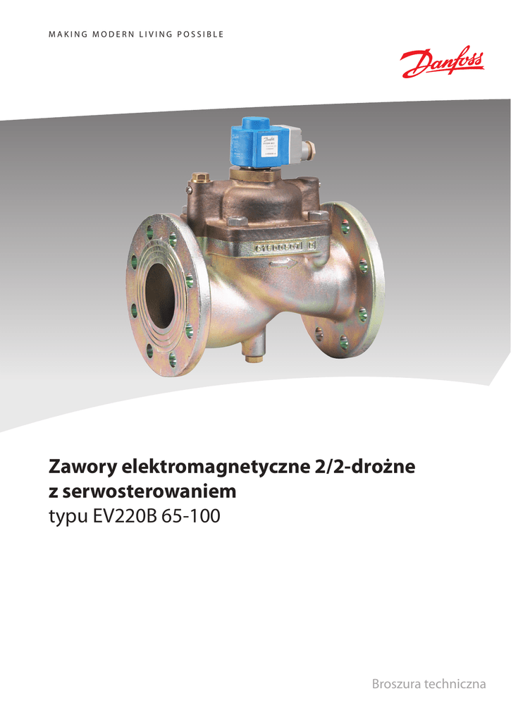 MAKING MODERN LIVING POSSIBLE Zawory elektromagnetyczne 2/2-drożne z serwosterowaniem typu EV220B 65-100 Broszura techniczna Broszura techniczna Zawory elektromagnetyczne 2/2-drożne z serwosterowaniem typu EV220B 65-100 Charakterystyka EV220B 65-100 • Zawór odcinający idealny do instalacji przeciwpożarowych, zasilania w wodę użytkową i innych wymagających aplikacji przemysłowych • Dla wody i innych mediów neutralnych • Maksymalne ciśnienie pracy: 10 bar • Przyłącze: FL 2 1/2”, 3” i 4” • Lepkość: do 50 cSt • Temperatura otoczenia: do +80°C • Stopień ochrony cewki: do IP 67 • Wbudowany filtr wewnętrzny do ochrony układu pilotowego Typ EV220B 65CI Montaż W pozycji poziomej z cewką skierowaną ku górze. Dopuszczalne ciśnienie różnicowe 0,25 - 10 bar Maks. ciśnienie testowe 15 bar Czas otwierania1) ~5s ~5s ~5s Czas zamykania1) ~7s ~ 15 s ~ 29 s Temperatura otoczenia Maks. +80oC (zależy od typu cewki, patrz dane dla wybranego modelu) Temperatura medium -25 do +90oC Lepkość medium Maks. 50 cSt Materiały Korpus zaworu: Zwora, ogranicznik Tuleja zwory: Sprężyny: Uszczelnienia: EV220B 80CI Żeliwo (GG 20), Stal nierdzewna, Stal nierdzewna, Stal nierdzewna, EPDM, NBR, PTFE NBR, PTFE EV220B 100CI W.no. 0.6020 W.no. 1.4105/ AISI 430L W. no. 1.4306/ AISI 304L W. no. 1.4310/ AISI 301 (wersja EPDM) (wersja NBR) 1) Podane czasy są orientacyjne i odnoszą się do wody. Dokładne czasy otwierania i zamykania zaworów zależą od rodzaju i ciśnienia medium. 2IC.PD.200.E3.49 Broszura techniczna Zawory elektromagnetyczne 2/2-drożne z serwosterowaniem typu EV220B 65-100 Zasada działania 1. Zwora 2. Sprężyna układu pilotowego 3. Płytka zaworu 4. Otwór pilotowy 5. Tłok serwomechanizmu 6. Gniazdo zaworu 7. Otwór wyrównawczy 8. Cewka Napięcie podane na cewkę (zawór otwarty): Podłączenie napięcia do cewki (8) powoduje uniesienie się zwory i otwarcie przepływu przez otwór pilotowy (4). Ponieważ średnica otworu pilotowego jest większa niż średnica otworu wyrównawczego (7) ciśnienie medium nad tłokiem (5) maleje, co powoduje jego uniesienie się a w konsekwencji pełne otwarcie przepływu poprzez otwór główny (6). Zawór będzie w pełni otwarty tak długo jak ciśnienie różnicowe na zaworze będzie większe niż wymagane dla danego typu zaworu ciśnienie minimalne i tak długo jak do cewki będzie podłączone napięcie. Brak napięcia na cewce (zawór zamknięty): Po odłączeniu napięcia od cewki (8), w wyniku działania sprężyny (2), zwora znajduje się w dolnym położeniu a zamontowana do niej płytka zaworu (3) jest dociskana do otworu pilotowego(4). Poprzez otwór wyrównawczy (7) medium dostaje się nad tłok(5) powodując wyrównanie ciśnienia nad i pod tłokiem. W rezultacie przepływ przez otwór główny (6) zostaje zamknięty. Zawór pozostanie w stanie zamkniętym tak długo jak do cewki nie będzie podłączone napięcie elektryczne. Zamawianie - wersje normalnie zamknięte (NC) Zamawianie - wersje normalnie otwarte (NO) Przyłącze kołnierzowe kv [m3/h] Typ zaworu Materiał uszczelnień Typ główny Nr kat. bez cewki Specyfikacja Dopuszczalne ciśnienie różnicowe min. [bar] maks. [bar] Typ cewki 2 1/2 50 EPDM EV220B 65 Cl FL 10E NC000 016D6065 0,25 10 BB, BE, BG 2 1/2 50 NBR EV220B 65 Cl FL 10N NC000 016D3330 0,25 10 BB, BE, BG 3 75 EPDM EV220B 80 Cl FL 10E NC000 016D6080 0,25 10 BB, BE, BG 3 75 NBR EV220B 80 Cl FL 10N NC000 016D3331 0,25 10 BB, BE, BG 4 130 EPDM EV220B 100 Cl FL 10E NC000 016D6100 0,25 10 BB, BE, BG Aby zamówić zawór normalnie otwarty należy z tabeli powyżej dobrać zawór typu NC, a następnie, w miejsce fabrycznie zamontowanej tulei wraz ze zworą, zamontować w nim układ normalnie otwarty z poniższej tabeli. Układ normalnie otwarty (NO) Typ DN 65 - DN 100 IC.PD.200.E3.49 Uszczelnienie Nr katalogowy EPDM 032U0296 NBR 032U0299 3 Broszura techniczna Zawory elektromagnetyczne 2/2-drożne z serwosterowaniem typu EV220B 65-100 Zestaw przeciwkołnierzy Typ Nr katalogowy. FL 2 1/2 do wspawania typu 11 zgodne z DIN EN 1092-1 EV220B 65 Cl 027N3065 G 2 1/2 typ 13 zgodne z DIN EN 1092-1 EV220B 65 Cl 027G3065 FL 3 do wspawania typu 11 zgodne z DIN EN 1092-1 EV220B 80 Cl 027N3080 G 3 typ 13 zgodne z DIN EN 1092-1 EV220B 80 Cl 027G3080 FL 4 do wspawania typu 11 zgodne z DIN EN 1092-1 EV220B 100 Cl 027N3100 G 4 typ 13 zgodne z DIN EN 1092-1 EV220B 100 Cl 027G3100 Przyłącze W skład każdego zestawu wchodzą dwa przeciwkołnierze. Cewki Typ: BB 10 W ac 18W dc Zamawianie - cewki Typ: BE (IP67) 10 W ac 18W dc Typ: BG 12 W ac 20W dc Szczegółowe dane i numery katalogowe znajdują się w karcie katalogowej cewek elektromagnetycznych. Wymiary i masa Szerokość cewki [mm] ØD [mm] H1 [mm] H2 [mm] Masa bez cewki [kg] 66 185 85 185 24 46 66 200 93 215 34 46 66 220 103 240 44 Typ L [mm] L1 [mm] 10 W ac 20 W dc EV220B 65 Cl 320 224 46 EV220B 80 Cl 370 265 EV220B 100 Cl 430 315 4IC.PD.200.E3.49 Broszura techniczna Zawory elektromagnetyczne 2/2-drożne z serwosterowaniem typu EV220B 65-100 Zestaw części zamiennych Zestaw części zamiennych Zestaw zawiera tłok serwomechanizmu, zworę oraz zestaw uszczelek. Nr katalogowy Typ Materiał uszczelnień EPDM NBR EV220B 65 016D0078 016D0095 EV220B 80 016D0079 016D0096 EV220B 100 016D0080 016D0097 Zestaw uszczelek Zestaw zawiera wszystkie niezbędne uszczelki (w zestawie brak uszczelek tłoka). Nr katalogowy Typ Materiał uszczelnień EPDM NBR EV220B 65 016D0075 016D0084 EV220B 80 016D0076 016D0085 EV220B 100 016D0077 016D0086 Wymienny filtr wewnętrzny Typ Nr katalogowy EV220B 65 016D0092 EV220B 80/100 016D0093 Danfoss nie ponosi odpowiedzialności za możliwe błędy drukarskie w katalogach, broszurach i innych materiałach drukowanych. Dane techniczne zawarte w broszurze mogą ulec zmianie bez wcześniejszego uprzedzenia, jako efekt stałych ulepszeń i modyfikacji naszych urządzeń. Wszystkie znaki towarowe w tym materiale są własnością odpowiednich 