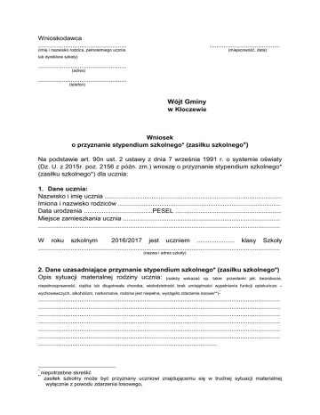 Wnioskodawca ................................................. ....................................... (imię i nazwisko rodzica, pełnoletniego ucznia (miejscowość, data) lub dyrektora szkoły) ................................................. (adres) ................................................. (telefon) Wójt Gminy w Kłoczewie Wniosek o przyznanie stypendium szkolnego* (zasiłku szkolnego*) Na podstawie art. 90n ust. 2 ustawy z dnia 7 września 1991 r. o systemie oświaty (Dz. U. z 2015r. poz. 2156 z późn. zm.) wnoszę o przyznanie stypendium szkolnego* (zasiłku szkolnego*) dla ucznia: 1. Dane ucznia: Nazwisko i imię ucznia .................................................................................................. Imiona i nazwisko rodziców .......................................................................................... Data urodzenia ......................................PESEL ........................................................... Miejsce zamieszkania ucznia ....................................................................................... ...................................................................................................................................... W roku szkolnym 2016/2017 jest uczniem ..................... klasy Szkoły ...................................................................................................................................... (nazwa i adres szkoły) 2. Dane uzasadniające przyznanie stypendium szkolnego* (zasiłku szkolnego*) Opis sytuacji materialnej rodziny ucznia: (należy wskazać np. takie przesłanki jak: bezrobocie, niepełnosprawność, ciężka lub długotrwała choroba, wielodzietność brak umiejętności wypełniania funkcji opiekuńczo – wychowawczych, alkoholizm, narkomania, rodzina jest niepełna, wystąpiło zdarzenie losowe**): ...................................................................................................................................... ...................................................................................................................................... ...................................................................................................................................... ...................................................................................................................................... ...................................................................................................................................... ...................................................................................................................................... ................................................................................................... * ** niepotrzebne skreślić zasiłek szkolny może być przyznany uczniowi znajdującemu się w trudnej sytuacji materialnej wyłącznie z powodu zdarzenia losowego, Oświadczenie o dochodach wszystkich członków rodziny ucznia pozostających we *** wspólnym gospodarstwie domowym Lp. Imię i nazwisko Data Stopień Źródło Wysokość dochodu urodzenia pokrewieństwa dochodu w zł (netto) Łączny dochód rodziny ucznia 3. Pożądana forma świadczenia pomocy materialnej (inna niż pieniężna): całkowite lub częściowe pokrycie kosztów udziału w zajęciach edukacyjnych, czyli refundacja zakupu podręczników, przyborów szkolnych, stroju sportowego, dofinansowanie kosztów dojazdu do szkoły lub dofinansowanie czesnego; pomoc rzeczowa (należy wskazać formy określone przez radę gminy w regulaminie): ...................................................................................................................................... ...................................................................................................................................... ...................................................................................................................................... ...................................................................................................................................... ...................................................................................................................................... ...................................................................................................................................... ...................................................................................................................................... ............................................................................. *** przed wypełnieniem tabelki należy zapoznać się z „Instrukcją” 4. Oświadczenia Świadomy(a) odpowiedzialności karnej wynikającej z art. 233 ustawy z dnia 6 czerwca 1997 r. – Kodeks karny (Dz. U. Nr 88, poz. 553 z późn. zm.) oświadczam, że powyższe dane są zgodne z prawdą. Ponadto wyrażam zgodę na przetwarzanie moich danych osobowych zawartych we wniosku, w celu przyznania i wypłaty pomocy materialnej, zgodnie z ustawą z dnia 29 sierpnia 1997 r. o ochronie danych osobowych (Dz. U. z 2002 r. Nr 101, poz. 926 z późn. zm.). Zobowiązuję się niezwłocznie powiadomić Wójta Gminy Kłoczew o zwiększeniu dochodu rodziny lub skreśleniu ucznia ze szkoły, o otrzymywaniu innego stypendium o charakterze socjalnym przez ucznia oraz zmianie miejsca zamieszkania – poza obszar gminy Kłoczew . ............................................................. (czytelny podpis wnioskodawcy) Instrukcja: 1. Jako dochód poszczególnych członków rodziny należy wpisać sumę miesięcznych przychodów z miesiąca poprzedzającego złożenie wniosku, bez względu na tytuł i źródło ich uzyskania z wyjątkiem jednorazowego świadczenia socjalnego, wartości świadczeń w naturze, świadczenia z tytułu prac społecznie użytecznych, zasiłku celowego oraz już otrzymywanego stypendium szkolnego lub zasiłku szkolnego. 2. W przypadku ut