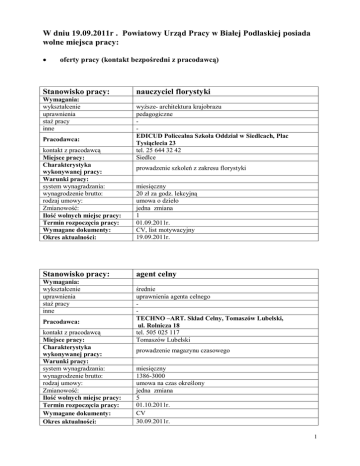 W dniu 19.09.2011r . Powiatowy Urząd Pracy w Białej Podlaskiej posiada wolne miejsca pracy: oferty pracy (kontakt bezpośredni z pracodawcą) Stanowisko pracy: Wymagania: wykształcenie uprawnienia staż pracy inne Pracodawca: kontakt z pracodawcą Miejsce pracy: Charakterystyka wykonywanej pracy: Warunki pracy: system wynagradzania: wynagrodzenie brutto: rodzaj umowy: Zmianowość: Ilość wolnych miejsc pracy: Termin rozpoczęcia pracy: Wymagane dokumenty: Okres aktualności: Stanowisko pracy: Wymagania: wykształcenie uprawnienia staż pracy inne Pracodawca: kontakt z pracodawcą Miejsce pracy: Charakterystyka wykonywanej pracy: Warunki pracy: system wynagradzania: wynagrodzenie brutto: rodzaj umowy: Zmianowość: Ilość wolnych miejsc pracy: Termin rozpoczęcia pracy: Wymagane dokumenty: Okres aktualności: nauczyciel florystyki wyższe- architektura krajobrazu pedagogiczne EDICUD Policealna Szkoła Oddział w Siedlcach, Plac Tysiąclecia 23 tel. 25 644 32 42 Siedlce prowadzenie szkoleń z zakresu florystyki miesięczny 20 zł za godz. lekcyjną umowa o dzieło jedna zmiana 1 01.09.2011r. CV, list motywacyjny 19.09.2011r. agent celny średnie uprawnienia agenta celnego TECHNO –ART. Skład Celny, Tomaszów Lubelski, ul. Rolnicza 18 tel. 505 025 117 Tomaszów Lubelski prowadzenie magazynu czasowego miesięczny 1386-3000 umowa na czas określony jedna zmiana 5 01.10.2011r. CV 30.09.2011r. 1 Stanowisko pracy: sprzedawca/kasjer Wymagania: wykształcenie uprawnienia staż pracy inne Pracodawca: kontakt z pracodawcą Miejsce pracy: Charakterystyka wykonywanej pracy: Warunki pracy: system wynagradzania: wynagrodzenie brutto: rodzaj umowy: zmianowość: Ilość wolnych miejsc pracy: Termin rozpoczęcia pracy: Wymagane dokumenty: Okres aktualności: Nr. oferty zawodowe mile widziane doświadczenie na w/w stanowisku obsługa kasy fiskalnej Zakład Mięsny Mościbrody tel. 600 236 753 Biała Podl ul. Kopernika 22 i Plac Wolności obsługa klienta, sprzedaż wyrobów mięsnych Stanowisko pracy: diagnosta samochodowy miesięczny 1400+ premia umowa na okres próbny dwie zmiany 2 15.09.2011r. CV 30.09.2011r. OfPr/11/0654 Wymagania: wykształcenie uprawnienia staż pracy inne Pracodawca: kontakt z pracodawcą Miejsce pracy: Charakterystyka wykonywanej pracy: Warunki pracy: system wynagradzania: wynagrodzenie brutto: rodzaj umowy: zmianowość: Ilość wolnych miejsc pracy: Termin rozpoczęcia pracy: Wymagane dokumenty: Okres aktualności: Nr. oferty średnie diagnosty samochodowego mile widziane doświadczenie na w/w stanowisku CARDINAL Krzysztof Kalinowski tel. 607 939 433 Wisznice ul. Warszawska 90 sprawdzanie sprawności samochodu miesięczny 1386,umowa na okres próbny jedna zmiana 1 01.10.2011r. CV 19.10.2011r. OfPr/11/0744 2 Stanowisko pracy: Wymagania: wykształcenie uprawnienia staż pracy inne Pracodawca: kontakt z pracodawcą Miejsce pracy: Charakterystyka wykonywanej pracy: Warunki pracy: system wynagradzania: wynagrodzenie brutto: rodzaj umowy: Zmianowość: Ilość wolnych miejsc pracy: Termin rozpoczęcia pracy: Wymagane dokumenty: Okres aktualności: Stanowisko pracy: Wymagania: wykształcenie uprawnienia staż pracy inne Pracodawca: kontakt z pracodawcą Miejsce pracy: Charakterystyka wykonywanej pracy: Warunki pracy: system wynagradzania: wynagrodzenie brutto: rodzaj umowy: Zmianowość: Ilość wolnych miejsc pracy: Termin rozpoczęcia pracy: Wymagane dokumenty: Okres aktualności: Stanowisko pracy: operator koparki kołowej(koparko-ładowarki) uprawnienia do obsługi koparko-ładowarki mile widziane na w/w stanowisku PU KWP Piwowarski Jacek; ul. Baczyńskiego; Sosnowiec tel.515 149 127 teren Polski obsługa koparko-ładowarki godzinowy 12 zł za godz. umowa zlecenie 2 zmiany 4 01.10.2011r. CV, list motywacyjny 13.10.2011r. monter kanalizacji zewnętrznej mile widziane na w/w stanowisku PU KWP Piwowarski Jacek; ul. Baczyńskiego; Sosnowiec tel.515 149 127 teren Polski obsługa niwelalatora godzinowy 12 zł za godz. umowa o pracę 2 zmiany 6 01.10.2011r. CV, list motywacyjny 13.10.2011r. operator CNC 3 Wymagania: wykształcenie uprawnienia staż pracy inne Pracodawca: kontakt z pracodawcą Miejsce pracy: Charakterystyka wykonywanej pracy: Warunki pracy: system wynagradzania: wynagrodzenie brutto: rodzaj umowy: Zmianowość: Ilość wolnych miejsc pracy: Termin rozpoczęcia pracy: Wymagane dokumenty: Okres aktualności: Stanowisko pracy: zawodowe mile widziane na w/w stanowisku znajomość obsługi obrabiarek sterowanych numerycznych, rysunku technicznego PRONAR; ul. Mickiewicza 101A, Narew tel. 85 682 71 47, 682 72 96, 682 72 84 Narew, Narewka, Siemiatycze, Strabla obsługa obrabiarek sterowanych numerycznych akordowy 11 zł za godz umowa na okres próbny dwie zmiany 4 01.10.2011r. CV 20.10.2011r. sprzedawca Wymagania: wykształcenie uprawnienia staż pracy inne Pracodawca: kontakt z pracodawcą Miejsce pracy: Charakterystyka wykonywanej pracy: Warunki pracy: system wynagradzania: wynagrodzenie brutto: rodzaj umowy: zmianowość: Ilość wolnych miejsc pracy: Termin rozpoczęcia pracy: Wymagane dokumenty: Okres aktualności: Nr. oferty średnie elektryczne mile widziane doświadczenie na w/w stanowisku ASAJ Biała Podl, ul.Sidorska 59 tel. 693 893 620 Biała Podl ul.Sidorska 59 sprzedaż artykułów elektrycznych Stanowisko pracy: monter instalacji elektrycznych miesięczny 1800 umowa na okres próbny dwie zmiany 2 01.10.2011r. CV 12.10.2011r. OfPr/11/0727 4 Wymagania: wykształcenie uprawnienia staż pracy inne Pracodawca: kontakt z pracodawcą Miejsce pracy: Charakterystyka wykonywanej pracy: Warunki pracy: system wynagradzania: wynagrodzenie brutto: rodzaj umowy: zmianowość: Ilość wolnych miejsc pracy: Termin rozpoczęcia pracy: Wymagane dokumenty: Okres aktualności: Nr. oferty zawodowe elektryczne mile widziane doświadczenie na w/w stanowisku mle widziane uprawnienia SEP ELMONT AKP Biała Podl, ul.Sidorska 142 tel. 83 343 32 39 Biała Podl i teren kraju montowanie tras