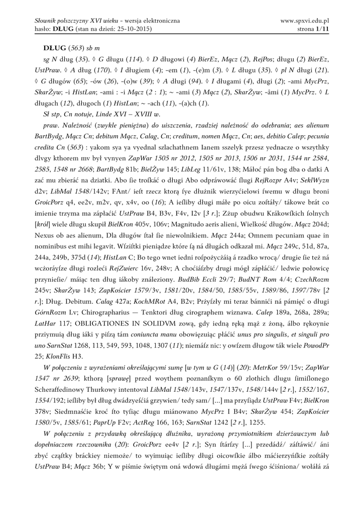 Słownik polszczyzny XVI wieku - wersja elektroniczna hasło: DŁUG (stan na dzień: 25-10-2015) www.spxvi.edu.pl strona 1/11 DŁUG (563) sb m sg N dług (35). ◊ G długu (114). ◊ D długowi (4) BierEz, Mącz (2), RejPos; długu (2) BierEz, UstPraw. ◊ A dług (170). ◊ I długiem (4); -em (1), -(e)m (3). ◊ L długu (35). ◊ pl N długi (21). ◊ G długów (65); -ów (26), -(o)w (39); ◊ A długi (94). ◊ I długami (4), długi (2); -ami MycPrz, SkarŻyw; -i HistLan; -ami : -i Mącz (2 : 1); ~ -ami (3) Mącz (2), SkarŻyw; -åmi (1) MycPrz. ◊ L długach (12), długoch (1) HistLan; ~ -ach (11), -(a)ch (1). Sł stp, Cn notuje, Linde XVI – XVIII w. praw. Należność (zwykle pieniężna) do uiszczenia, rzadziej należność do odebrania; aes alienum BartBydg, Mącz Cn; debitum Mącz, Calag, Cn; creditum, nomen Mącz, Cn; aes, debitio Calep; pecunia credita Cn (563) : yakom sya ya vyednal szlachathnem Ianem sszelyk przesz yednacze o wszythky dlvgy kthorem mv był vynyen ZapWar 1505 nr 2012, 1505 nr 2013, 1506 nr 2031, 1544 nr 2584, 2585, 1548 nr 2668; BartBydg 81b; BielŻyw 145; LibLeg 11/61v, 138; Máłoć pán bog dba o datki A zać mu zbieráć na dziatki. Abo ſie troſkáć o długi Abo odpráwowáć ſlugi RejRozpr A4v; SeklWyzn d2v; LibMal 1548/142v; FAnt/ ieſt rzecz ktorą ſye dłużnik wierzyćielowi ſwemu w długu broni GroicPorz q4, ee2v, m2v, qv, x4v, oo (16); A ieſliby długi máłe po oicu zoſtáły/ tákowe brát co imienie trzyma ma zápłaćić UstPraw B4, B3v, F4v, I2v [3 r.]; Zżup obudwu Krákowſkich ſolnych [król] wiele długu skupił BielKron 405v, 106v; Magnitudo aeris alieni, Wielkość długów. Mącz 204d; Nexus ob aes alienum, Dla długów ſtał ſie niewolnikiem. Mącz 244a; Omnem pecuniam quae in nominibus est mihi legavit. Wſziſtki pieniądze które ſą ná długách odkazał mi. Mącz 249c, 51d, 87a, 244a, 249b, 375d (14); HistLan C; Bo tego wnet iedni roſpożycżáią á rzadko wrocą/ drugie ſie też ná wcżoráyſze długi rozleći RejZwierc 16v, 248v; A choćiáſzby drugi mógł zápłáćić/ ledwie połowicę przynieſie/ máiąc ten dług iákoby ználeziony. BudBib Eccli 29/7; BudNT Rom 4/4; CzechRozm 245v; SkarŻyw 143; ZapKościer 1579/3v, 1581/20v, 1584/50, 1585/55v, 1589/86, 1597/78v [2 r.]; Dług. Debitum. Calag 427a; KochMRot A4, B2v; Prżyſzły mi teraz bánnići ná pámięć o długi GórnRozm Lv; Chirographarius — Tenktori dług cirographem wiznawa. Calep 189a, 268a, 289a; LatHar 117; OBLIGATIONES IN SOLIDVM zową, gdy iedną ręką mąż z żoną, álbo rękoynie prziymuią dług iáki y piſzą tám coniuncta manu obowięzuiąc płáćić unus pro singulis, et singuli pro uno SarnStat 1268, 113, 549, 593, 1048, 1307 (11); niemáſz nic: y owſzem długow ták wiele PowodPr 25; KlonFlis H3. W połączeniu z wyrażeniami określającymi sumę [w tym w G (14)] (20): MetrKor 59/15v; ZapWar 1547 nr 2639; kthorą [sprawę] przed woythem poznanſkym o 60 zlothich dlugu ſimiſlonego Scheraffedinowy Thurkowy intentoval LibMal 1548/143v, 1547/137v, 1548/144v [2 r.], 1552/167, 1554/192; ieſliby był dług dwádzyeſćiá grzywien/ tedy sam/ [...] ma przyſiądz UstPraw F4v; BielKron 378v; Siedmnaśćie kroć ſto tyſiąc długu miánowano MycPrz I B4v; SkarŻyw 454; ZapKościer 1580/5v, 1585/61; PaprUp F2v; ActReg 166, 163; SarnStat 1242 [2 r.], 1255. W połączeniu z przydawką określającą dłużnika, wyrażoną przymiotnikiem dzierżawczym lub dopełniaczem rzeczownika (20): GroicPorz ee4v [2 r.]; Syn ſtárſzy [...] przedádź/ záſtáwić/ áni zbyć cząſtky bráckiey niemoże/ to wyimuiąc ieſliby długi oicowſkie álbo máćierzyńſkie zoſtáły UstPraw B4; Mącz 36b; Y w piśmie świętym oná wdowá długámi mężá ſwego śćiśniona/ wołáłá zá Słownik polszczyzny XVI wieku - wersja elektroniczna hasło: DŁUG (stan na dzień: 25-10-2015) www.spxvi.edu.pl strona 2/11 Helizeuſzem prorokiem SkarŻyw 103; ZapKościer 1580/7y, 1584/50, 1586/64; ze nietylko długy niebosczykowskie, [...] zginęły. ActReg 163, 163 [2 r.j; SarnStat 582, 592, 593 [2 r.], 694, 1268 [2 r.]; CiekPotr 22. W połączeniu z zaimkiem dzierżawczym (34): MetrKor 59/76; LibLeg 11/108v, 138v, 155; SeklKat S4v; A Iſćiec ij [fant] też bierze/ áby w ſwoim długu był pewien y beſpieczen. GroicPorz rv, ee, eev, ee2 [3 r.], q4v; Leop Matth 18/25; UstPraw 13; Liberare se aere alieno, Popłáćic ſwoye długi Mącz 191b, 5a, 51d, 78d, 314a, 399; RejPos 193v [2 r.], 246, 246v [3 r.], 310; Prot A3v; áby chłopcá ſłał [ociec] do dłużnikow ſwoich/ Mowiąc niech ſie wżdy cżiuą o tych długoch moich. HistLan B4v; ZapKościer 1589/86 [3 r.]; SarnStat 276, 365. W połączeniach szeregowych (35): LibLeg 11/155; Iakom ya [...] wyeczistosczyach y wdlugw dzyessyaczi kop nyevpokoyl [!] y nyewskodzylem go ossmyseth kop tak my Bog pomozi ZapWar 1547 nr 2639; A ty odwłoki máią ſye rozumieć w ſpráwách vtćiwych/ gdźie rzecz idźie o dług/ o Imienie/ co zową in Ciuilibus GroicPorz ſ3, k, p4, q3, x, cc4v (10); A ktoryby ſię tákiego dlugu y ſzkody z łáiániem vpominał/ tákowy ma dáć ſądowi trzy grzywny. UstPraw B3v; á then rok ſiodmy/ żadne práwo/ áni długi/ áni cżynſze álbo podatki nie miáły iść. BielKron 36, 119; Mącz 438a; BielSat E; MycPrz I B4v; RejPos 181v; Bo iednego guzy á bliſka fránczá fráſuie/ drugiego też długi á cyrography RejZwierc 165; ZapKościer 1580/5v; O Dług/ á o zábićie/ Státut mamy ſłáby BielRozm 32v; żaden Kupiec [...] álbo dobrá iego dla wyſtępku álbo długu drugiému niech nie będźie zápowiedan/ zátrudnian/ áni iman. SarnStat 1074, 145, 656, 693, 798, 1156 [2 r.] (13). W charakterystycznych połączeniach: dług dawniejszy, (nie)mały (mniejszy) (7), ostatni, wczorajszy, wielki (nawiętszy) (3), własny (2), wszystek (16); wielkość długow; rzecz idzie (jest) (2), spor (swary są) o dług (2), sprawa (jest) o ([ile]) dług(u) (około d