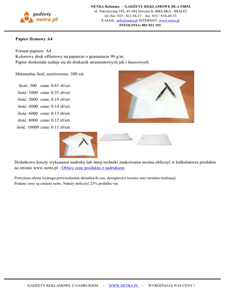 NETRA Reklama - GADŻETY REKLAMOWE DLA FIRM ul. Turystyczna 192, 43-384 Jaworze k/ BIELSKA - BIAŁEJ tel./fax: 033 / 812-56-17 fax: 033 / 810-49-33 E-MAIL: [email protected] INTERNET: www.netra.pl INFOLINIA: 801 022 192 Papier firmowy A4 Format papieru: A4 Kolorowy druk offsetowy na papierze o gramaturze 90 g/m˛ Papier doskonale nadaje się do drukarek atramentowych jak i laserowych. Minimalna ilość zamówienia: 500 szt. ilość: 500 cena: 0.61 zł/szt. ilość: 1000 cena: 0.35 zł/szt. ilość: 2000 cena: 0.19 zł/szt. ilość: 4000 cena: 0.14 zł/szt. ilość: 6000 cena: 0.13 zł/szt. ilość: 8000 cena: 0.12 zł/szt. ilość: 10000 cena: 0.11 zł/szt. Dodatkowe koszty wykonania nadruku lub innej techniki znakowania można obliczyć w kalkulatorze produktu na stronie www.netra.pl - Oblicz cenę produktu z nadrukiem Powyższa oferta wymaga potwierdzenia aktualnych cen, dostępności towaru oraz terminu realizacji. Podane ceny są cenami netto. Należy doliczyć 23% podatku vat. GADŻETY REKLAMOWE Z NADRUKIEM - WWW.NETRA.PL - WYRÓŻNIAJĄ NAS CENY !