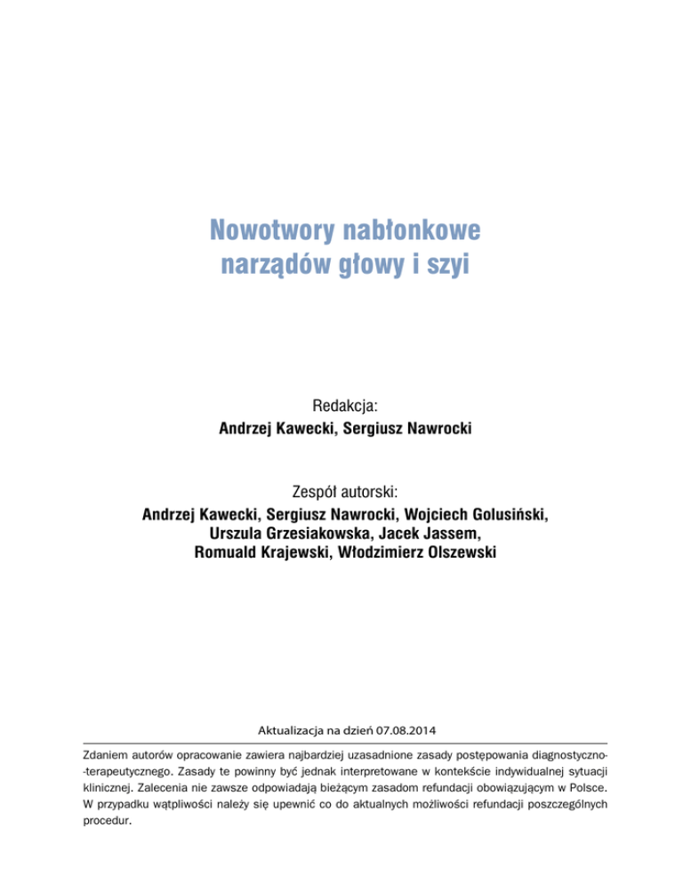 Nowotwory nabłonkowe narządów głowy i szyi Redakcja: Andrzej Kawecki, Sergiusz Nawrocki Zespół autorski: Andrzej Kawecki, Sergiusz Nawrocki, Wojciech Golusiński, Urszula Grzesiakowska, Jacek Jassem, Romuald Krajewski, Włodzimierz Olszewski Aktualizacja na dzień 07.08.2014 Zdaniem autorów opracowanie zawiera najbardziej uzasadnione zasady postępowania diagnostyczno-terapeutycznego. Zasady te powinny być jednak interpretowane w kontekście indywidualnej sytuacji klinicznej. Zalecenia nie zawsze odpowiadają bieżącym zasadom refundacji obowiązującym w Polsce. W przypadku wątpliwości należy się upewnić co do aktualnych możliwości refundacji poszczególnych procedur. Zalecenia postępowania diagnostyczno-terapeutycznego w nowotworach złośliwych — 2013 r. Spis treści Ogólna charakterystyka............................................................................................. 3 Epidemiologia i etiologia........................................................................................... 3 Diagnostyka............................................................................................................. 4 Badanie podmiotowe i przedmiotowe.................................................................... 4 Ocena patomorfologiczna..................................................................................... 4 Ocena zaawansowania........................................................................................ 5 Leczenie.................................................................................................................. 6 Ogólne zasady leczenia radykalnego..................................................................... 6 Radioterapia ...................................................................................................... 6 Leczenie chirurgiczne ........................................................................................ 12 Frakcjonowanie niekonwencjonalne dawki napromieniania i jednoczesna chemioradioterapia....................................................................... 13 Szczegółowe zasady postępowania diagnostyczno-terapeutycznego............................. 14 Rak wargi......................................................................................................... 14 Rak jamy ustnej................................................................................................ 15 Rak ustnej części gardła.................................................................................... 16 Rak nosowej części gardła................................................................................. 18 Rak krtani......................................................................................................... 19 Rak krtaniowej części gardła.............................................................................. 23 Rak jamy nosowej i zatok obocznych nosa .......................................................... 24 Rak gruczołów ślinowych.................................................................................... 25 Przerzuty raka do węzłów chłonnych szyi z nieznanego ogniska pierwotnego........... 28 Leczenie niepowodzeń miejscowych i regionalnych............................................... 29 Leczenie rozległych nawrotów miejscowych i regionalnych oraz przerzutów do narządów odległych............................................................... 30 2 Nowotwory nabłonkowe narządów głowy i szyi Ogólna charakterystyka Pojęcie „nabłonkowe nowotwory głowy i szyi” obejmuje raki umiejscowione w górnej części układu pokarmowego i oddechowego (jama ustna, gardło, krtań, jama nosowa, gruczoły ślinowe i zatoki oboczne nosa). Naturalny przebieg kliniczny i rokowanie w wymienionych nowotworach mogą się różnić w zależności od umiejscowienia, ale podobieństwa diagnostyczne i terapeutyczne powodują ich ujmowanie w jednej grupie. Nowotworom narządów głowy i szyi często towarzyszą poważne dolegliwości fizyczne, które z reguły utrudniają podstawowe czynności życiowe (oddychanie, odżywianie i mowę), a niekiedy mogą upośledzać wzrok, słuch, węch, smak i inne funkcje układu nerwowego. Zniekształcenia i ubytki czynnościowe powodowane chorobą oraz jej leczeniem mają bardzo negatywne skutki psychologiczne i społeczne. Epidemiologia i etiologia Nowotwory nabłonkowe (raki) regionu głowy i szyi stanowią około 5% wszystkich zarejestrowanych w Polsce nowotworów złośliwych (ok. 7% wśród mężczyzn i ponad 1% wśród kobiet). W ostatnich latach występuje rocznie około 6000 nowych zachorowań i 3800 zgonów z powodu omawianych nowotworów. W minionej dekadzie odnotowano spadek zachorowalności na raka krtani i jednocześnie wzrost zachorowań na raka ustnej części gardła. Raki narządów głowy i szyi są najczęstsze u osób po 45. roku życia (wyjątek stanowi rak nosowej części gardła z większą zachorowalnością między 15. a 35. rokiem życia oraz powyżej 50. roku życia). Zachorowalność jest prawie 5-krotnie wyższa wśród mężczyzn niż u kobiet. Podstawowym czynnikiem przyczynowym płaskonabłonkowych raków narządów głowy i szyi są kancerogeny zawarte w dymie tytoniowym (inne czynniki to nadużywanie wysokoprocentowego alkoholu, niedostateczna higiena jamy ustnej oraz mechaniczne drażnienie błon śluzowych, np. przez źle dopasowane protezy stomatologiczne). Szczególnie ryzykowna jest jednoczesna ekspozycja na dym tytoniowy i alkohol (efekt kancerogenny synergistyczny, a nie addytywny). W powstawaniu niektórych raków narządów głowy i szyi istotną rolę mogą odgrywać wirusy — zakażenie wirusem Epsteina-Barr występuje u 70–90% chorych na raka nosowej części gardła, a wirus brodawczaka ludzkiego (HPV, human papilloma virus), szczególnie typu 16, stanowi czynnik przyczynowy niektórych nowotworów (przede wszystkim raka ustnej części gardła, rzadziej