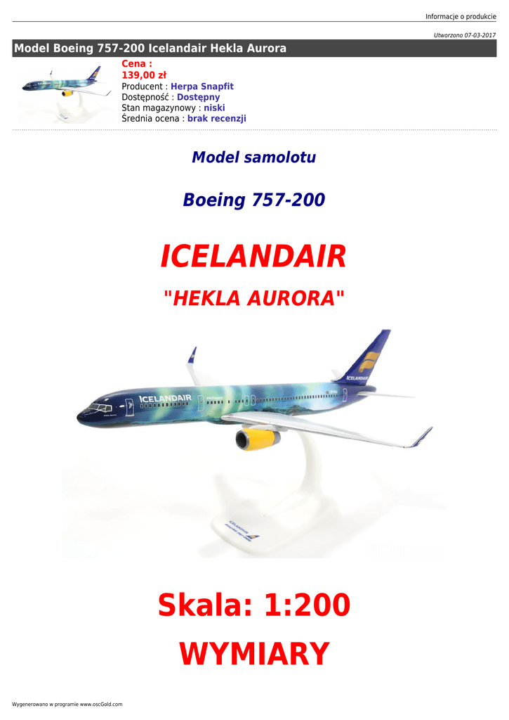 Informacje o produkcie Utworzono 07-03-2017 Model Boeing 757-200 Icelandair Hekla Aurora Cena : 139,00 zł Producent : Herpa Snapfit Dostępność : Dostępny Stan magazynowy : niski Średnia ocena : brak recenzji Model samolotu Boeing 757-200 ICELANDAIR "HEKLA AURORA" Skala: 1:200 WYMIARY Wygenerowano w programie www.oscGold.com Długość - 24 cm Rozpiętość - 19 cm Informacje o produkcie Producent: Herpa Snapfit Bardzo dobrej jakości tworzywo, kadłub z grubego plastiku, wysokiej jakości malowanie. Produkt do szybkiego i bardzo łatwego złożenia bezklejowego, składa się z kilku elementów. Elementy zabezpieczone w plastikowych blistrach, całość opakowana w pudełko. Wygenerowano w programie www.oscGold.com