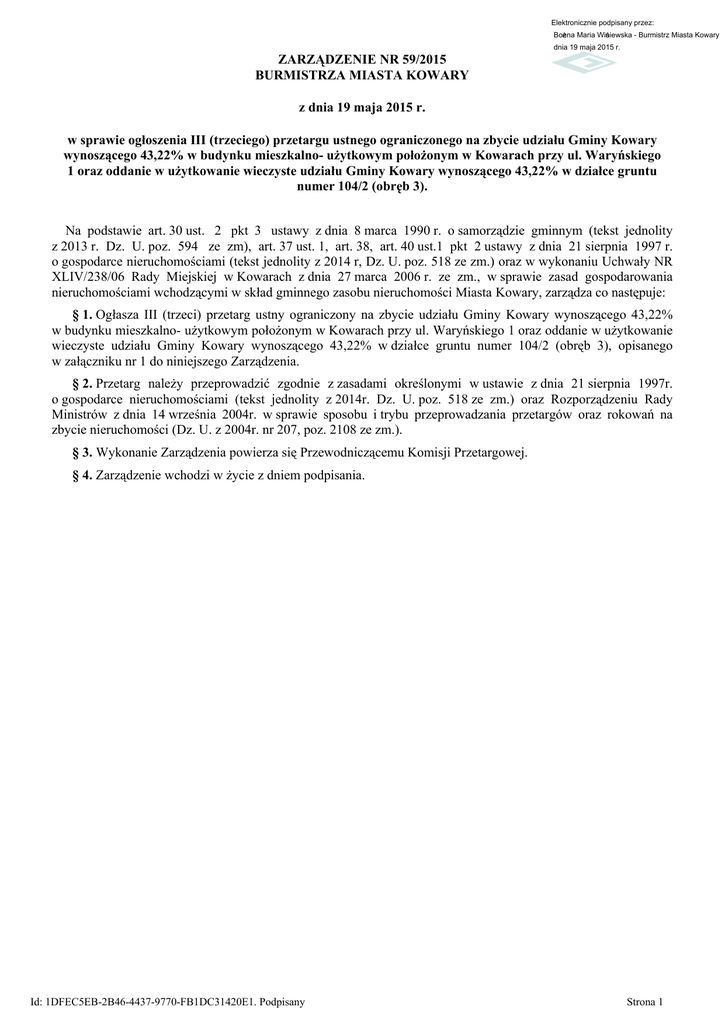 Elektronicznie podpisany przez: Bożena Maria Wiśniewska - Burmistrz Miasta Kowary dnia 19 maja 2015 r. ZARZĄDZENIE NR 59/2015 BURMISTRZA MIASTA KOWARY z dnia 19 maja 2015 r. w sprawie ogłoszenia III (trzeciego) przetargu ustnego ograniczonego na zbycie udziału Gminy Kowary wynoszącego 43,22% w budynku mieszkalno- użytkowym położonym w Kowarach przy ul. Waryńskiego 1 oraz oddanie w użytkowanie wieczyste udziału Gminy Kowary wynoszącego 43,22% w działce gruntu numer 104/2 (obręb 3). Na podstawie art. 30 ust. 2 pkt 3 ustawy z dnia 8 marca 1990 r. o samorządzie gminnym (tekst jednolity z 2013 r. Dz. U. poz. 594 ze zm), art. 37 ust. 1, art. 38, art. 40 ust.1 pkt 2 ustawy z dnia 21 sierpnia 1997 r. o gospodarce nieruchomościami (tekst jednolity z 2014 r, Dz. U. poz. 518 ze zm.) oraz w wykonaniu Uchwały NR XLIV/238/06 Rady Miejskiej w Kowarach z dnia 27 marca 2006 r. ze zm., w sprawie zasad gospodarowania nieruchomościami wchodzącymi w skład gminnego zasobu nieruchomości Miasta Kowary, zarządza co następuje: § 1. Ogłasza III (trzeci) przetarg ustny ograniczony na zbycie udziału Gminy Kowary wynoszącego 43,22% w budynku mieszkalno- użytkowym położonym w Kowarach przy ul. Waryńskiego 1 oraz oddanie w użytkowanie wieczyste udziału Gminy Kowary wynoszącego 43,22% w działce gruntu numer 104/2 (obręb 3), opisanego w załączniku nr 1 do niniejszego Zarządzenia. § 2. Przetarg należy przeprowadzić zgodnie z zasadami określonymi w ustawie z dnia 21 sierpnia 1997r. o gospodarce nieruchomościami (tekst jednolity z 2014r. Dz. U. poz. 518 ze zm.) oraz Rozporządzeniu Rady Ministrów z dnia 14 września 2004r. w sprawie sposobu i trybu przeprowadzania przetargów oraz rokowań na zbycie nieruchomości (Dz. U. z 2004r. nr 207, poz. 2108 ze zm.). § 3. Wykonanie Zarządzenia powierza się Przewodniczącemu Komisji Przetargowej. § 4. Zarządzenie wchodzi w życie z dniem podpisania. Id: 1DFEC5EB-2B46-4437-9770-FB1DC31420E1. Podpisany Strona 1 Kowary dnia 19.05.2015 r. Załącznik Nr 1 do Zarządzenia Nr 59 /2015 Burmistrza Miasta Kowary z dnia 19.05.2015r. OGŁOSZENIE o III ( trzecim ) przetargu ustnym ograniczonym na zbycie udziału Gminy Kowary wynoszącego 43,22% w budynku mieszkalno-użytkowym położonym w Kowarach przy ul. Waryńskiego nr 1 wraz z oddaniem w użytkowanie wieczyste udziału Gminy Kowary wynoszącego 43,22% w działce gruntu numer 104/2 ( obręb 3 ), który odbędzie się w dniu 30 czerwca 2015r. o godz. 1100 . Przetarg ustny ograniczony do właścicieli lokali w budynku mieszkalno- użytkowym położonym w Kowarach przy ul. Waryńskiego nr 1 w granicach działki gruntu oznaczonej numerem 104/2 ( obręb 3 ). 1.Nieruchomość będąca przedmiotem przetargu była zamieszczona w wykazie nieruchomości przeznaczonych do sprzedaży ( Zarządzenie Nr 143/2014 Burmistrza Miasta Kowary z dnia 04.12. 2014r. ), który został podany do publicznej wiadomości poprzez ogłoszenie w prasie, na stronie internetowej tut. Urzędu oraz wywieszony na tablicy ogłoszeń Urzędu Miejskiego w Kowarach w okresie od 05.12.2014r. do 17.01.2015r. 2.Ogłoszenie o I ( pierwszym ) przetargu ustnym ograniczonym ( Zarządzenie Nr 3 /2015 Burmistrza Miasta Kowary z dnia 20.01.2015r. ), było wywieszone na tablicy ogłoszeń Urzędu Miejskiego w Kowarach na okres 30 dni począwszy od 21.01.2015r. do 20.02.2015r., opublikowane na stronie internetowej Urzędu oraz umieszczone w prasie. 3.Ogłoszenie o II ( drugim ) przetargu ustnym ograniczonym ( Zarządzenie Nr 28/2015 Burmistrza Miasta Kowary z dnia 17.03.2015r. ), było wywieszone na tablicy ogłoszeń Urzędu Miejskiego w Kowarach na okres 30 dni począwszy od 18.03.2015r. do 17.04.2015r., opublikowane na stronie internetowej Urzędu oraz umieszczone w prasie. 4.Ogłoszenie o III ( trzecim ) przetargu ustnym ograniczonym ( Zarządzenie Nr 59/2015 Burmistrza Miasta Kowary z dnia 19.05.2015r. ), było wywieszone na tablicy ogłoszeń Urzędu Miejskiego w Kowarach na okres 30 dni począwszy od 20.05.2015r. do 18.06.2015r., opublikowane na stronie internetowej Urzędu oraz umieszczone w prasie. 5.Oznaczenie nieruchomości w/g danych z ewidencji gruntów i budynków : Nieruchomość oznaczona działką gruntu nr 104/2 ( obręb 3, a.m. 3) o pow. 0,0406 ha , położona w Kowarach przy ul. Waryńskiego nr 1, zabudowana budynkiem mieszkalnoużytkowym. Id: 1DFEC5EB-2B46-4437-9770-FB1DC31420E1. Podpisany Strona 2 6.Oznaczenie nieruchomości wg księgi wieczystej : Dla przedmiotowej nieruchomości Sąd Rejonowy VI Wydział Ksiąg Wieczystych w Jeleniej Górze prowadzi księgę wieczystą KW numer JG1J/00042877/2. 7.Opis nieruchomości : Współwłaścicielami nieruchomości położonej w Kowarach przy ul. Waryńskiego nr 1 są: Gmina Kowary w udziale wynoszącym 43,22% , właściciele wyodrębnionego lokalu użytkowego w udziale wynoszącym 49,19% oraz właścicielka wyodrębnionego lokalu mieszkalnego w udziale wynoszącym 7,59%. Budynek jest w złym stanie technicznym , od dawna nieużytkowany. Powiatowy Inspektor Nadzoru Budowlanego w Jeleniej Górze, Decyzją nr 16 z dnia 16.05.2014r., podlegającą natychmiastowemu wykonaniu, zakazał użytkowania budynku do czasu usunięcia nieprawidłowości, stwierdzając, że aktualny stan techniczny budynku zagraża zarówno mieszkańcom, jak też osobom mogącym znaleźć się w jego bezpośrednim otoczeniu a także bezpieczeństwu mienia. Udział Gminy Kowary wynoszący 43,22% w działce gruntu oznaczonej numerem 104/2 ( obręb 3, a.m. 3 ) o pow. 406 m 2 przy ul. Waryńskiego nr 1 oddawany w użytkowanie wieczyste. Powierzchnia gruntu wynikająca z przypadającego udziału w działce gruntu wynosi 175,47m2 . Udział Gminy Kowary wynoszący 43,22% w budynku mieszkalno- użytkowym. Budynek wolnostojący o trzech kondygnacjach nadziemnych, posadowiony na równym terenie. Budynek w złym stanie technicznym. Budynek posiada dostęp do instalacji elektrycznej,wodociągowej, gazowej telefonicznej ora