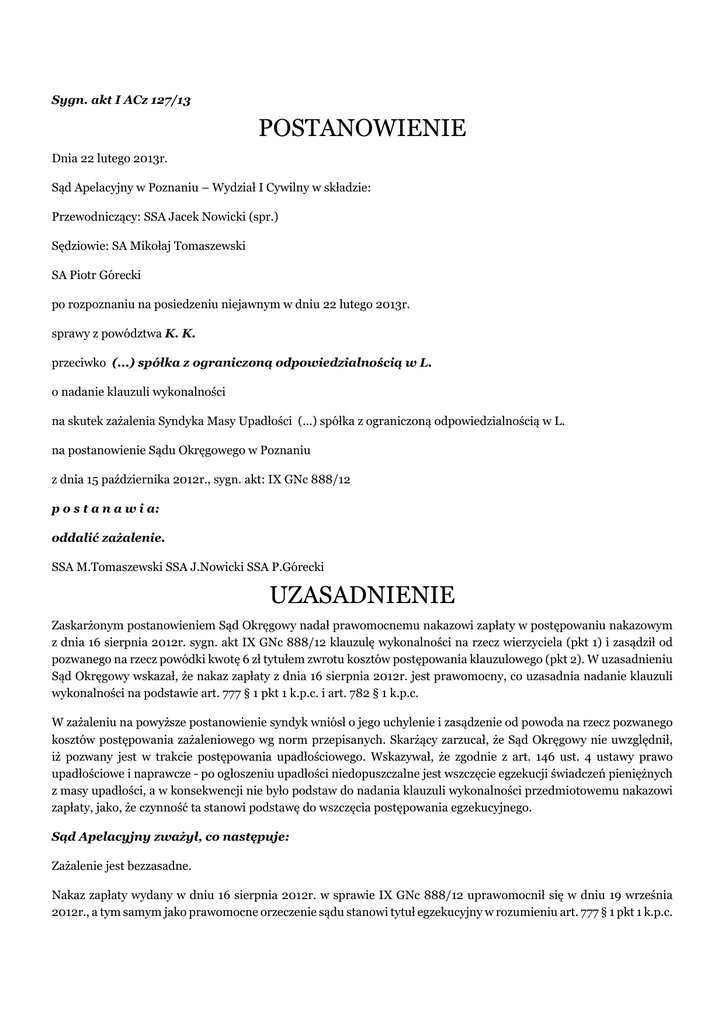 Sygn. akt I ACz 127/13 POSTANOWIENIE Dnia 22 lutego 2013r. Sąd Apelacyjny w Poznaniu – Wydział I Cywilny w składzie: Przewodniczący: SSA Jacek Nowicki (spr.) Sędziowie: SA Mikołaj Tomaszewski SA Piotr Górecki po rozpoznaniu na posiedzeniu niejawnym w dniu 22 lutego 2013r. sprawy z powództwa K. K. przeciwko (...) spółka z ograniczoną odpowiedzialnością w L. o nadanie klauzuli wykonalności na skutek zażalenia Syndyka Masy Upadłości (...) spółka z ograniczoną odpowiedzialnością w L. na postanowienie Sądu Okręgowego w Poznaniu z dnia 15 października 2012r., sygn. akt: IX GNc 888/12 p o s t a n a w i a: oddalić zażalenie. SSA M.Tomaszewski SSA J.Nowicki SSA P.Górecki UZASADNIENIE Zaskarżonym postanowieniem Sąd Okręgowy nadał prawomocnemu nakazowi zapłaty w postępowaniu nakazowym z dnia 16 sierpnia 2012r. sygn. akt IX GNc 888/12 klauzulę wykonalności na rzecz wierzyciela (pkt 1) i zasądził od pozwanego na rzecz powódki kwotę 6 zł tytułem zwrotu kosztów postępowania klauzulowego (pkt 2). W uzasadnieniu Sąd Okręgowy wskazał, że nakaz zapłaty z dnia 16 sierpnia 2012r. jest prawomocny, co uzasadnia nadanie klauzuli wykonalności na podstawie art. 777 § 1 pkt 1 k.p.c. i art. 782 § 1 k.p.c. W zażaleniu na powyższe postanowienie syndyk wniósł o jego uchylenie i zasądzenie od powoda na rzecz pozwanego kosztów postępowania zażaleniowego wg norm przepisanych. Skarżący zarzucał, że Sąd Okręgowy nie uwzględnił, iż pozwany jest w trakcie postępowania upadłościowego. Wskazywał, że zgodnie z art. 146 ust. 4 ustawy prawo upadłościowe i naprawcze - po ogłoszeniu upadłości niedopuszczalne jest wszczęcie egzekucji świadczeń pieniężnych z masy upadłości, a w konsekwencji nie było podstaw do nadania klauzuli wykonalności przedmiotowemu nakazowi zapłaty, jako, że czynność ta stanowi podstawę do wszczęcia postępowania egzekucyjnego. Sąd Apelacyjny zważył, co następuje: Zażalenie jest bezzasadne. Nakaz zapłaty wydany w dniu 16 sierpnia 2012r. w sprawie IX GNc 888/12 uprawomocnił się w dniu 19 września 2012r., a tym samym jako prawomocne orzeczenie sądu stanowi tytuł egzekucyjny w rozumieniu art. 777 § 1 pkt 1 k.p.c. W dniu 21 września 2013 r. powódka złożyła wniosek o nadanie klauzuli wykonalności powyższemu nakazowi zapłaty, natomiast w dniu 8 października 2012r. Sąd Rejonowy dla m. st. Warszawy w Warszawie ogłosił upadłość (...) spółki z ograniczoną odpowiedzialnością w L., obejmującą likwidację jej majątku. Żalący zarzucał, że nie było podstaw do nadania klauzuli wykonalności powyższemu nakazowi zapłaty, ponieważ zgodnie z art. 146 ust. 4 ustawy prawo upadłościowe i naprawcze - po ogłoszeniu upadłości niedopuszczalne jest wszczęcie egzekucji świadczeń pieniężnych z masy upadłości. Zdaniem Sądu Apelacyjnego nie ma wątpliwości, że zgodnie z treścią art. 146 ust. 1 i 4 ustawy prawo upadłościowe i naprawcze - postępowanie egzekucyjne dotyczące wierzytelności podlegającej zgłoszeniu do masy upadłości, wszczęte przed ogłoszeniem upadłości, ulega zawieszeniu z mocy prawa z dniem ogłoszenia upadłości. Postępowanie to umarza się z mocy prawa po uprawomocnieniu się postanowienia o ogłoszeniu upadłości. Po ogłoszeniu upadłości niedopuszczalne jest wszczęcie egzekucji świadczeń pieniężnych z masy upadłości. Świadczenie pieniężne zasądzone od syndyka podlega zaspokojeniu według przepisów ustawy prawo upadłościowe i naprawcze. Regulacja przewidziana w cytowanym wyżej art. 146 ustawy prawo upadłościowe i naprawcze nie dotyczy jednak sytuacji związanej z nadaniem klauzuli wykonalności tytułowi egzekucyjnemu. Przyjmuje się bowiem, że chociaż formalnie postępowanie klauzulowe należy do postępowania egzekucyjnego, to jednak nie jest postępowaniem egzekucyjnym sensu stricto. Postępowanie o nadanie klauzuli wykonalności nie stanowi bowiem wszczęcia egzekucji - wierzyciel dopiero na podstawie tytułu egzekucyjnego zaopatrzonego w tę klauzulę może wszcząć egzekucję. Postępowanie egzekucyjne w ścisłym tego słowa znaczeniu zaczyna się dopiero od wszczęcia egzekucji (art. 796 k.p.c.). Postępowanie w sprawie nadania klauzuli wykonalności jako prowadzone wyłącznie w celu stworzenia podstawy przyszłego postępowania (tytułu wykonawczego) nie jest zatem ani częścią postępowania rozpoznawczego ani też częścią postępowania egzekucyjnego. Jest szczególnym postępowaniem o ściśle określonym przez jego przepisy zakresie kognicji. Oznacza to, że ogłoszenie upadłości, w stosunku do osoby przeciwko której wierzyciel egzekucyjny wcześniej wystąpił z wnioskiem o nadanie klauzuli wykonalności nie uzasadnia zawieszenia postępowania klauzulowego (postanowienie SA w Łodzi z dnia 7 marca 1993 r., I ACz 138/93, OSA 1993, nr 11, poz. 78). Ogłoszenie upadłości dłużnika nie jest przyczyną zawieszenia postępowania klauzulowego toczącego się przeciwko upadłemu, dotyczącego nadania klauzuli tytułowi egzekucyjnemu opiewającemu na wierzytelność podlegającą zgłoszeniu do masy upadłości. Przeciw syndykowi klauzula wykonalności nie może być bowiem w ogóle nadana, skoro egzekucja w stosunku do masy jest niedopuszczalna. Natomiast nadana w tym postępowaniu klauzula wykonalności przeciw upadłemu umożliwi wierzycielowi wszczęcie egzekucji wyłącznie przeciw upadłemu, tj. tylko w stosunku do mienia niewchodzącego do masy upadłości (por. Andrzej Jakubecki, komentarz do art. 146 ustawy prawo upadłościowe i naprawcze 2010r.). Mając powyższe na uwadze, Sąd Apelacyjny na podstawie art. 385 k.p.c. w zw. z art. 397 § 2 k.p.c. orzekł jak w postanowieniu. SSA M.Tomaszewski SSA J.Nowicki SSA P.Górecki