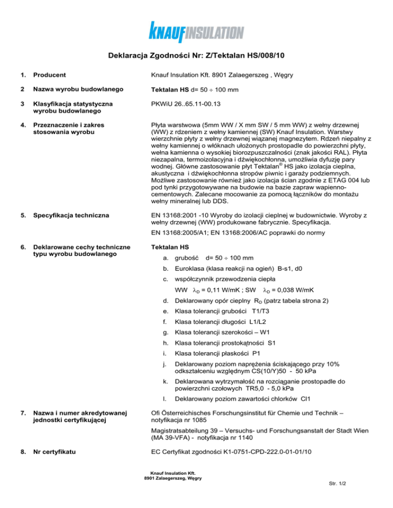 Deklaracja Zgodności Nr: Z/Tektalan HS/008/10 1. Producent Knauf Insulation Kft. 8901 Zalaegerszeg , Węgry 2 Nazwa wyrobu budowlanego Tektalan HS d= 50 ÷ 100 mm 3 Klasyfikacja statystyczna wyrobu budowlanego PKWiU 26..65.11-00.13 4. Przeznaczenie i zakres stosowania wyrobu Płyta warstwowa (5mm WW / X mm SW / 5 mm WW) z wełny drzewnej (WW) z rdzeniem z wełny kamiennej (SW) Knauf Insulation. Warstwy wierzchnie płyty z wełny drzewnej wiązanej magnezytem. Rdzeń niepalny z wełny kamiennej o włóknach ułożonych prostopadle do powierzchni płyty, wełna kamienna o wysokiej biorozpuszczalności (znak jakości RAL). Płyta niezapalna, termoizolacyjna i dźwiękochłonna, umożliwia dyfuzję pary wodnej. Główne zastosowanie płyt Tektalan® HS jako izolacja cieplna, akustyczna i dźwiękochłonna stropów piwnic i garaży podziemnych. Możliwe zastosowanie również jako izolacja ścian zgodnie z ETAG 004 lub pod tynki przygotowywane na budowie na bazie zapraw wapiennocementowych. Zalecane mocowanie za pomocą łączników do montażu wełny mineralnej lub DDS. 5. Specyfikacja techniczna EN 13168:2001 -10 Wyroby do izolacji cieplnej w budownictwie. Wyroby z wełny drzewnej (WW) produkowane fabrycznie. Specyfikacja. EN 13168:2005/A1; EN 13168:2006/AC poprawki do normy 6. Deklarowane cechy techniczne typu wyrobu budowlanego Tektalan HS a. grubość d= 50 ÷ 100 mm b. Euroklasa (klasa reakcji na ogień) B-s1, d0 c. współczynnik przewodzenia ciepła WW λD = 0,11 W/mK ; SW λD = 0,038 W/mK d. Deklarowany opór cieplny RD (patrz tabela strona 2) e. Klasa tolerancji grubości T1/T3 f. Klasa tolerancji długości L1/L2 g. Klasa tolerancji szerokości – W1 h. Klasa tolerancji prostokątności S1 7. Nazwa i numer akredytowanej jednostki certyfikującej i. Klasa tolerancji płaskości P1 j. Deklarowany poziom naprężenia ściskającego przy 10% odkształceniu względnym CS(10/Y)50 - 50 kPa k. Deklarowana wytrzymałość na rozciąganie prostopadle do powierzchni czołowych TR5,0 - 5,0 kPa l. Deklarowany poziom zawartości chlorków Cl1 Ofi Österreichisches Forschungsinstitut für Chemie und Technik – notyfikacja nr 1085 Magistratsabteilung 39 – Versuchs- und Forschungsanstalt der Stadt Wien (MA 39-VFA) - notyfikacja nr 1140 8. Nr certyfikatu EC Certyfikat zgodności K1-0751-CPD-222.0-01-01/10 Knauf Insulation Kft. 8901 Zalaegerszeg, Węgry Str. 1/2 Tektalan HS Długość Szerokość [mm] [mm] 2000 500 2000 500 2000 500 Grubość całkowita [mm] 50 75 100 SW WW RD Grubość Grubość WW [mm] SW [mm] λD [W/mK] λD [W/mK] [m2K/W] 10 50 0,11 0,038 1,41 10 75 0,11 0,038 2,06 10 100 0,11 0,038 2,72 Deklaruję z pełną odpowiedzialnością, że wyrób budowlany jest zgodny ze specyfikacją techniczną wskazaną w pkt.5 Deklaruję, że wyrób spełnia postanowienia załącznika ZA PN-EN 13168. Zalaegerszeg, 02 sierpień 2010r Robert Smalekkert Plant manager Knauf Insulation Kft. 8901 Zalaegerszeg, Węgry Str. 2/2