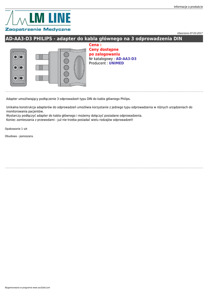 Informacje o produkcie Utworzono 07-03-2017 AD-AA3-D3 PHILIPS - adapter do kabla głównego na 3 odprowadzenia DIN Cena : Ceny dostępne po zalogowaniu Nr katalogowy : AD-AA3-D3 Producent : UNIMED Adapter umożliwiający podłączenie 3 odprowadzeń typu DIN do kabla głównego Philips. Unikalna konstrukcja adapterów do odprowadzeń umożliwia korzystanie z jednego typu odprowadzenia w różnych urządzeniach do monitorowania pacjentów. Wystarczy podłączyć adapter do kabla głównego i możemy dołączyć posiadane odprowadzenia. Koniec zamieszania z przewodami - już nie trzeba posiadać wielu rodzajów odprowadzeń! Opakowanie 1 szt Obudowa - jasnoszara. Wygenerowano w programie www.oscGold.com