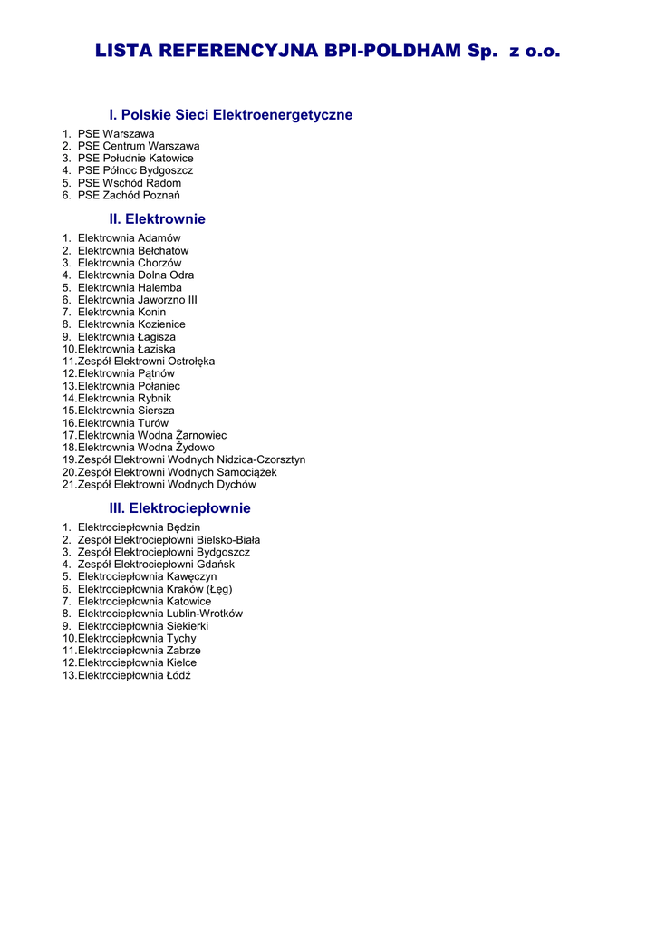 LISTA REFERENCYJNA BPI-POLDHAM Sp. z o.o. I. Polskie Sieci Elektroenergetyczne 1. 2. 3. 4. 5. 6. PSE Warszawa PSE Centrum Warszawa PSE Południe Katowice PSE Północ Bydgoszcz PSE Wschód Radom PSE Zachód Poznań II. Elektrownie 1. Elektrownia Adamów 2. Elektrownia Bełchatów 3. Elektrownia Chorzów 4. Elektrownia Dolna Odra 5. Elektrownia Halemba 6. Elektrownia Jaworzno III 7. Elektrownia Konin 8. Elektrownia Kozienice 9. Elektrownia Łagisza 10. Elektrownia Łaziska 11. Zespół Elektrowni Ostrołęka 12. Elektrownia Pątnów 13. Elektrownia Połaniec 14. Elektrownia Rybnik 15. Elektrownia Siersza 16. Elektrownia Turów 17. Elektrownia Wodna Żarnowiec 18. Elektrownia Wodna Żydowo 19. Zespół Elektrowni Wodnych Nidzica-Czorsztyn 20. Zespół Elektrowni Wodnych Samociążek 21. Zespół Elektrowni Wodnych Dychów III. Elektrociepłownie 1. Elektrociepłownia Będzin 2. Zespół Elektrociepłowni Bielsko-Biała 3. Zespół Elektrociepłowni Bydgoszcz 4. Zespół Elektrociepłowni Gdańsk 5. Elektrociepłownia Kawęczyn 6. Elektrociepłownia Kraków (Łęg) 7. Elektrociepłownia Katowice 8. Elektrociepłownia Lublin-Wrotków 9. Elektrociepłownia Siekierki 10. Elektrociepłownia Tychy 11. Elektrociepłownia Zabrze 12. Elektrociepłownia Kielce 13. Elektrociepłownia Łódź IV. Zakłady Energetyczne 1. ENION S.A. Oddział w Będzinie. Będziński Zakład Elektroenergetyczny 2. Beskidzka Energetyka Bielsko-Biała 3. BUT Poznań 4. ENEA Poznań 5. Zakład Energetyczny Białystok 6. ENEA Operator Sp. z o.o. Rejon Dystrybucji Bydgoszcz 7. ENION Oddział w Częstochowie 8. Zakład Energetyczny Gdańsk 9. Vattenfall Distribution Poland S.A. 10. Vattenfall Network Service Poland Sp. z o.o. 11. Rejon Wysokich Napięć Chorzów 12. ENEA Operator Sp. z o. o. Oddział Dystrybucji Gorzów Wielkopolski 13. EnergiaPro Koncern Energetyczny Oddział w Jeleniej Górze 14. Energetyka Kaliska 15. Zakład Energetyczny Koszalin 16. Zakład Energetyczny Kraków 17. Zakład Energetyczny Legnica 18. Zakład Energetyczny Łódź-Teren 19. ŁZE Dystrybucja Sp. z o.o. 20. Zakład Energetyczny Opole 21. Zakład Energetyczny Płock 22. Zakład Energetyczny w Olsztynie 23. Zakład Energetyczny Słupsk 24. Energetyka Szczecińska S.A. 25. ENION S.A. Oddział w Tarnowie. Zakład Energetyczny Ternów 26. Zakład Energetyczny LUBZEL Dystrybucja 27. Zakład Energetyczny Toruń 28. Zakład Energetyczny Wałbrzych 29. Stołeczny Zakład Energetyczny 30. Zakład Energetyczny Warszawa-Teren 31. ZEORK Skarżysko-Kamienna 32. ENEA Operator Sp. z o.o. Oddział Dystrybucji Zielona Góra 33. Zamojska Korporacja Energetyczna 34. Zakład Energetyczny Wrocław 35. Zakład Energetyczny Rzeszów V. Elbudy i Elektromontaże 1. ABB Elbud Kraków 2. ABB Zamech Warszawa 3. ABB Centrum Wrocław 4. Elbud Gdańsk 5. Elbud Katowice 6. Elbud Poznań 7. Elbud Warszawa 8. Elbud-Impex Warszawa 9. Elcon Szczecin 10. Elektrobudowa Katowice 11. Elektromontaż Bydgoszcz 12. Elektromontaż nr 1 Kraków 13. Elektromontaż Płock 14. Elektromontaż Poznań 15. Elektromontaż Rzeszów 16. Elektromontaż Warszawa 17. Elektromontaż Wrocław 18. Elektromontaż Szczecin 19. Megapol Bydgoszcz 20. PPH Selpol Łódź VI. Telekomunikacja 1. Alcatel-Lucent Polska 2. Cuprum 2000 Lublin 3. Elterix Gdynia 4. Eltek Szczecin 5. Lucent Technologies Poland Bydgoszcz 6. Netia Polska 7. El-Net 8. Dialog Wrocław 9. Telzas Szczecinek 10. PTK Centertel 11. Benning Power Electronics Warszawa 12. Centralny Węzeł Łączności MON Kraków 13. Exatel Warszawa. 14. MNI Telecom VII. Przemysł Hutniczy 1. Huta Bankowa 2. Huta Batory 3. Huta Częstochowa 4. Huta Ferrum 5. Huta Florian 6. Huta Katowice 7. KGHM Polska Miedź 8. KGHM Huta Legia 9. Huta Ostrowiec 10. Huta Stalowa Wola 11. Huta im. Tadeusza Sendzimira 12. Huta Zawiercie 13. Koksownia Zdzieszowice 14. Zakłady Górniczo-Hutnicze w Trzebinii VIII. Przemysł Chemiczny 1. Polski Koncern Naftowy ORLEN 2. Orlen Centrum Serwisowe Wrocław 3. Energomedia Trzebinia 4. LOTOS Gdańsk 5. Zakłady Chemiczne Police 6. Elana Toruń 7. Soda Mątwy 8. Celuloza Świecie 9. Zakłady Chemiczne ANVIL Włocławek 10. Zakłady Chemiczne ZACHEM 11. Zakłady Koksownicze “Zdzieszowice” 12. SGL Carbon Polska Racibórz 13. Zakłady Azotowe Puławy 14. Siarkopol Tarnobrzeg 15. Zakłady Surowców Ogniotrwałych Górka 16. Skolwin Szczecin 17.Janikowskie Zakłady Sodowe “JANIKOSODA” IX. UPS-y 1. EATON (BPS) Warszawa 2. CES Kraków 3. Elektronika-Serwis Warszawa 4. Fast Group Elektroman Warszawa 5. MGE UPS System Warszawa 6. Practiv Szczecin 7. KLK Katowice 8. Delta Power Warszawa 9. P.I.W. Camco Warszawa 10. Silco Gdańsk X. Kopalnie 1. KWK Anna 2. KWK Bogdanka 3. KWK Czeczot 4. KWK Dębińsko 5. KWK Jankowice 6. KWK Jas-Mos 7. KWK Jaworzno 8. KWB Konin 9. KWB Turów 10. Jastrzębska Spółka Węglowa KWK “Krupiński” 11. KWK Kazimierz Juliusz 12. KWK Makoszowy 13. KWK Marcel 14. KWK Morcinek 15. KWK Murcki 16. KWK Pniówek 17. KWK Rymer 18. KWK Szczygłowice 19. KWK Wesoła 20. KWK Ziemowit 21. KGHM Rudna 22. KGHM Polska Miedź 23. Jastrzębska Spółka Węglowa 24. Kompania Węglowa XI. Przemysł Spożywczy 1. 2. 3. 4. 5. 6. Cukrownia Kruszwica Cukrownia Wożuczyn Fabryka Cukru w Tuczynie Polskie Zakłady Zbożowe w Krakowie Zakłady Przem. Tłuszczowego Kruszwica Zakłady Przemysłu Tłuszczowego Warszawa 7. Zakłady Produkcji Lodów EKKO Szczecin XII. Szpitale 1. Szpital w Hajnówce 2. Miedziowe Centrum Zdrowia Lubin 3. Szpital w Grudziądzu 4. Szpital w Poznaniu 5. Szpital Specjalny im. Łukowicza w Chojnicach 6. Szpital Wojewódzki Nr 2 w Rzeszowie 7. Szpital w Lesznie 8. Szpital wojskowy Szaserów Warszawa 9. Szpital Banacha Warszawa 10. Szpital w Radomiu 11. Szpital w Krakowie 12. Szpital w Łodzi 13. Szpital w Świdnicy XIII. Polskie Koleje Państwowe 1. ZEK Kraków 2. Thales Rail Signalling Solutions Poznań 3. PKP Energetyka Warszawa 4. PKP Energetyka Zakład Łódzki 5. PKP Energetyka Zakład Północny 6. PKP Energetyka