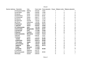 Arkusz3 Numer startowy Nazwisko 37 Wojciechowska 33 Zarudzka 35 Idasiak 32 Ziarkiewicz 31 Andraczek 30 Zaleśny 34 Ogierman 36 Czmok 24 Plaskura 21 Bączek 26 Tustanowska 25 Schneider 23 Drobczyk 20 Bartoń 22 Boniakowska 12 Buzek 13 Masłyk 1 Golda 6 Szklarska 7 Zarudzka 4 Porosińska 3 Majerek 2 Hałat 5 Przytuła 41 Szklarski 40 Kucharzewski 39 Dróżdż Imię Malina Maja Zosia Zuzia Hania Beata Kamila Katarzyna Hania Hania Asia Małgorzata Pola Paulina Michalina Hania Hania Basia Hania Agata Ala Maja Marysia Anna Mateusz Mateusz Daniel Czas narty 0:43:04 0:48:65 0:49:25 0:54:04 0:58:17 0:59:15 1:02:03 1:02:95 0:46:69 0:55:67 1:01:25 1:08:29 1:12:96 1:15:39 1:15:63 0:50:97 1:12:10 0:58:57 0:59:75 1:00:38 1:04:27 1:06:21 1:14:49 1:15:29 0:57:27 0:59:00 0:59:43 Czas pływanie Grupa Miejsce narty Miejsce pływanie 13:81 1 1 1 14:68 1 2 3 14:15 1 3 2 20:97 1 4 8 17:75 1 5 6 15:78 1 6 4 17:00 1 7 5 20:68 1 8 7 18:12 2 1 2 18:02 2 2 1 19:44 2 3 5 24:51 2 4 6 19:40 2 5 4 33:19 2 6 7 19:18 2 7 3 15:37 3 1 1 47:03 3 2 2 26:90 4 1 2 26:60 4 2 1 31:60 4 3 4 56:00 4 4 6 30:12 4 5 3 4 6 -45:26 4 7 5 5 1 -20:63 5 2 3 5 3 -Strona 3 Arkusz3 42 Skalski 38 Szota 28 Wiśniowski 27 Faltus 29 Wojna 17 Siut 15 Dróżdż 16 Idasiak 14 Capik 18 Trzaska 19 Włostowski 9 Wojciechowski 11 Murzyński 8 Jazowy 10 Szafarz Kacper Daniel Kacper Adam Michał Maciej Mateusz Jan Emil Jan Kuba Kosma Filip Olek Maks 1:03:34 1:07:76 0:52:96 0:55:51 1:06:09 0:51:15 0:53:31 0:55:33 0:56:43 0:59:03 1:11:51 1:00:18 1:04:01 1:05:44 1:09:16 17:40 20:42 20:97 22:42 21:93 39:67 28:81 19:50 23:11 34:67 41:68 43:37 36:40 37:46 Strona 4 5 5 6 6 6 7 7 7 7 7 7 8 8 8 8 4 5 1 2 3 1 2 3 4 5 6 1 2 3 4 1 2 -1 2 2 6 4 1 3 5 3 4 1 2