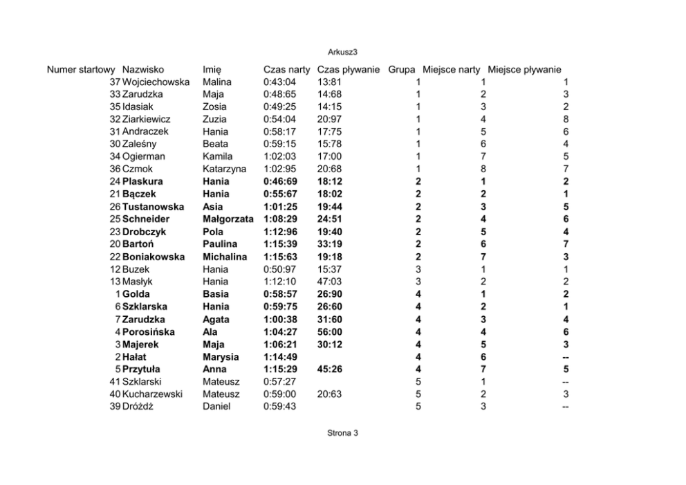 Numer startowy Nazwisko Imię Czas narty Czas pływanie