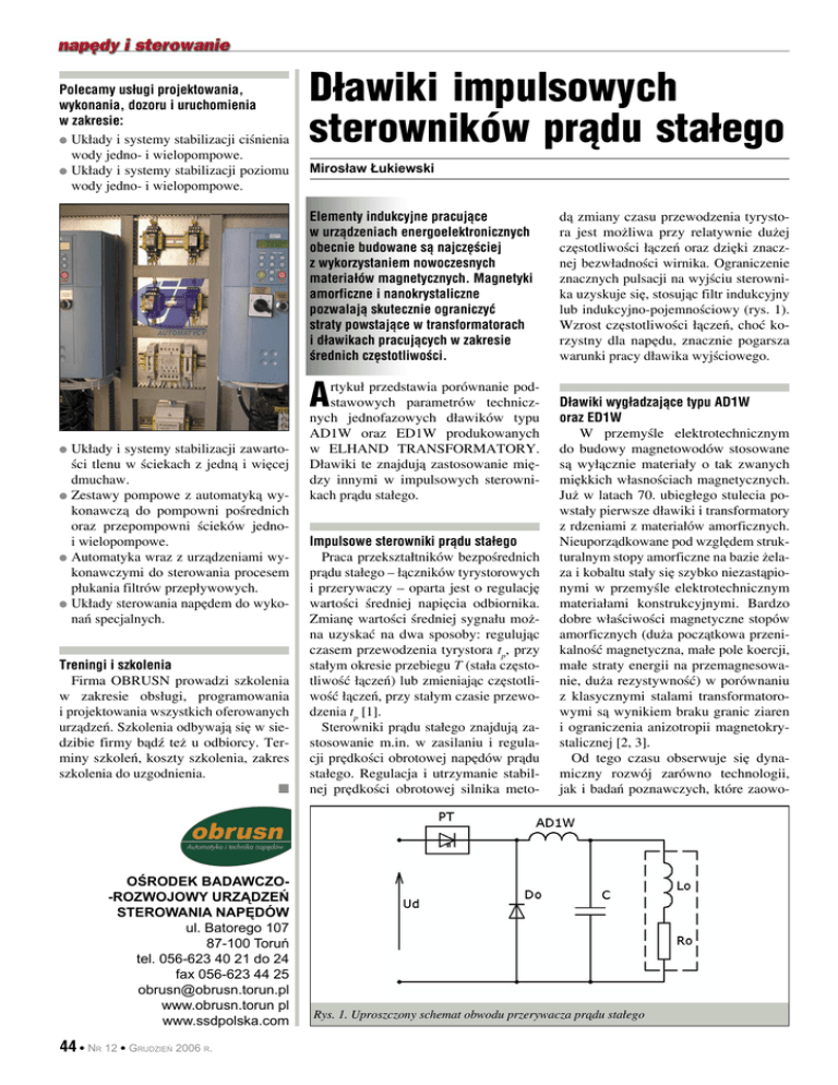 Polecamy usługi projektowania, wykonania, dozoru i uruchomienia w zakresie: Układy i systemy stabilizacji ciśnienia wody jedno- i wielopompowe. Układy i systemy stabilizacji poziomu wody jedno- i wielopompowe. Dławiki impulsowych sterowników prądu stałego Mirosław Łukiewski Elementy indukcyjne pracujące w urządzeniach energoelektronicznych obecnie budowane są najczęściej z wykorzystaniem nowoczesnych materiałów magnetycznych. Magnetyki amorficzne i nanokrystaliczne pozwalają skutecznie ograniczyć straty powstające w transformatorach i dławikach pracujących w zakresie średnich częstotliwości. A Układy i systemy stabilizacji zawartości tlenu w ściekach z jedną i więcej dmuchaw. Zestawy pompowe z automatyką wykonawczą do pompowni pośrednich oraz przepompowni ścieków jednoi wielopompowe. Automatyka wraz z urządzeniami wykonawczymi do sterowania procesem płukania filtrów przepływowych. Układy sterowania napędem do wykonań specjalnych. Treningi i szkolenia Firma OBRUSN prowadzi szkolenia w zakresie obsługi, programowania i projektowania wszystkich oferowanych urządzeń. Szkolenia odbywają się w siedzibie firmy bądź też u odbiorcy. Terminy szkoleń, koszty szkolenia, zakres szkolenia do uzgodnienia. OŚRODEK BADAWCZO-ROZWOJOWY URZĄDZEŃ STEROWANIA NAPĘDÓW ul. Batorego 107 87-100 Toruń tel. 056-623 40 21 do 24 fax 056-623 44 25 [email protected] www.obrusn.torun pl www.ssdpolska.com 44 NR 12 GRUDZIEŃ 2006 R. rtykuł przedstawia porównanie podstawowych parametrów technicznych jednofazowych dławików typu AD1W oraz ED1W produkowanych w ELHAND TRANSFORMATORY. Dławiki te znajdują zastosowanie między innymi w impulsowych sterownikach prądu stałego. Impulsowe sterowniki prądu stałego Praca przekształtników bezpośrednich prądu stałego – łączników tyrystorowych i przerywaczy – oparta jest o regulację wartości średniej napięcia odbiornika. Zmianę wartości średniej sygnału można uzyskać na dwa sposoby: regulując czasem przewodzenia tyrystora tp, przy stałym okresie przebiegu T (stała częstotliwość łączeń) lub zmieniając częstotliwość łączeń, przy stałym czasie przewodzenia tp [1]. Sterowniki prądu stałego znajdują zastosowanie m.in. w zasilaniu i regulacji prędkości obrotowej napędów prądu stałego. Regulacja i utrzymanie stabilnej prędkości obrotowej silnika meto- dą zmiany czasu przewodzenia tyrystora jest możliwa przy relatywnie dużej częstotliwości łączeń oraz dzięki znacznej bezwładności wirnika. Ograniczenie znacznych pulsacji na wyjściu sterownika uzyskuje się, stosując filtr indukcyjny lub indukcyjno-pojemnościowy (rys. 1). Wzrost częstotliwości łączeń, choć korzystny dla napędu, znacznie pogarsza warunki pracy dławika wyjściowego. Dławiki wygładzające typu AD1W oraz ED1W W przemyśle elektrotechnicznym do budowy magnetowodów stosowane są wyłącznie materiały o tak zwanych miękkich własnościach magnetycznych. Już w latach 70. ubiegłego stulecia powstały pierwsze dławiki i transformatory z rdzeniami z materiałów amorficznych. Nieuporządkowane pod względem strukturalnym stopy amorficzne na bazie żelaza i kobaltu stały się szybko niezastąpionymi w przemyśle elektrotechnicznym materiałami konstrukcyjnymi. Bardzo dobre właściwości magnetyczne stopów amorficznych (duża początkowa przenikalność magnetyczna, małe pole koercji, małe straty energii na przemagnesowanie, duża rezystywność) w porównaniu z klasycznymi stalami transformatorowymi są wynikiem braku granic ziaren i ograniczenia anizotropii magnetokrystalicznej [2, 3]. Od tego czasu obserwuje się dynamiczny rozwój zarówno technologii, jak i badań poznawczych, które zaowo- Rys. 1. Uproszczony schemat obwodu przerywacza prądu stałego Własności materiału Stop amorficzny Anizotropowa blacha transformatorowa METGLAS 2605SA1 M089-27N Grubość blach 25 μm 270 μm Indukcja nasycenia 1,56 T Stratność p = 6,5 x f Rezystywność 137 μΩ cm 48 μΩ cm Magnetostrykcja nasycenia 27 x 10-6 ~ 1 x 10-6 Temperatura Curie 415ºC 746ºC reklama Tabela 1. Parametry techniczne materiałów magnetycznych używanych do budowy rdzeni dławików typu AD1W oraz ED1W [3, 4, 5] 1,77 T 1,51 xB 1,74 cowały powstaniem nowoczesnej grupy materiałów nanokrystalicznych. Postęp technologii otrzymywania materiałów amorficznych i nanokrystalicznych oraz wzrost ich dostępności na rynku pozwala obecnie zastępować klasyczne stale transformatorowe nowoczesnymi niskostratnymi magnetykami. Porównanie parametrów technicznych materiału amorficznego i stali transformatorowej przedstawiono w tabeli 1. Rdzenie amorficzne POWERLITE C-Cores (rys. 2) zwijane są z cienkich taśm amorficznych o grubości 25 mm i relatywnie dużej rezystywności (tabela 1), co doskonale ogranicza intensywność przepływu prądów wirowych. W tradycyjnych blachach transformatorowych przepływ prądów wirowych wywołuje poważne straty dodatkowe. W celu ograniczenia strat na prądy wirowe występujące w rdzeniu pod wpływem indukowanego napięcia rdzenie pakietuje się z blach. Pakietowane blachy dodatkowo zabezpiecza się powłoką elektroizolacyjną, aby uniknąć przepływu prądów wirowych poprzecznie pomiędzy blachami. Rdzeń wykonany z klasycznej stali transformatorowej przedstawiono na rys. 3. Przycięte zgodnie z kierunkiem walcowania odcinki blachy transformatorowej pakietuje się, tworząc rdzeń składający się z jarzm i kolumn. Szcze- [W/kg] p = 1,4 [W/kg] dla 1,7 T 50 Hz lina powietrzna w rdzeniu umożliwia dopasowanie indukcyjności oraz punktu pracy dławika na charakterystyce magnesowania. Przy znacznych stratach w rdzeniu projektuje się kilka szczelin powietrznych rozłożonych na całej wysokości kolumn. Uzyskuje się w ten sposób równomierny rozkład wartości indukcji w kolumnach oraz proporcjonalny rozkład strat. Ponadto korzystne jest ograniczenie szerokości szczelin. W pobliżu szczelin