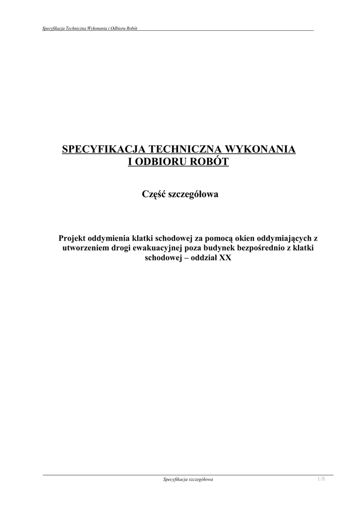 Specyfikacja Techniczna Wykonania i Odbioru Robót SPECYFIKACJA TECHNICZNA WYKONANIA I ODBIORU ROBÓT Część szczegółowa Projekt oddymienia klatki schodowej za pomocą okien oddymiających z utworzeniem drogi ewakuacyjnej poza budynek bezpośrednio z klatki schodowej – oddział XX Specyfikacja szczegółowa 1/8 Specyfikacja Techniczna Wykonania i Odbioru Robót SPIS TREŚCI 1. WSTĘP 1.1. Przedmiot SST 1.2. Zakres stosowania SST 1.3. Zakres robót objętych SST 1.4. Określenia podstawowe 2. 1.5. Ogólne wymagania dotyczące robót MATERIAŁY 2.1. Centralka 2.2. Przycisk ręcznego oddymiania 2.3. Siłowniki okien oddymiających 3. 4. 2.4. Okablowanie SPRZĘT TRANSPORT I SKŁADOWANIE ELEMENTÓW 5. WYKONANIE ROBÓT 6. 7. WYMAGANIA SZCZEGÓŁOWE KONTROLA JAKOŚCI 7.2. Instalacja oddymiania 7.3. Roboty podlegają odbiorowi 8. ODBIÓR ROBÓT 9. PODSTAWA PŁATNOŚCI 9.1. Instalacja oddymiania 10. PRZEPISY ZWIĄZANE Specyfikacja szczegółowa 2/8 Specyfikacja Techniczna Wykonania i Odbioru Robót 1. WSTĘP 1.1. Przedmiot SST Przedmiotem niniejszej szczegółowej specyfikacji technicznej są wymagania dotyczące wykonania i odbioru robót związanych z wykonaniem instalacji elektrycznego oddymiania klatki schodowej za pomocą okien oddymiających z opcją przewietrzania i czujnikiem pogodowym dla Pawilonu XX Szpitala dla Nerwowo i Psychicznie chorych w Rybniku. 1.2. Zakres stosowania SST Szczegółowa specyfikacja techniczna jest stosowana jako dokument przetargowy i kontraktowy przy zlecaniu i realizacji robót wymienionych w pkt. 1.1. 1.3. Zakres robót objętych SST W ramach realizacji zadania, których dotyczy specyfikacja, należy wytyczyć trasy okablowania, zamontować niezbędne urządzenia oraz określić sposób funkcjonowania systemu elektrycznego oddymiania budynku Pawilonu XX Szpitala. W ramach wykonania instalacji oddymiania należy: - wykonać trasy kablowe; - zamontować centralkę oddymiania; - zamontować siłowniki okien oddymiających; - zamontować przyciski ręcznego uruchomienia instalacji oddymiania, oraz czujniki automatycznie uruchamiające system elektrycznego oddymiania, przewietrzania z czujnikiem pogodowym; 1.4. Określenia podstawowe Określenia podane w niniejszej SST są zgodne z odpowiednimi normami. 1.5. Ogólne wymagania dotyczące robót Wykonawca robót jest odpowiedzialny za jakość ich wykonania oraz za zgodność z dokumentacją SST i poleceniami Inspektora Nadzoru. 2. MATERIAŁY 2.1. Centralka Centralka oddymiania wykonana jest w postaci szafki ściennej. Centralka ta jest zasilana napięciem 230V/50Hz. Napięcie robocze to 24V napięcia stałego na wyjściach, do których podłączone są urządzenia elektrycznego systemu sterowania oddymianiem. Jest ona wyposażona w akumulatory pozwalające na pracę układu w ciągu 72 godzin po zaniku napięcia podstawowego. Centralka umożliwia: - ręczne wyzwalanie alarmu z przycisków alarmowych, - automatyczne wyzwalanie alarmu z czujek dymowych, - przekazywanie informacji o alarmie (sygnał NO/NC), - przekazywanie informacji o uszkodzeniu systemu (sygnał NO/NC), - ręczne otwieranie okien oddymiających w celu wentylacji obiektu w czasie normalnej Specyfikacja szczegółowa 3/8 Specyfikacja Techniczna Wykonania i Odbioru Robót eksploatacji bez wywołania stanu alarmowego (przewietrzanie), automatyczne zamkniecie okien oddymiających otwartych do wentylacji w przypadku opadów deszczu lub silnego wiatru (zastosowanie centralki pogodowej z czujnikiem wiatru i deszczu). Centrala posiada optyczną sygnalizację stanu jej pracy, powtórzona w przyciskach alarmowych co w łatwy sposób pozwala stwierdzić stan alarmu lub uszkodzenia systemu. Maksymalny pobór prądu przez siłowniki podłączone do centralki nie może przekroczyć prądu dopuszczalnego pobieranego przez siłownik do niej podłączony. Centralę należy ze względów użytkowych i serwisowych zamontować na wysokości ok. 1,40m od podłogi (dolna krawędź). Należy zwrócić uwagę Użytkownikowi na czasookres wymiany akumulatorów (zgodnie ze wskazaniami podanymi przez producenta zastosowanych akumulatorów). 2.2. Przycisk ręcznego oddymiania Ręczne uruchamianie oddymiania będzie możliwe poprzez zbicie szybki i wciśnięcie przycisków systemu oddymiania zlokalizowanych na klatce schodowej. Przyciski wykonać w wersji natynkowej. 2.3. Siłowniki okien oddymiających Siłowniki okien oddymiających Pawilonu XX należy wykonać zgodnie z przepisami i w oparciu o obwiązujące normy. 2.4. Okablowanie Wszystkie prace instalacyjne powinny być wykonane wg zaleceń i obowiązujących norm dotyczących danej instalacji. Założenie podstawowe to wykonanie całości okablowania w korytach metalowych lub pod tynkiem w rurkach typu peszel. Dopuszcza się montaż kabli pod tynkiem, jednak z wyjątkiem odcinków na styku (skrzyżowania i zbliżenia) z innymi instalacjami (zastosować odcinki rurek lub inne przekładki izolacyjne) oraz w przejściach przez stropy (zastosować rurki). Po wciągnięciu kabli przepusty rurowe, należy uszczelnić przy użyciu certyfikowanych mas ppoż. Inne zasady, które powinny być przestrzegane przy układaniu kabli : - nie wykonywać żadnych połączeń przewodów dodatkowych, - po ułożeniu kabli i zaprawieniu bruzd należy wykonać pomiary kontrolne (rezystancja linii, rezystancja izolacji między żyłami linii, pojemność przewodów linii itp.). Protokoły z pomiarów powinny być przekazane firmie specjalistycznej, która wykona montaż urządzeń. - w miejscach montażu elementów należy pozostawić odpowiednie zapasy przewodów : - czujki i ostrzegacze ręczne : 2x 20 cm (nie rozcięte pętle) - centralki min. 50-100 cm Należy koordynować przebieg tras kabli systemów sterowania oddymianiem oraz innych instalacji i zachować następujące minimalne odstępy: - 20 cm od przewodów energetycznych przy braku przegrody - 5 cm od przewodów energetycznych zastosowaniu przegrody stalowej Specyfikacja szczeg