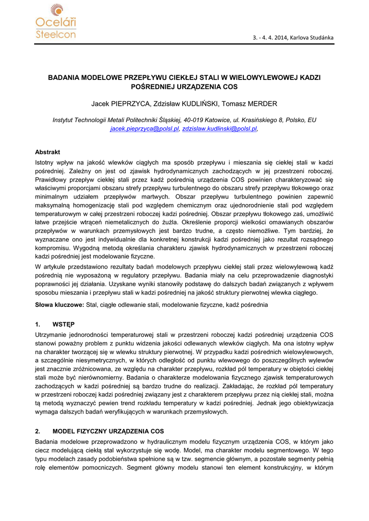 3. - 4. 4. 2014, Karlova Studánka BADANIA MODELOWE PRZEPŁYWU CIEKŁEJ STALI W WIELOWYLEWOWEJ KADZI POŚREDNIEJ URZĄDZENIA COS Jacek PIEPRZYCA, Zdzisław KUDLIŃSKI, Tomasz MERDER Instytut Technologii Metali Politechniki Śląskiej, 40-019 Katowice, ul. Krasińskiego 8, Polsko, EU [email protected], [email protected], Abstrakt Istotny wpływ na jakość wlewków ciągłych ma sposób przepływu i mieszania się ciekłej stali w kadzi pośredniej. Zależny on jest od zjawisk hydrodynamicznych zachodzących w jej przestrzeni roboczej. Prawidłowy przepływ ciekłej stali przez kadź pośrednią urządzenia COS powinien charakteryzować się właściwymi proporcjami obszaru strefy przepływu turbulentnego do obszaru strefy przepływu tłokowego oraz minimalnym udziałem przepływów martwych. Obszar przepływu turbulentnego powinien zapewnić maksymalną homogenizację stali pod względem chemicznym oraz ujednorodnienie stali pod względem temperaturowym w całej przestrzeni roboczej kadzi pośredniej. Obszar przepływu tłokowego zaś, umożliwić łatwe przejście wtrąceń niemetalicznych do żużla. Określenie proporcji wielkości omawianych obszarów przepływów w warunkach przemysłowych jest bardzo trudne, a często niemożliwe. Tym bardziej, że wyznaczane ono jest indywidualnie dla konkretnej konstrukcji kadzi pośredniej jako rezultat rozsądnego kompromisu. Wygodną metodą określania charakteru zjawisk hydrodynamicznych w przestrzeni roboczej kadzi pośredniej jest modelowanie fizyczne. W artykule przedstawiono rezultaty badań modelowych przepływu ciekłej stali przez wielowylewową kadź pośrednią nie wyposażoną w regulatory przepływu. Badania miały na celu przeprowadzenie diagnostyki poprawności jej działania. Uzyskane wyniki stanowiły podstawę do dalszych badań związanych z wpływem sposobu mieszania i przepływu stali w kadzi pośredniej na jakość struktury pierwotnej wlewka ciągłego. Słowa kluczowe: Stal, ciągłe odlewanie stali, modelowanie fizyczne, kadź pośrednia 1. WSTĘP Utrzymanie jednorodności temperaturowej stali w przestrzeni roboczej kadzi pośredniej urządzenia COS stanowi poważny problem z punktu widzenia jakości odlewanych wlewków ciągłych. Ma ona istotny wpływ na charakter tworzącej się w wlewku struktury pierwotnej. W przypadku kadzi pośrednich wielowylewowych, a szczególnie niesymetrycznych, w których odległość od punktu wlewowego do poszczególnych wylewów jest znacznie zróżnicowana, ze względu na charakter przepływu, rozkład pól temperatury w obiętości ciekłej stali może być nierównomierny. Badania o charakterze modelowania fizycznego zjawisk temperaturowych zachodzących w kadzi pośredniej są bardzo trudne do realizacji. Zakładając, że rozkład pól temperatury w przestrzeni roboczej kadzi pośredniej związany jest z charakterem przepływu przez nią ciekłej stali, można tą metodą wyznaczyć pewien trend rozkładu temperatury w kadzi pośredniej. Jednak jego obiektywizacja wymaga dalszych badań weryfikujących w warunkach przemysłowych. 2. MODEL FIZYCZNY URZĄDZENIA COS Badania modelowe przeprowadzono w hydraulicznym modelu fizycznym urządzenia COS, w którym jako ciecz modelującą ciekłą stal wykorzystuje się wodę. Model, ma charakter modelu segmentowego. W tego typu modelach zasady podobieństwa spełnione są w tzw. segmencie głównym, a pozostałe segmenty pełnią rolę elementów pomocniczych. Segment główny modelu stanowi ten element konstrukcyjny, w którym 3. - 4. 4. 2014, Karlova Studánka zachodzą zjawiska istotne z punktu widzenia oczekiwanych rezultatów eksperymentu. W przypadku opisywanego modelu segmentem głównym jest model kadzi pośredniej, a pozostałe elementy konstrukcyjne (modele kadzi głównych, instalacja hydrauliczna) pełnią rolę segmentów pomocniczych. Rys. 1 przedstawia widok modelu fizycznego urządzenia COS natomiast rys. 2 schemat zainstalowanej aparatury kontrolno pomiarowej. Dominującym kryterium podobieństwa modelu do urządzenia przemysłowego jest liczba Froude`a (Fr). Rys.1 Widok modelu fizycznego urządzenia COS Pracujące w warunkach przemysłowych urządzenie do ciągłego odlewania stali wyposażone w niesymetryczną 3. wylewową kadź pośrednią przeznaczone jest do odlewania stali uspokojonej, wytapianej w elektrycznym piecu łukowym i poddanej obróbce pozapiecowej w piecokadzi, Do budowy modelu fizycznego tego urządzenia jako skalę liniową przyjęto skalę pomniejszającą SL = 1 : 2 = 0,5. Obliczeń skal prędkości przepływu cieczy modelowej oraz czasu przepływu (SQ i St) dokonano przyjmując, że w warunkach rzeczywistych przekrój poprzeczny odlewanych wlewków ciągłych wynosi 140 x 140 mm, przy prędkości odlewania vodl = 2 m · min-1 = 0,03 m · s-1. Model fizyczny urządzenia do ciągłego odlewania stali przeznaczony jest do badań o charakterze wizualizacji oraz dzięki zainstalowanej aparaturze pomiarowej umożliwia wyznaczanie krzywych retencji RTD [1,2,3]. Do wykreślenia krzywych retencji RTD na podstawie uzyskanych pomiarów na modelu opracowano program komputerowy oparty na platformie pakietu Matlab. Dla sformułowania matematycznego opisu Rys.2 Schemat modelu urządzenia COS wyników badań posłużono się funkcjami przejścia (transmitancja operatorowa) modeli obiektów regulacji w postaci liniowych elementów automatyki [4,5,6]. Przebieg badanego procesu można przedstawić w dziedzinie operatorowej funkcją przejścia odpowiadającą elementowi inercyjnemu I rzędu: Gs k 1 sT0 (1) Mając na uwadze oddalenie otworów wylewowych z kadzi pośredniej do krystalizatora od punktu wprowadzania stali, należy uwzględnić w opisie matematycznym element opóźniający: Gs ke s (2) 3. - 4. 4. 2014, Karlova Studánka Uzyskane na podstawie badań modelowych charakterystyki czasowe pozwalają na przyjęcie założenia, że modelem opisującym dynamikę mieszania się cieczy w kadzi pośredniej jest układ inerc
