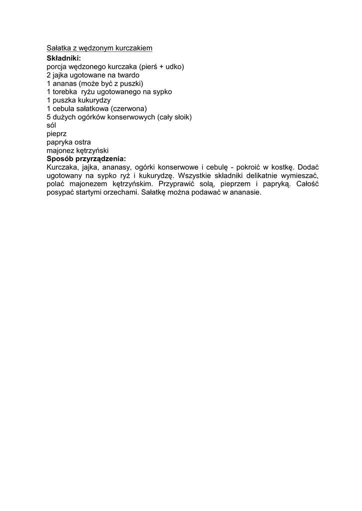 Sałatka z wędzonym kurczakiem Składniki: porcja wędzonego kurczaka (pierś + udko) 2 jajka ugotowane na twardo 1 ananas (może być z puszki) 1 torebka ryżu ugotowanego na sypko 1 puszka kukurydzy 1 cebula sałatkowa (czerwona) 5 dużych ogórków konserwowych (cały słoik) sól pieprz papryka ostra majonez kętrzyński Sposób przyrządzenia: Kurczaka, jajka, ananasy, ogórki konserwowe i cebulę - pokroić w kostkę. Dodać ugotowany na sypko ryż i kukurydzę. Wszystkie składniki delikatnie wymieszać, polać majonezem kętrzyńskim. Przyprawić solą, pieprzem i papryką. Całość posypać startymi orzechami. Sałatkę można podawać w ananasie.