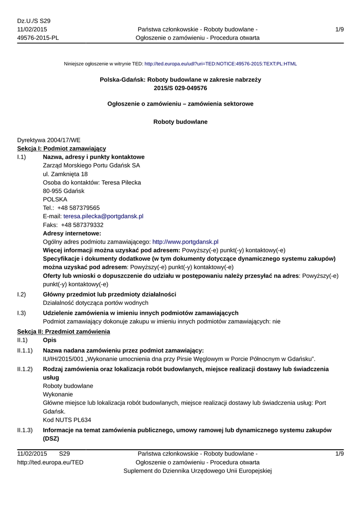 Dz.U./S S29 11/02/2015 49576-2015-PL Państwa członkowskie - Roboty budowlane Ogłoszenie o zamówieniu - Procedura otwarta 1/9 Niniejsze ogłoszenie w witrynie TED: http://ted.europa.eu/udl?uri=TED:NOTICE:49576-2015:TEXT:PL:HTML Polska-Gdańsk: Roboty budowlane w zakresie nabrzeży 2015/S 029-049576 Ogłoszenie o zamówieniu – zamówienia sektorowe Roboty budowlane Dyrektywa 2004/17/WE Sekcja I: Podmiot zamawiający I.1) Nazwa, adresy i punkty kontaktowe Zarząd Morskiego Portu Gdańsk SA ul. Zamknięta 18 Osoba do kontaktów: Teresa Pilecka 80-955 Gdańsk POLSKA Tel.: +48 587379565 E-mail: [email protected] Faks: +48 587379332 Adresy internetowe: Ogólny adres podmiotu zamawiającego: http://www.portgdansk.pl Więcej informacji można uzyskać pod adresem: Powyższy(-e) punkt(-y) kontaktowy(-e) Specyfikacje i dokumenty dodatkowe (w tym dokumenty dotyczące dynamicznego systemu zakupów) można uzyskać pod adresem: Powyższy(-e) punkt(-y) kontaktowy(-e) Oferty lub wnioski o dopuszczenie do udziału w postępowaniu należy przesyłać na adres: Powyższy(-e) punkt(-y) kontaktowy(-e) I.2) Główny przedmiot lub przedmioty działalności Działalność dotycząca portów wodnych I.3) Udzielenie zamówienia w imieniu innych podmiotów zamawiających Podmiot zamawiający dokonuje zakupu w imieniu innych podmiotów zamawiających: nie Sekcja II: Przedmiot zamówienia II.1) Opis II.1.1) Nazwa nadana zamówieniu przez podmiot zamawiający: IU/IH/2015/001 „Wykonanie umocnienia dna przy Pirsie Węglowym w Porcie Północnym w Gdańsku”. II.1.2) Rodzaj zamówienia oraz lokalizacja robót budowlanych, miejsce realizacji dostawy lub świadczenia usług Roboty budowlane Wykonanie Główne miejsce lub lokalizacja robót budowlanych, miejsce realizacji dostawy lub świadczenia usług: Port Gdańsk. Kod NUTS PL634 II.1.3) Informacje na temat zamówienia publicznego, umowy ramowej lub dynamicznego systemu zakupów (DSZ) 11/02/2015 S29 http://ted.europa.eu/TED Państwa członkowskie - Roboty budowlane Ogłoszenie o zamówieniu - Procedura otwarta Suplement do Dziennika Urzędowego Unii Europejskiej 1/9 Dz.U./S S29 11/02/2015 49576-2015-PL Państwa członkowskie - Roboty budowlane Ogłoszenie o zamówieniu - Procedura otwarta 2/9 Ogłoszenie dotyczy zamówienia publicznego II.1.4) Informacje na temat umowy ramowej II.1.5) Krótki opis zamówienia lub zakupu: Przedmiotem zamówienia jest wykonanie w 3 etapach trwałego umocnienia dna na akwenie o łącznej powierzchni 23 800 m² przy Pirsie Węglowym w Porcie Północnym. Zakres etapów: — etap I: 13 550 m², — etap II: 8 350 m², — etap III: 1 900 m². Zakres prac obejmuje: — roboty czerpalne dna i uformowanie spadków, — roboty zasypowe wraz z wyrównaniem dna i uformowaniem spadków, — oznakowanie nawigacyjne na czas wykonywania prac, — wykonanie umocnienia dna: ułożenie geowłókniny, wykonanie narzutu z kamienia wraz z wyrównaniem i jego sklamrowanie zaprawą, wykonanie wzmocnienia krawędzi umocnienia, — wykonanie atestów czystości dna i hydrograficznych sondaży autoryzowanych w skali 1:1000. II.1.6) Wspólny Słownik Zamówień (CPV) 45241500, 45244000 II.1.7) Informacje na temat Porozumienia w sprawie zamówień rządowych (GPA) Zamówienie jest objęte Porozumieniem w sprawie zamówień rządowych (GPA): nie II.1.8) Informacje o częściach zamówienia To zamówienie podzielone jest na części: nie II.1.9) Informacje o ofertach wariantowych Dopuszcza się składanie ofert wariantowych: nie II.2) Wielkość lub zakres zamówienia II.2.1) Całkowita wielkość lub zakres: Niniejsze postępowanie prowadzone jest w trybie przetargu nieograniczonego dla robót budowlanych o wartości szacunkowej nie przekraczającej kwoty 5 186 000 EUR, na warunkach ustawy z 29.1.2004 – Prawo zamówień publicznych (tekst jednolity Dz.U. z 2014 r., poz. 1232 z późn. zm.) zwanej dalej Ustawą. Wartość szacunkowa niniejszej części zamówienia nie przekracza 5 186 000 EUR. II.2.2) Informacje o opcjach Opcje: nie II.2.3) Informacje o wznowieniach Jest to zamówienie podlegające wznowieniu: nie II.3) Czas trwania zamówienia lub termin realizacji Rozpoczęcie 21.5.2015 Zakończenie 30.11.2016 Sekcja III: Informacje o charakterze prawnym, ekonomicznym, finansowym i technicznym III.1) Warunki dotyczące zamówienia III.1.1) Wymagane wadia i gwarancje: 1. Wykonawca jest zobowiązany do wniesienia wadium. Wysokość wadium wynosi 300 000 PLN (słownie złotych: trzysta tysięcy złotych 00/100). 2. Wadium w zależności od wyboru Wykonawcy (zgodnie z art. 45 ust. 6 ustawy), może być wniesione w jednej lub kilku następujących formach: 11/02/2015 S29 http://ted.europa.eu/TED Państwa członkowskie - Roboty budowlane Ogłoszenie o zamówieniu - Procedura otwarta Suplement do Dziennika Urzędowego Unii Europejskiej 2/9 Dz.U./S S29 11/02/2015 49576-2015-PL Państwa członkowskie - Roboty budowlane Ogłoszenie o zamówieniu - Procedura otwarta 3/9 1) pieniądzu; 2) poręczeniach bankowych lub poręczeniach spółdzielczej kasy oszczędnościowo-kredytowej, z tym że poręczenie kasy jest zawsze poręczeniem pieniężnym; 3) gwarancjach bankowych; 4) gwarancjach ubezpieczeniowych; 5) poręczeniach udzielanych przez podmioty, o których mowa w art. 6b ust. 5 pkt 2 ustawy z 9.11.2000 o utworzeniu Polskiej Agencji Rozwoju Przedsiębiorczości (Dz.U. z 2007 r. nr 42, poz. 275, z 2008 r. nr 116, poz. 730 i 732 i nr 227, poz. 1505 oraz z 2010 r. nr 96, poz. 620). 3. Wadium, wniesione w pieniądzu należy wpłacić przelewem na rachunek bankowy: Bank BPH S.A nr: 10 1060 0076 0000 3310 0019 9583 z dopiskiem na przelewie w rubryce „Tytułem”: Nr IU/IH/2014/078 Przebudowa odcinków III-3, III-4, III-5 i III-6 Nabrzeża Przemysłowego w Porcie Gdańsk w systemie „zaprojektuj i wybuduj”. 4. Jeśli wadium (w formie pieniężnej) nie znajdzie się na wskazanym rachunku do upływu terminu składania ofert – Zamawiający uzna, iż oferta nie zosta