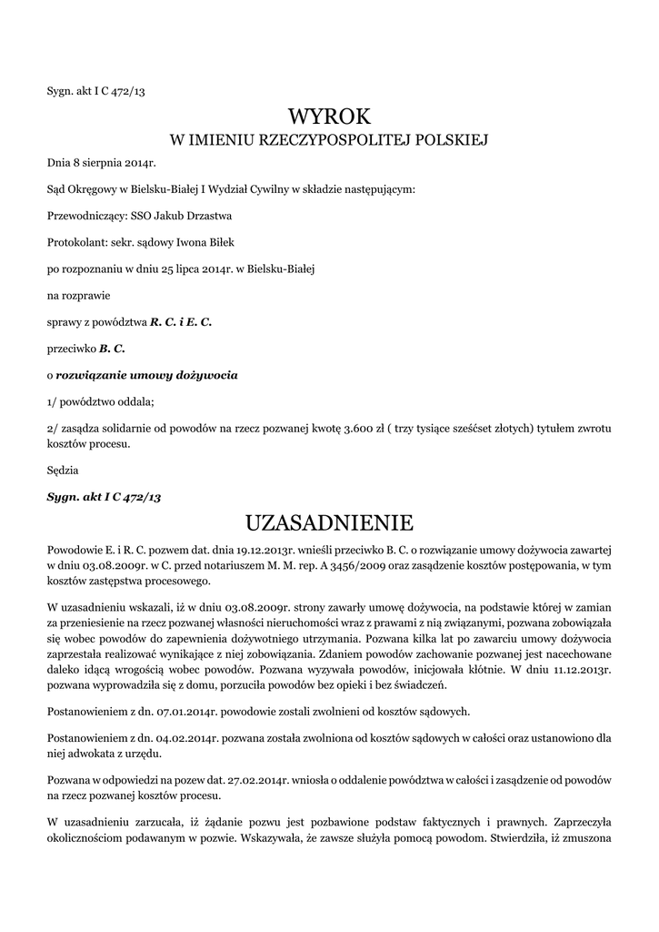 Sygn. akt I C 472/13 WYROK W IMIENIU RZECZYPOSPOLITEJ POLSKIEJ Dnia 8 sierpnia 2014r. Sąd Okręgowy w Bielsku-Białej I Wydział Cywilny w składzie następującym: Przewodniczący: SSO Jakub Drzastwa Protokolant: sekr. sądowy Iwona Biłek po rozpoznaniu w dniu 25 lipca 2014r. w Bielsku-Białej na rozprawie sprawy z powództwa R. C. i E. C. przeciwko B. C. o rozwiązanie umowy dożywocia 1/ powództwo oddala; 2/ zasądza solidarnie od powodów na rzecz pozwanej kwotę 3.600 zł ( trzy tysiące sześćset złotych) tytułem zwrotu kosztów procesu. Sędzia Sygn. akt I C 472/13 UZASADNIENIE Powodowie E. i R. C. pozwem dat. dnia 19.12.2013r. wnieśli przeciwko B. C. o rozwiązanie umowy dożywocia zawartej w dniu 03.08.2009r. w C. przed notariuszem M. M. rep. A 3456/2009 oraz zasądzenie kosztów postępowania, w tym kosztów zastępstwa procesowego. W uzasadnieniu wskazali, iż w dniu 03.08.2009r. strony zawarły umowę dożywocia, na podstawie której w zamian za przeniesienie na rzecz pozwanej własności nieruchomości wraz z prawami z nią związanymi, pozwana zobowiązała się wobec powodów do zapewnienia dożywotniego utrzymania. Pozwana kilka lat po zawarciu umowy dożywocia zaprzestała realizować wynikające z niej zobowiązania. Zdaniem powodów zachowanie pozwanej jest nacechowane daleko idącą wrogością wobec powodów. Pozwana wyzywała powodów, inicjowała kłótnie. W dniu 11.12.2013r. pozwana wyprowadziła się z domu, porzuciła powodów bez opieki i bez świadczeń. Postanowieniem z dn. 07.01.2014r. powodowie zostali zwolnieni od kosztów sądowych. Postanowieniem z dn. 04.02.2014r. pozwana została zwolniona od kosztów sądowych w całości oraz ustanowiono dla niej adwokata z urzędu. Pozwana w odpowiedzi na pozew dat. 27.02.2014r. wniosła o oddalenie powództwa w całości i zasądzenie od powodów na rzecz pozwanej kosztów procesu. W uzasadnieniu zarzucała, iż żądanie pozwu jest pozbawione podstaw faktycznych i prawnych. Zaprzeczyła okolicznościom podawanym w pozwie. Wskazywała, że zawsze służyła pomocą powodom. Stwierdziła, iż zmuszona była opuścić przedmiotową nieruchomość, gdyż teściowie wraz z małżonkiem uniemożliwiali jej wspólne zamieszkiwanie poprzez ciągłe kłótnie i prowokowanie awantur. Po wyprowadzeniu się z nieruchomości będącej przedmiotem umowy dożywocia pozwana oferowała pomoc teściom, jednakże powodowie odmawiali przyjęcia pomocy. Sąd ustalił następujący stan faktyczny: W 2002r. pozwana B. C. zawarła związek małżeński z synem powodów S. C., wprowadziła się do budynku mieszkalnego jednorodzinnego będącego wówczas własnością powodów. W trakcie trwania małżeństwa urodziło się im dwoje dzieci – D. i D., mający obecnie odpowiednio 12 i 6 lat. Pozwana z mężem i dziećmi zajmowali piętro budynku mieszkalnego tj. trzy pokoje oraz kuchnię. Powodowie zajmowali parter- jeden pokój wraz z kuchnią i łazienką. Obie rodziny prowadziły osobne gospodarstwa domowe. Powodowie pracowali na własnym gospodarstwie rolnym. Pozwana podjęła pracę trzy lata po urodzeniu pierwszego dziecka – pracowała jako kucharka w restauracji (...). Po urodzeniu młodszego syna wykorzystała trzyletni urlop wychowawczy i wróciła do tej samej pracy. Mąż pozwanej nie pracował zawodowo – przebywał na rencie; dorabiał. W opiece nad dziećmi pomagali powodowie. Pożycie pozwanej z mężem nie układało się najlepiej; mąż był zazdrosny, sprawdzał pozwaną, jeździł za nią do restauracji, podejrzewał o romanse z klientami, nalegał by zmieniła pracę. Z tego powodu stawał się agresywny i wulgarny; alkoholu nie nadużywał. ( dowód: przesłuchanie pozwanej k. 99-101, odpis wyroku SR w C. k.46-47 ) Umową dożywocia zawartą w dniu 03.08.2009r. powodowie małżonkowie E. i R. C. przenieśli na rzecz syna S. C. i synowej B. C. własność gospodarstwa rolnego położonego w B. wraz z inwentarzem, zaś pozwana z mężem w zamian za przeniesienie własności gospodarstwa rolnego zobowiązali przyjąć powodów jako domowników się i zapewnić im dożywotnie utrzymanie tj. dostarczać im wyżywienie, światło, opał, zapewnić pomoc w porządkach domowych oraz odpowiednią pomoc i pielęgnowanie w chorobie oraz sprawić im własnym kosztem pogrzeb odpowiadający zwyczajom miejscowym. Zawarcie umowy dożywocia zainicjowali powodowie, ponieważ mieszkali z synem i pozwaną w jednym domu, z pozostałymi dziećmi byli w niezgodzie, a na stare lata chcieli sobie zapewnić opiekę ze strony współdomowników. ( dowody: umowa o dożywocie k. 7-9, odpis zwykły księgi wieczystej k. 10-13, przesłuchanie pozwanej k. 99-101 ) W trakcie wspólnego zamieszkiwania pozwana pomagała w gospodarstwie rolnym, w hodowli zwierząt gospodarskich, gdy była taka potrzeba zawoziła powódkę do sklepu, apteki, zapewniała opał, opłacała podatek. Przyczyniała się również do utrzymania czystości we wspólnie zamieszkiwanym budynku mieszkalnym. Powodowie cieszyli się dobrym zdrowiem. Pomiędzy pozwaną a jej małżonkiem nadal dochodziło do częstych nieporozumień, powodem konfliktowych sytuacji była zazdrość małżonka pozwanej. Mimo jednak negatywnych relacji pomiędzy małżonkami pozwana nie odmawiała powodom pomocy. Wyrokiem z dnia 19 stycznia 2013r. Sąd Rejonowy w C., warunkowo umorzył postępowanie karne wobec syna powodów – S. C., oskarżonego o to że od miesiąca sierpnia 2000r. do dnia 12 listopada 2011r. znęcał się psychicznie oraz w dniach 07.08.2011r. i 15.09.2001r. znęcał się fizycznie nad żoną B. C.. Po pobiciu w 2011r. pozwana wyprowadziła się i przez kilka miesięcy mieszkała u matki. Powodowie złożyli wówczas pozew o rozwiązanie umowy dożywocia, nalegając by pozwana wróciła i obiecując że wówczas pozew cofną. Ostatecznie po przeprosinach męża postanowiła wrócić, niemniej w dalszym ciągu pojawiały się między małżonkami nieporozumienia, które w