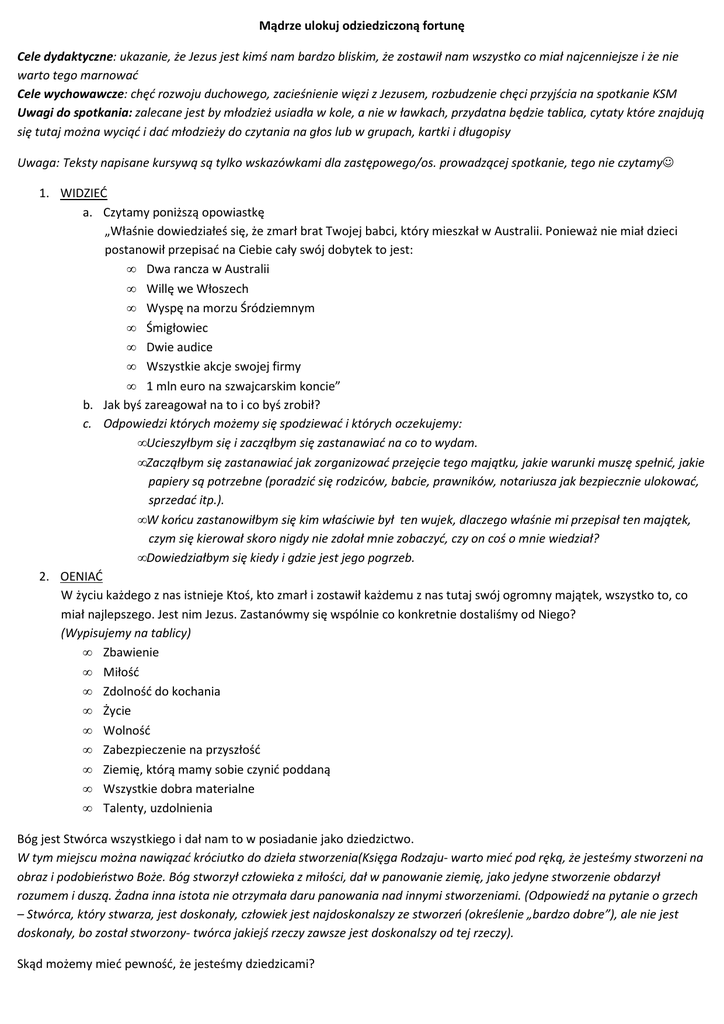 Mądrze ulokuj odziedziczoną fortunę Cele dydaktyczne: ukazanie, że Jezus jest kimś nam bardzo bliskim, że zostawił nam wszystko co miał najcenniejsze i że nie warto tego marnować Cele wychowawcze: chęć rozwoju duchowego, zacieśnienie więzi z Jezusem, rozbudzenie chęci przyjścia na spotkanie KSM Uwagi do spotkania: zalecane jest by młodzież usiadła w kole, a nie w ławkach, przydatna będzie tablica, cytaty które znajdują się tutaj można wyciąć i dać młodzieży do czytania na głos lub w grupach, kartki i długopisy Uwaga: Teksty napisane kursywą są tylko wskazówkami dla zastępowego/os. prowadzącej spotkanie, tego nie czytamy☺ 1. WIDZIEĆ a. Czytamy poniższą opowiastkę „Właśnie dowiedziałeś się, że zmarł brat Twojej babci, który mieszkał w Australii. Ponieważ nie miał dzieci postanowił przepisać na Ciebie cały swój dobytek to jest: • Dwa rancza w Australii • Willę we Włoszech • Wyspę na morzu Śródziemnym • Śmigłowiec • Dwie audice • Wszystkie akcje swojej firmy • 1 mln euro na szwajcarskim koncie” b. Jak byś zareagował na to i co byś zrobił? c. Odpowiedzi których możemy się spodziewać i których oczekujemy: • Ucieszyłbym się i zacząłbym się zastanawiać na co to wydam. • Zacząłbym się zastanawiać jak zorganizować przejęcie tego majątku, jakie warunki muszę spełnić, jakie papiery są potrzebne (poradzić się rodziców, babcie, prawników, notariusza jak bezpiecznie ulokować, sprzedać itp.). • W końcu zastanowiłbym się kim właściwie był ten wujek, dlaczego właśnie mi przepisał ten majątek, czym się kierował skoro nigdy nie zdołał mnie zobaczyć, czy on coś o mnie wiedział? • Dowiedziałbym się kiedy i gdzie jest jego pogrzeb. 2. OENIAĆ W życiu każdego z nas istnieje Ktoś, kto zmarł i zostawił każdemu z nas tutaj swój ogromny majątek, wszystko to, co miał najlepszego. Jest nim Jezus. Zastanówmy się wspólnie co konkretnie dostaliśmy od Niego? (Wypisujemy na tablicy) • Zbawienie • Miłość • Zdolność do kochania • Życie • Wolność • Zabezpieczenie na przyszłość • Ziemię, którą mamy sobie czynić poddaną • Wszystkie dobra materialne • Talenty, uzdolnienia Bóg jest Stwórca wszystkiego i dał nam to w posiadanie jako dziedzictwo. W tym miejscu można nawiązać króciutko do dzieła stworzenia(Księga Rodzaju- warto mieć pod ręką, że jesteśmy stworzeni na obraz i podobieństwo Boże. Bóg stworzył człowieka z miłości, dał w panowanie ziemię, jako jedyne stworzenie obdarzył rozumem i duszą. Żadna inna istota nie otrzymała daru panowania nad innymi stworzeniami. (Odpowiedź na pytanie o grzech – Stwórca, który stwarza, jest doskonały, człowiek jest najdoskonalszy ze stworzeń (określenie „bardzo dobre”), ale nie jest doskonały, bo został stworzony- twórca jakiejś rzeczy zawsze jest doskonalszy od tej rzeczy). Skąd możemy mieć pewność, że jesteśmy dziedzicami? Rdz 1, 28-31 28 Po czym Bóg im błogosławił, mówiąc do nich: «Bądźcie płodni i rozmnażajcie się, abyście zaludnili ziemię i uczynili ją sobie poddaną; abyście panowali nad rybami morskimi, nad ptactwem powietrznym i nad wszystkimi zwierzętami pełzającymi po ziemi». 29 I rzekł Bóg: «Oto wam daję wszelką roślinę przynoszącą ziarno po całej ziemi i wszelkie drzewo, którego owoc ma w sobie nasienie: dla was będą one pokarmem. 30 A dla wszelkiego zwierzęcia polnego i dla wszelkiego ptactwa w powietrzu, i dla wszystkiego, co się porusza po ziemi i ma w sobie pierwiastek życia, będzie pokarmem wszelka trawa zielona». I stało się tak. 31 A Bóg widział, że wszystko, co uczynił, było bardzo dobre. I tak upłynął wieczór i poranek - dzień szósty. Syr 17, 1-12 1 Pan stworzył człowieka z ziemi i znów go jej zwróci1. 2 Odliczył ludziom dni i wyznaczył czas odpowiedni, oraz dał im władzę nad tym wszystkim, co jest na niej2. 3 Przyodział ich w moc podobną do swojej i uczynił ich na swój obraz3. 4 Uczynił ich groźnymi dla wszystkiego stworzenia, aby panowali nad zwierzętami i ptactwem4. 6 Dał im wolną wolę, język i oczy, uszy i serce zdolne do myślenia5. 7 Napełnił ich wiedzą i rozumem, o złu i dobru ich pouczył. 8 Położył oko6 swoje w ich sercu, aby im pokazać wielkość swoich dzieł6. 10 Imię świętości wychwalać będą i wielkość Jego dzieł opowiadać. 11 Dodał im wiedzy i prawo życia dał im w dziedzictwo. 12 Przymierze wieczne zawarł z nimi7 i objawił im swoje prawa. Ga 3, 27-29 27 Bo wy wszyscy, którzy zostaliście ochrzczeni w Chrystusie, przyoblekliście się w Chrystusa. 28 Nie ma już Żyda ani poganina, nie ma już niewolnika ani człowieka wolnego, nie ma już mężczyzny ani kobiety, wszyscy bowiem jesteście kimś jednym w Chrystusie Jezusie. 29 Jeżeli zaś należycie do Chrystusa, to jesteście też potomstwem Abrahama i zgodnie z obietnicą dziedzicami. Kol 3, 23-25 23 Cokolwiek czynicie, z serca wykonujcie jak dla Pana, a nie dla ludzi, świadomi, 24 że od Pana otrzymacie dziedzictwo [wiekuiste] jako zapłatę. Służycie Chrystusowi jako Panu! 25 Kto bowiem popełnia bezprawie, poniesie skutki popełnionego bezprawia; a [u Niego] nie ma względu na osoby. Ga 4, 4-7 4 Gdy jednak nadeszła pełnia czasu, zesłał Bóg Syna swego, zrodzonego z niewiasty, zrodzonego pod Prawem, 5 aby wykupił tych, którzy podlegali Prawu, abyśmy mogli otrzymać przybrane synostwo. 6 Na dowód tego, że jesteście synami, Bóg wysłał do serc naszych Ducha3 Syna swego, który woła: Abba, Ojcze! 7 A zatem nie jesteś już niewolnikiem, lecz synem. Jeżeli zaś synem, to i dziedzicem z woli Bożej. 3. DZIAŁAĆ Tak samo jak w przypadku wujka tak i w przypadku Jezusa jesteśmy zobowiązani, aby zainteresować się „odziedziczoną fortuną”. Dobrze by było przemyśleć, co z nią zrobimy, gdzie zainwestujemy, jak ulokujemy, jak rozmnożymy i jak spożytkujemy