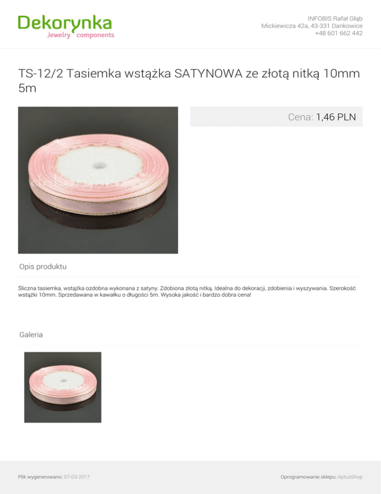 INFOBIS Rafał Głąb Mickiewicza 42a, 43-331 Dankowice +48 601 662 442 TS-12/2 Tasiemka wstążka SATYNOWA ze złotą nitką 10mm 5m Cena: 1,46 PLN Opis produktu Śliczna tasiemka, wstążka ozdobna wykonana z satyny. Zdobiona złotą nitką. Idealna do dekoracji, zdobienia i wyszywania. Szerokość wstążki 10mm. Sprzedawana w kawałku o długości 5m. Wysoka jakość i bardzo dobra cena! Galeria Plik wygenerowano: 07-03-2017 Powered by TCPDF (www.tcpdf.org) Oprogramowanie sklepu: AptusShop