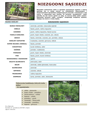 NIEZGODNI SĄSIEDZI Wszystkie zestawienia roślin w ogrodzie uprawianym zgodnie z naturą opierają się w dużej mierze na wieloletnich obserwacjach i eksperymentach ogrodników podpatrujących przyrodę i czerpiących z niej wzory. Z obserwacji tych wynika, że korzenie „przyjaznych” roślin potrafią się tak mocno spleść ze sobą, że tworzą jakby jeden system. Natomiast korzenie roślin „wrogich” zwiększają wzajemny dystans, zbijając się ciasno w małą wiązkę. NIEZGODNI SĄSIEDZI NAZWA ROŚLINY BURAK ĆWIKŁOWY ziemniak, pomidor, kukurydza szpinak CEBULA fasola, groch, rośliny kapustne CZOSNEK groch, rośliny kapustne, fasola tyczna FASOLA KARŁOWA groch, koper włoski, czosnek, por, cebula GROCH fasola, ziemniak, czosnek, por, pomidor, cebula ROŚLINY KAPUSTNE KOPER WŁOSKI (FENKUŁ) truskawka, czosnek, gorczyca, cebula fasola, pomidor KUKURYDZA burak ćwikłowy, seler OGÓREK pomidor, rzodkiewka POMIDOR groch, koper włoski, ziemniak POR fasola, groch, burak ćwikłowy RZODKIEWKA I RZODKIEW SAŁATA GŁOWIASTA SELER ogórek pietruszka, seler ziemniak, sałata głowiasta, kukurydza SŁONECZNIK ziemniak SZPARAG czosnek, cebula TRUSKAWKA rośliny kapustne ZIEMNIAK dynia, pomidor, seler, słonecznik Niekorzystne kombinacje, których trzeba unikać – do zapamiętania: sałata – pietruszka koper włoski – pomidory fasola karłowa – cebula kapusta – cebula pomidory – groch ziemniaki – słoneczniki ziemniaki – pomidory kapusta – gorczyca Ewa Majewska Instruktor ds. ogrodnictwa OZ PZD w Opolu zdjęcia z Internetu