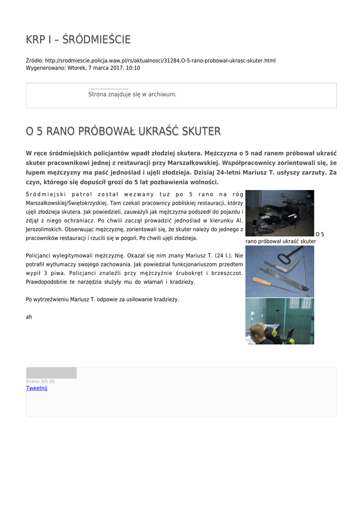 KRP I – ŚRÓDMIEŚCIE Źródło: http://srodmiescie.policja.waw.pl/rs/aktualnosci/31284,O-5-rano-probowal-ukrasc-skuter.html Wygenerowano: Wtorek, 7 marca 2017, 10:10 Strona znajduje się w archiwum. O 5 RANO PRÓBOWAŁ UKRAŚĆ SKUTER W ręce śródmiejskich policjantów wpadł złodziej skutera. Mężczyzna o 5 nad ranem próbował ukraść skuter pracownikowi jednej z restauracji przy Marszałkowskiej. Współpracownicy zorientowali się, że łupem mężczyzny ma paść jednoślad i ujęli złodzieja. Dzisiaj 24-letni Mariusz T. usłyszy zarzuty. Za czyn, którego się dopuścił grozi do 5 lat pozbawienia wolności. Śródmiejski patrol został wezwany tuż po 5 rano na róg Marszałkowskiej/Świętokrzyskiej. Tam czekali pracownicy pobliskiej restauracji, którzy ujęli złodzieja skutera. Jak powiedzieli, zauważyli jak mężczyzna podszedł do pojazdu i zdjął z niego ochraniacz. Po chwili zaczął prowadzić jednoślad w kierunku Al. Jerozolimskich. Obserwując mężczyznę, zorientowali się, że skuter należy do jednego z pracowników restauracji i rzucili się w pogoń. Po chwili ujęli złodzieja. Policjanci wylegitymowali mężczyznę. Okazał się nim znany Mariusz T. (24 l.). Nie potrafił wytłumaczy swojego zachowania. Jak powiedział funkcjonariuszom przedtem wypił 3 piwa. Policjanci znaleźli przy mężczyźnie śrubokręt i brzeszczot. Prawdopodobnie te narzędzia służyły mu do włamań i kradzieży. Po wytrzeźwieniu Mariusz T. odpowie za usiłowanie kradzieży. ah Ocena: 0/5 (0) Tweetnij O5 rano próbował ukraść skuter