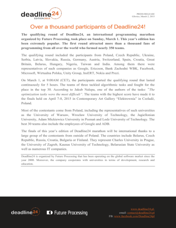 PRESS RELEASE Gliwice, March 2, 2015 Over a thousand participants of Deadline24! The qualifying round of Deadline24, an international programming marathon organized by Future Processing, took place on Sunday, March 1. This year’s edition has been extremely popular. The first round attracted more than a thousand fans of programming from all over the world who formed nearly 350 teams. The qualifying round included the participants from Poland, Czech Republic, Ukraine, Serbia, Latvia, Slovakia, Russia, Germany, Austria, Switzerland, Spain, Croatia, Great Britain, Belarus, Hungary, Nigeria, Taiwan and India. Among them there were representatives of such companies as Google, Ericcson, Bank Zachodni WBK, Facebook, Microsoft, Wirtualna Polska, Unity Group, InsERT, Nokia and Prezi. On March 1, at 9:00AM (CET), the participants started the qualifying round that lasted continuously for 5 hours. The teams of three tackled algorithmic tasks and fought for the place in the top 30. According to Jakub Nalepa, one of the authors of the tasks:“The optimization tasks were the most difficult”. The teams with the highest score have made it to the finals held on April 7-8, 2015 in Contemporary Art Gallery “Elektrownia” in Czeladź, Poland. Most of the contestants come from Poland, including the representatives of such universities as the University of Warsaw, Wrocław University of Technology, the Jagiellonian University, Adam Mickiewicz University in Poznań and Lodz University of Technology. The best 30 teams also include the employees of Google and ADB. The finals of this year’s edition of Deadline24 marathon will be international thanks to a large group of the contestants from outside of Poland. The countries include Belarus, Czech Republic, Russia, Croatia, Bulgaria or Finland. They represent Charles University in Prague, the University of Zagreb, Kaunas University of Technology, Belarusian State University as well as numerous IT companies. Deadline24 is organized by Future Processing that has been operating on the global software market since the year 2000. Moreover, the company cooperates with universities in terms of development, research and education. www.deadline24.pl. email: [email protected] FB: www.facebook.com/Deadline24pl