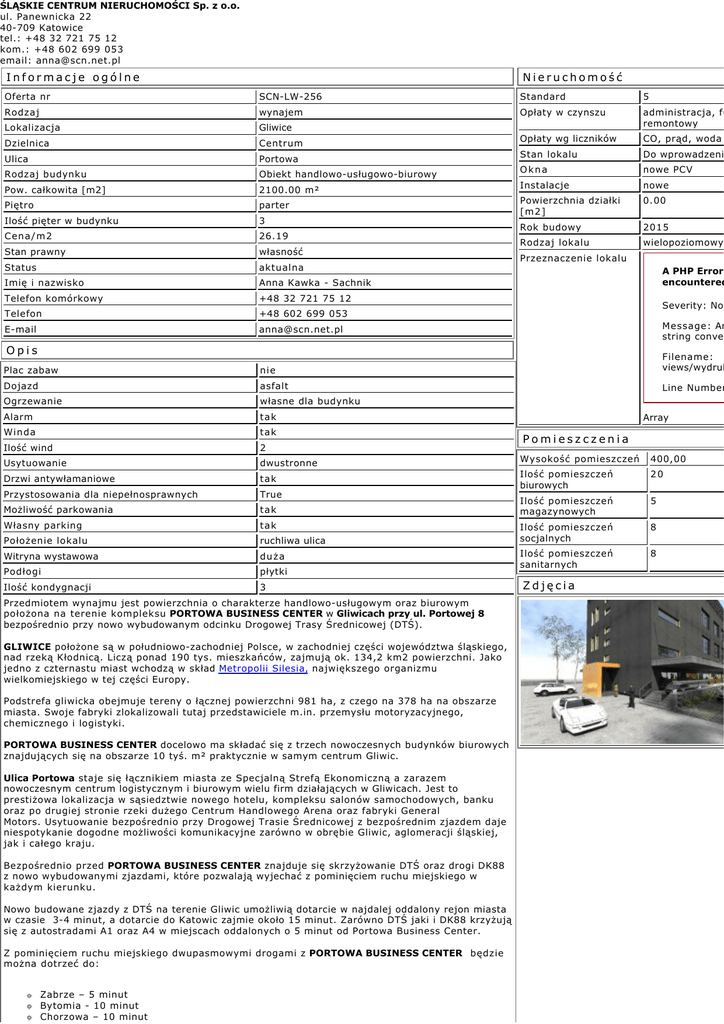 ŚLĄSKIE CENTRUM NIERUCHOMOŚCI Sp. z o.o. ul. Panewnicka 22 40-709 Katowice tel.: +48 32 721 75 12 kom.: +48 602 699 053 email: [email protected] Informacje ogólne Nieruchomość Oferta nr SCN-LW-256 Standard 5 Rodzaj wynajem Opłaty w czynszu Lokalizacja Gliwice administracja, fu remontowy Dzielnica Centrum Opłaty wg liczników CO, prąd, woda Portowa Stan lokalu Do wprowadzeni Obiekt handlowo-usługowo-biurowy Okna nowe PCV 2100.00 m² Instalacje nowe Piętro parter Powierzchnia działki [m2] 0.00 Ilość pięter w budynku 3 Rok budowy 2015 Cena/m2 26.19 Rodzaj lokalu wielopoziomowy Stan prawny własność Status aktualna Imię i nazwisko Anna Kawka - Sachnik Telefon komórkowy +48 32 721 75 12 Telefon +48 602 699 053 E-mail [email protected] Ulica Rodzaj budynku Pow. całkowita [m2] Przeznaczenie lokalu A PHP Error encountered Severity: Not Message: Ar string conve Opis Plac zabaw nie Filename: views/wydruk Dojazd asfalt Line Number Ogrzewanie własne dla budynku Alarm tak Winda tak Ilość wind 2 Usytuowanie dwustronne Wysokość pomieszczeń 400,00 Drzwi antywłamaniowe tak Ilość pomieszczeń biurowych 20 Przystosowania dla niepełnosprawnych True tak Ilość pomieszczeń magazynowych 5 Możliwość parkowania Własny parking tak ruchliwa ulica Ilość pomieszczeń socjalnych 8 Położenie lokalu Witryna wystawowa duża 8 Podłogi płytki Ilość pomieszczeń sanitarnych Ilość kondygnacji 3 Przedmiotem wynajmu jest powierzchnia o charakterze handlowo-usługowym oraz biurowym położona na terenie kompleksu PORTOWA BUSINESS CENTER w Gliwicach przy ul. Portowej 8 bezpośrednio przy nowo wybudowanym odcinku Drogowej Trasy Średnicowej (DTŚ). GLIWICE położone są w południowo-zachodniej Polsce, w zachodniej części województwa śląskiego, nad rzeką Kłodnicą. Liczą ponad 190 tys. mieszkańców, zajmują ok. 134,2 km2 powierzchni. Jako jedno z czternastu miast wchodzą w skład Metropolii Silesia, największego organizmu wielkomiejskiego w tej części Europy. Podstrefa gliwicka obejmuje tereny o łącznej powierzchni 981 ha, z czego na 378 ha na obszarze miasta. Swoje fabryki zlokalizowali tutaj przedstawiciele m.in. przemysłu motoryzacyjnego, chemicznego i logistyki. PORTOWA BUSINESS CENTER docelowo ma składać się z trzech nowoczesnych budynków biurowych znajdujących się na obszarze 10 tyś. m² praktycznie w samym centrum Gliwic. Ulica Portowa staje się łącznikiem miasta ze Specjalną Strefą Ekonomiczną a zarazem nowoczesnym centrum logistycznym i biurowym wielu firm działających w Gliwicach. Jest to prestiżowa lokalizacja w sąsiedztwie nowego hotelu, kompleksu salonów samochodowych, banku oraz po drugiej stronie rzeki dużego Centrum Handlowego Arena oraz fabryki General Motors. Usytuowanie bezpośrednio przy Drogowej Trasie Średnicowej z bezpośrednim zjazdem daje niespotykanie dogodne możliwości komunikacyjne zarówno w obrębie Gliwic, aglomeracji śląskiej, jak i całego kraju. Bezpośrednio przed PORTOWA BUSINESS CENTER znajduje się skrzyżowanie DTŚ oraz drogi DK88 z nowo wybudowanymi zjazdami, które pozwalają wyjechać z pominięciem ruchu miejskiego w każdym kierunku. Nowo budowane zjazdy z DTŚ na terenie Gliwic umożliwią dotarcie w najdalej oddalony rejon miasta w czasie 3-4 minut, a dotarcie do Katowic zajmie około 15 minut. Zarówno DTŚ jaki i DK88 krzyżują się z autostradami A1 oraz A4 w miejscach oddalonych o 5 minut od Portowa Business Center. Z pominięciem ruchu miejskiego dwupasmowymi drogami z PORTOWA BUSINESS CENTER będzie można dotrzeć do: Zabrze – 5 minut Bytomia - 10 minut Chorzowa – 10 minut Array Pomieszczenia Zdjęcia Katowic (Spodek) - 15 minut Lotniska Pyrzowice - 20 minut Lotniska Balice - 60 minut Krakowa - 60 minut Wrocławia - 1h 15 minut Warszawy – 3h Berlina - 4h Wiednia – 3,5h Budynek A składa się z 3 kondygnacji, dodatkowo nad parterem znajduje się antresola z powierzchnią biurową i otwartą powierzchnią magazynową. Budynek oferowany do wynajęcia w tej wersji i charakterze nie wymaga żadnych nakładów w częściach biurowych, natomiast w części magazynowej (handlowej) wymaga indywidualnej aranżacji. Logo umieszczone na dachu i przy wjeździe na teren Portowa8 będzie doskonale widoczne z Drogowej Trasy Średnicowej przebiegającej tuż przed budynkiem. Klimatyzowane biura wyposażone w ogrzewanie podłogowe zostały ciekawie i funkcjonalnie zaaranżowane i umeblowane. W budynku znajdują się cztery łazienki z dwoma kabinami prysznicowymi W pełni umeblowana kuchnia Szatnia dla pracowników z łazienką i prysznicem Część magazynowo - ekspozycyjna na parterze budynku oddzielona jest od części biurowej ścianą z dużymi przeszkleniami. Jest to wysoka powierzchnia typu open space wyposażona w ogrzewanie nadmuchowe. Posiada dwie elektrycznie otwierane bramy zewnętrzne wyposażone w kurtyny powietrzne. Dwie klatki schodowe oraz dwie windy towarowe dają dostęp do dwóch kondygnacji na których znajduje się atrakcyjna przestrzeń magazynowa. Każda z nich to 650 m2 otwartej przestrzeni o wysokości prawie 5 m wyposażonej w profesjonalne regały magazynowe oraz ogrzewanie nadmuchowe. Na jednym z półpięter znajduje się duży reprezentacyjny w pełni umeblowany gabinet oraz duża łazienka z prysznicem. Podstawowe korzyści intensywny ruch samochodów prestiżowe sąsiedztwo (hotel Malinowski, restauracja, salony samochodowe) bardzo dobra komunikacja dynamiczny rozwój miasta dostępne wszystkie media duża ilość miejsc parkingowych budynek wykonany przy zastosowaniu sprawdzonych technologii i materiałów oraz rozwiązań architektonicznych, użytkowych i funkcjonalnych możliwość indywidualnej aranżacji powierzchni elastyczność w doborze wielkości powierzchni rozpoznawalna lokalizacja pozytywny wizerunek w mediach Zapraszam do współpracy Mapa ŚLĄSKIE CENTRUM NIERUCHOMOŚCI Sp. z o.o. ul. Panewnicka 22 40-709 Katowice tel.: +48 32 721 75 12 kom.: +48 602