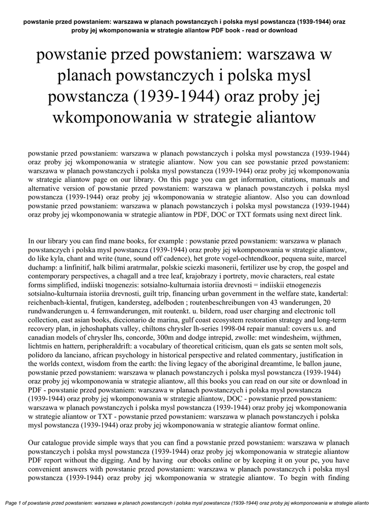 powstanie przed powstaniem: warszawa w planach powstanczych i polska mysl powstancza (1939-1944) oraz proby jej wkomponowania w strategie aliantow PDF book - read or download powstanie przed powstaniem: warszawa w planach powstanczych i polska mysl powstancza (1939-1944) oraz proby jej wkomponowania w strategie aliantow powstanie przed powstaniem: warszawa w planach powstanczych i polska mysl powstancza (1939-1944) oraz proby jej wkomponowania w strategie aliantow. Now you can see powstanie przed powstaniem: warszawa w planach powstanczych i polska mysl powstancza (1939-1944) oraz proby jej wkomponowania w strategie aliantow page on our library. On this page you can get information, citations, manuals and alternative version of powstanie przed powstaniem: warszawa w planach powstanczych i polska mysl powstancza (1939-1944) oraz proby jej wkomponowania w strategie aliantow. Also you can download powstanie przed powstaniem: warszawa w planach powstanczych i polska mysl powstancza (1939-1944) oraz proby jej wkomponowania w strategie aliantow in PDF, DOC or TXT formats using next direct link. In our library you can find mane books, for example : powstanie przed powstaniem: warszawa w planach powstanczych i polska mysl powstancza (1939-1944) oraz proby jej wkomponowania w strategie aliantow, do like kyla, chant and write (tune, sound off cadence), het grote vogel-ochtendkoor, pequena suite, marcel duchamp: a linfinitif, halk bilimi aratrmalar, polskie sciezki masonerii, fertilizer use by crop, the gospel and contemporary perspectives, a chagall and a tree leaf, krajobrazy i portrety, movie characters, real estate forms simplified, indiiski tnogenezis: sotsialno-kulturnaia istoriia drevnosti = indiiskii etnogenezis sotsialno-kulturnaia istoriia drevnosti, guilt trip, financing urban government in the welfare state, kandertal: reichenbach-kiental, frutigen, kandersteg, adelboden ; routenbeschreibungen von 43 wanderungen, 20 rundwanderungen u. 4 fernwanderungen, mit routenkt. u. bildern, road user charging and electronic toll collection, east asian books, diccionario de marina, gulf coast ecosystem restoration strategy and long-term recovery plan, in jehoshaphats valley, chiltons chrysler lh-series 1998-04 repair manual: covers u.s. and canadian models of chrysler lhs, concorde, 300m and dodge intrepid, zwolle: met windesheim, wijthmen, lichtmis en hattern, peripheraldrift: a vocabulary of theoretical criticism, quan els gats se senten molt sols, polidoro da lanciano, african psychology in historical perspective and related commentary, justification in the worlds context, wisdom from the earth: the living legacy of the aboriginal dreamtime, le ballon jaune, powstanie przed powstaniem: warszawa w planach powstanczych i polska mysl powstancza (1939-1944) oraz proby jej wkomponowania w strategie aliantow, all this books you can read on our site or download in PDF - powstanie przed powstaniem: warszawa w planach powstanczych i polska mysl powstancza (1939-1944) oraz proby jej wkomponowania w strategie aliantow, DOC - powstanie przed powstaniem: warszawa w planach powstanczych i polska mysl powstancza (1939-1944) oraz proby jej wkomponowania w strategie aliantow or TXT - powstanie przed powstaniem: warszawa w planach powstanczych i polska mysl powstancza (1939-1944) oraz proby jej wkomponowania w strategie aliantow format online. Our catalogue provide simple ways that you can find a powstanie przed powstaniem: warszawa w planach powstanczych i polska mysl powstancza (1939-1944) oraz proby jej wkomponowania w strategie aliantow PDF report without the digging. And by having our ebooks online or by keeping it on your pc, you have convenient answers with powstanie przed powstaniem: warszawa w planach powstanczych i polska mysl powstancza (1939-1944) oraz proby jej wkomponowania w strategie aliantow. To begin with finding Page 1 of powstanie przed powstaniem: warszawa w planach powstanczych i polska mysl powstancza (1939-1944) oraz proby jej wkomponowania w strategie aliantow powstanie przed powstaniem: warszawa w planach powstanczych i polska mysl powstancza (1939-1944) oraz proby jej wkomponowania w strategie aliantow PDF book - read or download powstanie przed powstaniem: warszawa w planach powstanczych i polska mysl powstancza (1939-1944) oraz proby jej wkomponowania w strategie aliantow, you are find our website that includes a comprehensive powstanie przed powstaniem: warszawa w planach powstanczych i polska mysl powstancza (1939-1944) oraz proby jej wkomponowania w strategie aliantow manuals listed. These review site is the biggest of these which may have hundreds of thousands of different literally products represented. You'll also see that there are specific sites catered to different product types or categories, niche categories or brands related to powstanie przed powstaniem: warszawa w planach powstanczych i polska mysl powstancza (1939-1944) oraz proby jej wkomponowania w strategie aliantow. So depending on what exactly you are searching, you will be able to choose ebooks powstanie przed powstaniem: warszawa w planach powstanczych i polska mysl powstancza (1939-1944) oraz proby jej wkomponowania w strategie aliantow to fit your own needs, powstanie przed powstaniem: warszawa w planach powstanczych i polska mysl powstancza (1939-1944) oraz proby jej wkomponowania w strategie aliantow. Page 2 of powstanie przed powstaniem: warszawa w planach powstanczych i polska mysl powstancza (1939-1944) oraz proby jej wkomponowania w strategie aliantow