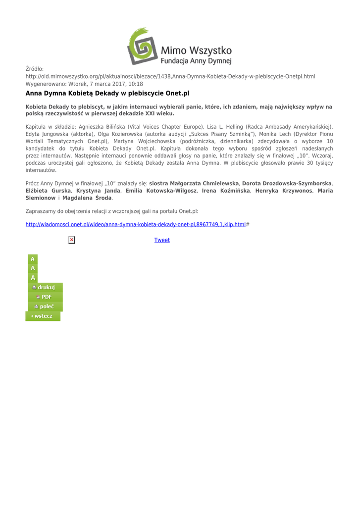 Źródło: http://old.mimowszystko.org/pl/aktualnosci/biezace/1438,Anna-Dymna-Kobieta-Dekady-w-plebiscycie-Onetpl.html Wygenerowano: Wtorek, 7 marca 2017, 10:18 Anna Dymna Kobietą Dekady w plebiscycie Onet.pl Kobieta Dekady to plebiscyt, w jakim internauci wybierali panie, które, ich zdaniem, mają największy wpływ na polską rzeczywistość w pierwszej dekadzie XXI wieku. Kapituła w składzie: Agnieszka Bilińska (Vital Voices Chapter Europe), Lisa L. Helling (Radca Ambasady Amerykańskiej), Edyta Jungowska (aktorka), Olga Kozierowska (autorka audycji „Sukces Pisany Szminką”), Monika Lech (Dyrektor Pionu Wortali Tematycznych Onet.pl), Martyna Wojciechowska (podróżniczka, dziennikarka) zdecydowała o wyborze 10 kandydatek do tytułu Kobieta Dekady Onet.pl. Kapituła dokonała tego wyboru spośród zgłoszeń nadesłanych przez internautów. Następnie internauci ponownie oddawali głosy na panie, które znalazły się w finałowej „10”. Wczoraj, podczas uroczystej gali ogłoszono, że Kobietą Dekady została Anna Dymna. W plebiscycie głosowało prawie 30 tysięcy internautów. Prócz Anny Dymnej w finałowej „10” znalazły się: siostra Małgorzata Chmielewska, Dorota Drozdowska-Szymborska, Elżbieta Gurska, Krystyna Janda, Emilia Kotowska-Wilgosz, Irena Koźmińska, Henryka Krzywonos, Maria Siemionow i Magdalena Środa. Zapraszamy do obejrzenia relacji z wczorajszej gali na portalu Onet.pl: http://wiadomosci.onet.pl/wideo/anna-dymna-kobieta-dekady-onet-pl,8967749,1,klip.html# Tweet