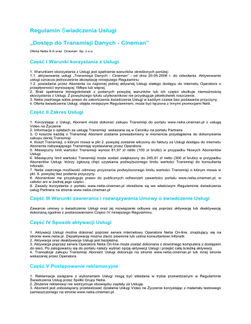 Regulamin Świadczenia Usługi „Dostęp do Transmisji Danych - Cineman” Oferta Netia S.A oraz Cineman Sp. z o.o Część I Warunki korzystania z Usługi 1. Warunkiem skorzystania z Usługi jest spełnienie warunków określonych poniżej: 1.1. aktywowanie usługi „Transmisja Danych - Cineman” - od dnia 20.05.2008 r. do odwołania. Aktywowanie usługi oznacza jednocześnie akceptację niniejszego Regulaminu 1.2. posiadanie przez Abonenta co najmniej jednej aktywnej Usługi stałego dostępu do internetu Operatora o przepływności wynoszącej 1Mbps lub więcej. 2. Brak spełnienia któregokolwiek z podanych powyżej warunków lub ich części skutkuje niemożnością skorzystania z Usługi. Z powyższego tytułu użytkownikowi nie przysługuje jakiekolwiek roszczenie. 3. Netia zastrzega sobie prawo do zakończenia świadczenia Usługi w każdym czasie bez podawania przyczyny. 4. Oferta świadczenia Usługi, objęta niniejszym Regulaminem, może być łączona z innymi promocjami Netii. Część II Zakres Usługi 1. Korzystając z Usługi, Abonent może dokonać zakupu Transmisji do portalu www.netia.cineman.pl z usługą Video na Życzenie 2. Informacja o opłatach za usługę Transmisji wskazane są w Cenniku na portalu Partnera 3. O koszcie każdej z Transmisji Abonent zostanie powiadomiony w momencie przystąpienia do dokonywania zakupu danej Transmisji 4. Koszt Transmisji, o którym mowa w pkt 2. powyżej zostanie wliczony do faktury za Usługi dostępu do internetu Abonenta nabywającego Transmisję wystawianej przez Operatora. 5. Miesięczny limit wartości Transmisji wynosi 81,97 zł netto (100 zł brutto) w przypadku Nowych Abonentów Usługi. 6. Miesięczny limit wartości Transmisji może zostać zwiększony do 245,91 zł netto (300 zł brutto) w przypadku Abonentów Usługi, którzy zgłoszą chęć uzyskania podwyższonego limitu wartości Transmisji do konsultanta Infonetii. 7. Netia zastrzega możliwość odmowy przyznania podwyższonego limitu wartości Transmisji o którym mowa w pkt. 6. powyżej bez podania przyczyny. 8. Abonentowi nie przysługuje prawo do publicznych odtworzeń zawartości portalu www.netia.cineman.pl, w całości ani w żadnej jego części. 9. Zasady korzystania z portalu www.netia.cineman.pl określone są we właściwym Regulaminie świadczenia usług Partnera na stronie www.netia.cineman.pl Część III Warunki zawierania i rozwiązywania Umowy o świadczenie Usługi Zawarcie umowy o świadczenie Usługi oraz jej rozwiązanie odbywa się poprzez aktywację lub deaktywację dokonaną zgodnie z postanowieniami Części IV niniejszego Regulaminu. Część IV Sposób aktywacji Usługi 1. Aktywacji Usługi można dokonać poprzez serwis internetowy Operatora Netia On-line, znajdujący się na stronie www.netia.pl. Dezaktywację można zlecić pisemnie lub ustnie konsultantowi Infonetii. 2. Aktywacja oraz deaktywacja Usługi jest bezpłatna. 3. Aktywacja poprzez serwis Operatora Netia On-line może zostać dokonana z dowolnego komputera z dostępem do sieci. Po zalogowaniu się do portalu należy wybrać opcję aktywacji Usługi i przejść całą ścieżkę aktywacji. 4. Transakcje zakupu Transmisji Abonent Usługi dokonuje na stronie www.netia.cineman.pl lub innej stronie wskazanej przez Operatora. Część V Postępowanie reklamacyjne 1. Reklamacje związane z wykonaniem Usługi mogą być składane w trybie przewidzianym w Regulaminie Świadczenia Usług przez Spółki Grupy Netia. 2. Złożenie reklamacji nie wstrzymuje obowiązku zapłaty za Usługę. 3. Abonent jest zobowiązany przetestować działanie Usługi Video na Życzenie korzystając z materiału testowego zamieszczonego na stronie www.netia.cineman.pl. 4. Operator wyklucza swoją odpowiedzialność za nieprawidłowości w działaniu Usługi Video na Życzenie, w tym ich treści i jakości, za które odpowiada Partner. Część VI Definicje 1. Niniejszy Regulamin określa warunki i zasady świadczenia, przez Netia SA z siedzibą w Warszawie przy ul. Poleczki 13, wpisaną do rejestru przedsiębiorców Krajowego Rejestru Sądowego pod numerem KRS 0000041649, Usługi „Dostępu do Transmisji - Cineman” dla Abonenta (zwanej w treści dokumentu „Usługą”). Regulamin został opracowany i stosowany jest zgodnie z wymaganiami określonymi w ustawie z dnia 18 lipca 2002 r. o świadczeniu usług drogą elektroniczną (Dz.U. z 2002 r. Nr 144, poz. 1204 z późn. zm.). W sprawach nieuregulowanych niniejszym dokumentem zastosowanie znajdują zapisy Regulaminu Świadczenia Usług przez Spółki Grupy Netia (Regulamin) 2. Użyte w Regulaminie określenia oznaczają: 2.1. Operator – Netia SA z siedzibą w Warszawie przy ul. Poleczki 13, 02-822 Warszawa, zarejestrowaną w Sądzie Rejonowym dla m.st. Warszawy, Sąd Gospodarczy, XIII Wydział Krajowego Rejestru Sądowego pod numerem KRS 0000041649 o kapitale zakładowym w wysokości 389.277.294 złotych opłaconym w całości, NIP 526-02-05-575, REGON 011566374 2.2. Partner - Cineman sp. z o.o. z siedzibą w Warszawie przy ul. Grochowskiej 21 A. 2.3. Abonent – osoba fizyczna lub osoba prawna korzystająca z Usługi stałego dostępu do internetu Operatora 2.4. Nowy Abonent Usługi – osoba fizyczna lub prawna korzystająca z Usługi stałego dostępu do Internetu Operatora, w przypadku której od momentu aktywacji Usługi dostępu do Transmisji – Cineman upłynął okres krótszy niż 30 dni. 2.5. Usługa dostępu do Internetu – usługa stałego dostępu do Internetu, świadczona przez Operatora 2.6. Usługa – usługa dostępu do Transmisji danych Usługi Video na Życzenie znajdujących się pod adresem www.netia.cineman.pl. 2.7. Video na Życzenie – usługa video pozwalająca na streaming video na rzecz Abonenta dostępna pod adresem www.netia.cineman.pl 2.8. Netia On-line – serwis elektroniczny dla Abonentów Netii znajdujący się pod adresem www.netiaonline.pl. 2.9. Infonetia – telefoniczny system obsługi Klienta Netii
