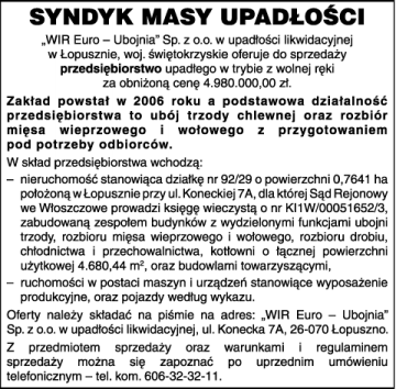 SYNDYK MASY UPADŁOŚCI „WIR Euro – Ubojnia” Sp. z o.o. w upadłości likwidacyjnej w Łopusznie, woj. świętokrzyskie oferuje do sprzedaży przedsiębiorstwo upadłego w trybie z wolnej ręki za obniżoną cenę 4.980.000,00 zł. Zakład powstał w 2006 roku a podstawowa działalność przedsiębiorstwa to ubój trzody chlewnej oraz rozbiór mięsa wieprzowego i wołowego z przygotowaniem pod potrzeby odbiorców. W skład przedsiębiorstwa wchodzą: nieruchomość stanowiąca działkę nr 92/29 o powierzchni 0,7641 ha położoną w Łopusznie przy ul. Koneckiej 7A, dla której Sąd Rejonowy we Włoszczowe prowadzi księgę wieczystą o nr KI1W/00051652/3, zabudowaną zespołem budynków z wydzielonymi funkcjami ubojni trzody, rozbioru mięsa wieprzowego i wołowego, rozbioru drobiu, chłodnictwa i przechowalnictwa, kotłowni o łącznej powierzchni użytkowej 4.680,44 m2, oraz budowlami towarzyszącymi, ruchomości w postaci maszyn i urządzeń stanowiące wyposażenie produkcyjne, oraz pojazdy według wykazu. Oferty należy składać na piśmie na adres: „WIR Euro – Ubojnia” Sp. z o.o. w upadłości likwidacyjnej, ul. Konecka 7A, 26-070 Łopuszno. Z przedmiotem sprzedaży oraz warunkami i regulaminem sprzedaży można się zapoznać po uprzednim umówieniu telefonicznym – tel. kom 606-32-32-11.
