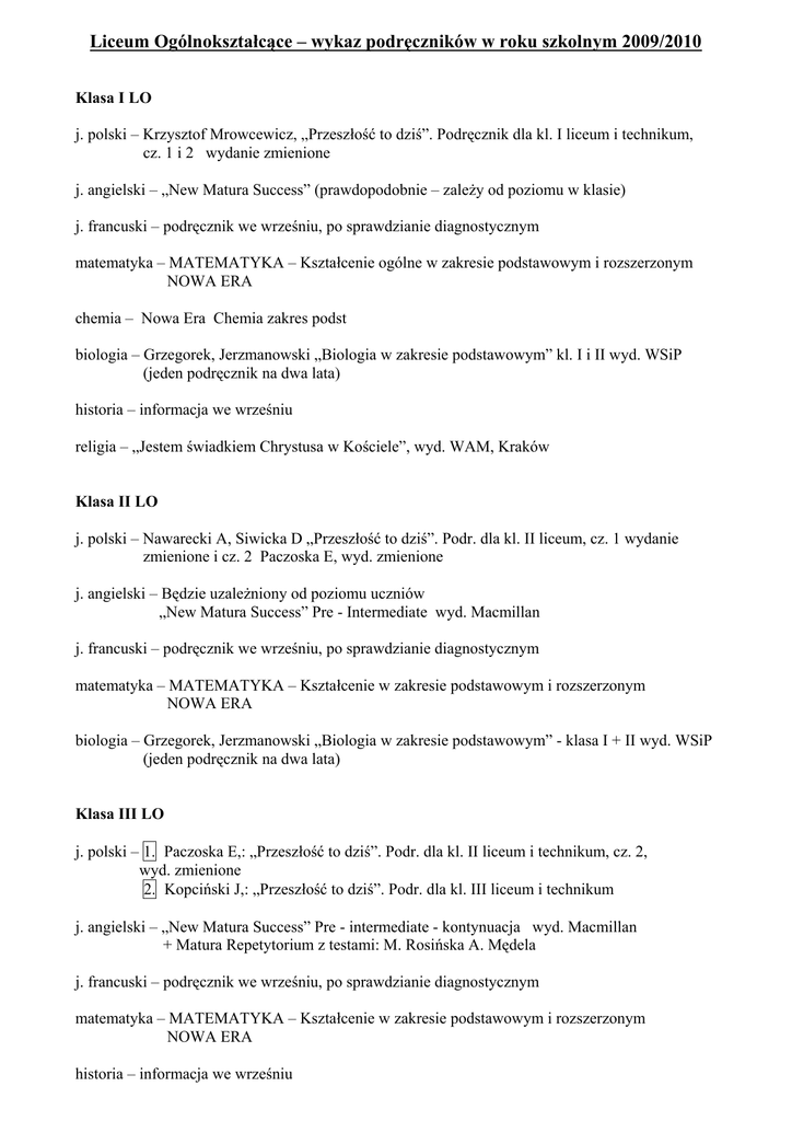 Liceum Ogólnokształcące – wykaz podręczników w roku szkolnym 2009/2010 Klasa I LO j. polski – Krzysztof Mrowcewicz, „Przeszłość to dziś”. Podręcznik dla kl. I liceum i technikum, cz. 1 i 2 wydanie zmienione j. angielski – „New Matura Success” (prawdopodobnie – zależy od poziomu w klasie) j. francuski – podręcznik we wrześniu, po sprawdzianie diagnostycznym matematyka – MATEMATYKA – Kształcenie ogólne w zakresie podstawowym i rozszerzonym NOWA ERA chemia – Nowa Era Chemia zakres podst biologia – Grzegorek, Jerzmanowski „Biologia w zakresie podstawowym” kl. I i II wyd. WSiP (jeden podręcznik na dwa lata) historia – informacja we wrześniu religia – „Jestem świadkiem Chrystusa w Kościele”, wyd. WAM, Kraków Klasa II LO j. polski – Nawarecki A, Siwicka D „Przeszłość to dziś”. Podr. dla kl. II liceum, cz. 1 wydanie zmienione i cz. 2 Paczoska E, wyd. zmienione j. angielski – Będzie uzależniony od poziomu uczniów „New Matura Success” Pre - Intermediate wyd. Macmillan j. francuski – podręcznik we wrześniu, po sprawdzianie diagnostycznym matematyka – MATEMATYKA – Kształcenie w zakresie podstawowym i rozszerzonym NOWA ERA biologia – Grzegorek, Jerzmanowski „Biologia w zakresie podstawowym” - klasa I + II wyd. WSiP (jeden podręcznik na dwa lata) Klasa III LO j. polski – 1. Paczoska E,: „Przeszłość to dziś”. Podr. dla kl. II liceum i technikum, cz. 2, wyd. zmienione 2. Kopciński J,: „Przeszłość to dziś”. Podr. dla kl. III liceum i technikum j. angielski – „New Matura Success” Pre - intermediate - kontynuacja wyd. Macmillan + Matura Repetytorium z testami: M. Rosińska A. Mędela j. francuski – podręcznik we wrześniu, po sprawdzianie diagnostycznym matematyka – MATEMATYKA – Kształcenie w zakresie podstawowym i rozszerzonym NOWA ERA historia – informacja we wrześniu