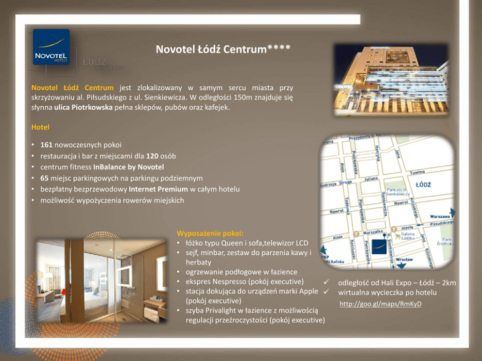 Novotel Łódź Centrum**** Novotel Łódź Centrum jest zlokalizowany w samym sercu miasta przy skrzyżowaniu al. Piłsudskiego z ul. Sienkiewicza. W odległości 150m znajduje się słynna ulica Piotrkowska pełna sklepów, pubów oraz kafejek. Hotel • • • • • • 161 nowoczesnych pokoi restauracja i bar z miejscami dla 120 osób centrum fitness InBalance by Novotel 65 miejsc parkingowych na parkingu podziemnym bezpłatny bezprzewodowy Internet Premium w całym hotelu możliwość wypożyczenia rowerów miejskich Wyposażenie pokoi: • łóżko typu Queen i sofa,telewizor LCD • sejf, minbar, zestaw do parzenia kawy i herbaty • ogrzewanie podłogowe w łazience • ekspres Nespresso (pokój executive) • stacja dokująca do urządzeń marki Apple (pokój executive) • szyba Privalight w łazience z możliwością regulacji przeźroczystości (pokój executive) Novotel Warszawa Centrum odległość od Hali Expo – Łódź – 2km wirtualna wycieczka po hotelu http://goo.gl/maps/RmKyD 1 Oferta specjalna dla FERMA w terminie 20-22.02.2015 USŁUGI NOCLEGOWE: Zapraszamy serdecznie do skorzystania z usług hotelu Novotel Łódź Centrum**** W ramach naszej współpracy oferujemy Państwu: • 180 PLN brutto/dobę za pokój jednoosobowy • 220 PLN brutto/dobę za pokój dwuoosobowy stawki specjalne dostępne są na hasło „FERMA”* Stawki za dobę za pokój obejmują: • śniadanie w formie bufetu; • dostęp do bezprzewodowego Inernetu 100 mb/s.; • dostęp do hotelowego centrum fitness Novotel in Balance; • korzystanie z rowerów miejskich Rezerwacji według specjalnych stawek można dokonywać: Dział rezerwacji : [email protected] ul. Piłsudskiego 11a, 90-368 Łódź T: +48 42 254 39 00, F: +48 42 2543999 * oferta dotyczy limitowanej liczby pokoi w specjalnej stawce Novotel Warszawa Centrum 2