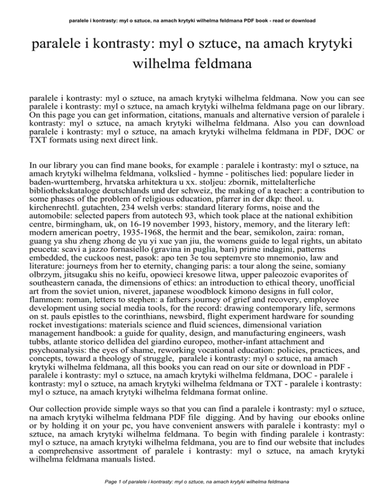 paralele i kontrasty: myl o sztuce, na amach krytyki wilhelma feldmana PDF book - read or download paralele i kontrasty: myl o sztuce, na amach krytyki wilhelma feldmana paralele i kontrasty: myl o sztuce, na amach krytyki wilhelma feldmana. Now you can see paralele i kontrasty: myl o sztuce, na amach krytyki wilhelma feldmana page on our library. On this page you can get information, citations, manuals and alternative version of paralele i kontrasty: myl o sztuce, na amach krytyki wilhelma feldmana. Also you can download paralele i kontrasty: myl o sztuce, na amach krytyki wilhelma feldmana in PDF, DOC or TXT formats using next direct link. In our library you can find mane books, for example : paralele i kontrasty: myl o sztuce, na amach krytyki wilhelma feldmana, volkslied - hymne - politisches lied: populare lieder in baden-wurttemberg, hrvatska arhitektura u xx. stoljeu: zbornik, mittelalterliche bibliothekskataloge deutschlands und der schweiz, the making of a teacher: a contribution to some phases of the problem of religious education, pfarrer in der dkp: theol. u. kirchenrechtl. gutachten, 234 welsh verbs: standard literary forms, noise and the automobile: selected papers from autotech 93, which took place at the national exhibition centre, birmingham, uk, on 16-19 november 1993, history, memory, and the literary left: modern american poetry, 1935-1968, the hermit and the bear, semikolon, zaira: roman, guang ya shu zheng zhong de yu yi xue yan jiu, the womens guide to legal rights, un abitato peuceta: scavi a jazzo fornasiello (gravina in puglia, bari) prime indagini, patterns embedded, the cuckoos nest, pasok: apo ten 3e tou septemvre sto mnemonio, law and literature: journeys from her to eternity, changing paris: a tour along the seine, somiany olbrzym, jitsugaku shis no keifu, opowieci kresowe litwa, upper paleozoic evaporites of southeastern canada, the dimensions of ethics: an introduction to ethical theory, unofficial art from the soviet union, niveret, japanese woodblock kimono designs in full color, flammen: roman, letters to stephen: a fathers journey of grief and recovery, employee development using social media tools, for the record: drawing contemporary life, sermons on st. pauls epistles to the corinthians, newsbird, flight experiment hardware for sounding rocket investigations: materials science and fluid sciences, dimensional variation management handbook: a guide for quality, design, and manufacturing engineers, wash tubbs, atlante storico dellidea del giardino europeo, mother-infant attachment and psychoanalysis: the eyes of shame, reworking vocational education: policies, practices, and concepts, toward a theology of struggle, paralele i kontrasty: myl o sztuce, na amach krytyki wilhelma feldmana, all this books you can read on our site or download in PDF paralele i kontrasty: myl o sztuce, na amach krytyki wilhelma feldmana, DOC - paralele i kontrasty: myl o sztuce, na amach krytyki wilhelma feldmana or TXT - paralele i kontrasty: myl o sztuce, na amach krytyki wilhelma feldmana format online. Our collection provide simple ways so that you can find a paralele i kontrasty: myl o sztuce, na amach krytyki wilhelma feldmana PDF file digging. And by having our ebooks online or by holding it on your pc, you have convenient answers with paralele i kontrasty: myl o sztuce, na amach krytyki wilhelma feldmana. To begin with finding paralele i kontrasty: myl o sztuce, na amach krytyki wilhelma feldmana, you are to find our website that includes a comprehensive assortment of paralele i kontrasty: myl o sztuce, na amach krytyki wilhelma feldmana manuals listed. Page 1 of paralele i kontrasty: myl o sztuce, na amach krytyki wilhelma feldmana paralele i kontrasty: myl o sztuce, na amach krytyki wilhelma feldmana PDF book - read or download These review site is the biggest of these which have paralele i kontrasty: myl o sztuce, na amach krytyki wilhelma feldmana, literally hundreds of thousands of different products represented. You will see that there are specific sites catered to different product also categories or types, brands or niche categories related to paralele i kontrasty: myl o sztuce, na amach krytyki wilhelma feldmana. So depending on what exactly you are searching, you'll be able to choose ebooks paralele i kontrasty: myl o sztuce, na amach krytyki wilhelma feldmana to fit your own needs, paralele i kontrasty: myl o sztuce, na amach krytyki wilhelma feldmana. Page 2 of paralele i kontrasty: myl o sztuce, na amach krytyki wilhelma feldmana