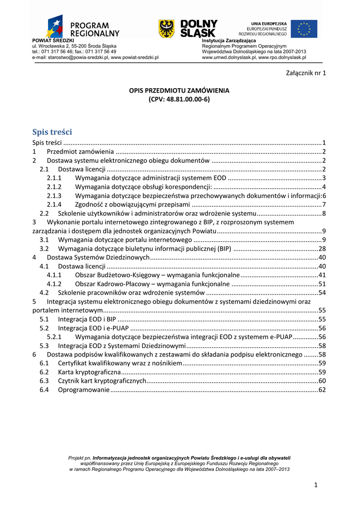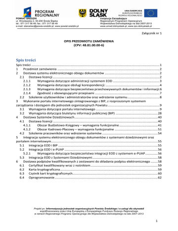 POWIAT ŚREDZKI ul. Wrocławska 2, 55-200 Środa Śląska tel.: 071 317 56 46; fax.: 071 317 56 49 e-mail: [email protected], www.powiat-sredzki.pl Instytucja Zarządzająca Regionalnym Programem Operacyjnym Województwa Dolnośląskiego na lata 2007-2013 www.umwd.dolnyslask.pl, www.rpo.dolnyslask.pl Załącznik nr 1 OPIS PRZEDMIOTU ZAMÓWIENIA (CPV: 48.81.00.00-6) Spis treści Spis treści ...............................................................................................................................................1 1 Przedmiot zamówienia ..................................................................................................................2 2 Dostawa systemu elektronicznego obiegu dokumentów .............................................................2 2.1 Dostawa licencji .......................................................................................................................2 2.1.1 Wymagania dotyczące administracji systemem EOD ....................................................3 2.1.2 Wymagania dotyczące obsługi korespondencji: ............................................................4 2.1.3 Wymagania dotyczące bezpieczeństwa przechowywanych dokumentów i informacji:6 2.1.4 Zgodność z obowiązującymi przepisami ........................................................................7 2.2 Szkolenie użytkowników i administratorów oraz wdrożenie systemu....................................8 3 Wykonanie portalu internetowego zintegrowanego z BIP, z rozproszonym systemem zarządzania i dostępem dla jednostek organizacyjnych Powiatu..........................................................9 3.1 Wymagania dotyczące portalu internetowego .......................................................................9 3.2 Wymagania dotyczące biuletynu informacji publicznej (BIP) ...............................................28 4 Dostawa Systemów Dziedzinowych.............................................................................................40 4.1 Dostawa licencji .....................................................................................................................40 4.1.1 Obszar Budżetowo-Księgowy – wymagania funkcjonalne...........................................41 4.1.2 Obszar Kadrowo-Płacowy – wymagania funkcjonalne ................................................51 4.2 Szkolenie pracowników oraz wdrożenie systemów ..............................................................54 5 Integracja systemu elektronicznego obiegu dokumentów z systemami dziedzinowymi oraz portalem internetowym.......................................................................................................................55 5.1 Integracja EOD i BIP ...............................................................................................................55 5.2 Integracja EOD i e-PUAP ........................................................................................................56 5.2.1 Wymagania dotyczące bezpieczeństwa integracji EOD z systemem e-PUAP..............56 5.3 Integracja EOD z Systemami Dziedzinowymi.........................................................................58 6 Dostawa podpisów kwalifikowanych z zestawami do składania podpisu elektronicznego ........58 6.1 Certyfikat kwalifikowany wraz z nośnikiem...........................................................................59 6.2 Karta kryptograficzna.............................................................................................................59 6.3 Czytnik kart kryptograficznych...............................................................................................60 6.4 Oprogramowanie...................................................................................................................62 Projekt pn. Informatyzacja jednostek organizacyjnych Powiatu Średzkiego i e-usługi dla obywateli współfinansowany przez Unię Europejską z Europejskiego Funduszu Rozwoju Regionalnego w ramach Regionalnego Programu Operacyjnego dla Województwa Dolnośląskiego na lata 2007–2013 1 POWIAT ŚREDZKI ul. Wrocławska 2, 55-200 Środa Śląska tel.: 071 317 56 46; fax.: 071 317 56 49 e-mail: [email protected], www.powiat-sredzki.pl Instytucja Zarządzająca Regionalnym Programem Operacyjnym Województwa Dolnośląskiego na lata 2007-2013 www.umwd.dolnyslask.pl, www.rpo.dolnyslask.pl Szczegółowy Opis Przedmiotu Zamówienia – systemy informatyczne 1 Przedmiot zamówienia Przedmiotem zamówienia jest: 1. Dostawa systemu elektronicznego obiegu dokumentów 2. Dostawa podpisów kwalifikowanych z zestawami do składania podpisu elektronicznego 3. Wykonanie portalu internetowego zintegrowanego z BIP, z rozproszonym systemem zarządzania i dostępem dla jednostek organizacyjnych Powiatu 4. Integracja systemu elektronicznego obiegu dokumentów z systemami dziedzinowymi oraz portalem internetowym 5. Dostawa Systemów Dziedzinowych: systemu finansowo-księgowego oraz kadrowopłacowego 6. Szkolenie użytkowników i administratorów z systemu elektronicznego obiegu dokumentów 7. Szkolenie pracowników z systemu finansowo-księgowego i kadrowo-płacowego. 2 Dostawa systemu elektronicznego obiegu dokumentów Zamawiający użytkuje zakupiony w 2007 roku system obiegu dokumentów, zwany dalej EOD, o nazwie mis-Partner/Urzędy wersja 2.6.14. Wdrożony EOD obejmuje część stanowisk pracy Zamawiającego. 2.1 Dostawa licencji Przedmiotem zamówienia jest uzupełniająca dostawa licencji systemu mis-Partner/Urzędy wersja 2.6.14 dla 30 stanowisk pracy Starostwa oraz 13 stanowisk pracy zlokalizowanych w Jednostkach Organizacyjnych (razem: licencje umożliwiające równoległą pracę na 43 stanowiskach pracy). Zamawiający dopuszcza dostarczenie EOD innego, niż posiadany obecnie pod warunkiem, że inny system będzie spełniał wszystkie określone dalej wymagania funkcjonalne i niefunkcjonalne oraz będzie w pełni kompatyb