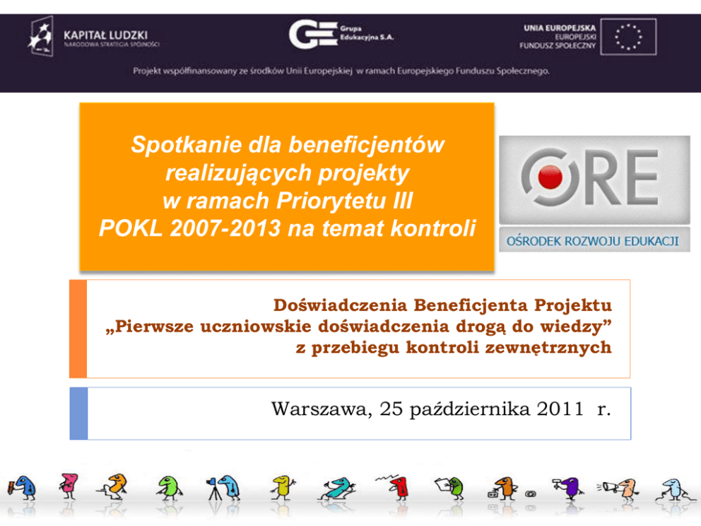 Spotkanie dla beneficjentów realizujących projekty w ramach Priorytetu III POKL 2007-2013 na temat kontroli Doświadczenia Beneficjenta Projektu „Pierwsze uczniowskie doświadczenia drogą do wiedzy” z przebiegu kontroli zewnętrznych Warszawa, 25 października 2011 r. Prezentacja przygotowana przez Biuro Projektu „Pierwsze uczniowskie doświadczenia drogą do wiedzy” Grażyna Kozioł, Urszula Wojsław-Kozłowska, Joanna Radziejewska Beneficjent i źródło finansowania Beneficjentem Projektu jest Grupa Edukacyjna S.A. z siedzibą w Kielcach Projekt jest współfinansowany ze środków Unii Europejskiej w ramach Europejskiego Funduszu Społecznego Priorytet III PO KL 2007-2013 Wysoka Jakość Kształcenia Działanie 3.3 Poprawa jakości kształcenia Poddziałanie 3.3.4 Modernizacja treści i metod kształcenia Projekt w liczbach Okres realizacji: październik 2008 r. – grudzień 2011 r. Wartość projektu: 46 036 795,07 zł Zasięg terytorialny: 16 województw (w tym 6 od 2008 r., a dodatkowo 10 od 2011 r.) Liczba szkół: 2 732 Liczba nauczycieli, w tym specjalistów: 8 482 Liczba uczniów: 142 342!!! Plan prezentacji Organizacja pracy w projekcie a kontrole zewnętrzne Bezpośrednie przygotowania do kontroli zewnętrznych Zagadnienia formalne i finansowe Zagadnienia merytoryczne Zagadnienia formalne i finansowe Zagadnienia merytoryczne Przebieg kontroli zewnętrznej na miejscu Zagadnienia formalne i finansowe Zagadnienia merytoryczne Organizacja pracy w projekcie a kontrole zewnętrzne – zagadnienia formalne i finansowe 1. Precyzyjny podział obowiązków i odpowiedzialności (zakresy czynności, oddzielne pełnomocnictwa, przypisanie poszczególnych pozycji budżetowych do właściwych menadżerów) 2. System obiegu dokumentów prawnych i finansowych zapewniający ścieżkę kontroli na różnych etapach realizacji danego zamówienia (wybór wykonawcy, podpisanie umowy, realizacja zamówienia, płatność) 3. „Wielofunkcyjność” opisu dokumentów finansowych 4. Dobra znajomość prawa polskiego i wspólnotowego 5. Dokładna analiza umów z wykonawcami (należyte dokumentowanie wykonania umowy, terminy, kary umowne) 6. System archiwizowania dokumentów zapewniający łatwą dostępność do dokumentów niezależnie od skali projektu 7. Archiwizowanie działań promocyjnych projektu i ich efektów 8. Pamięć instytucjonalna Organizacja pracy w projekcie a kontrole zewnętrzne – zagadnienia merytoryczne 1. 2. 3. 4. Należyte i wszechstronne dokumentowanie przebiegu realizacji zadań merytorycznych w projekcie (dzienniki zajęć, protokoły odbioru dzieł, archiwizowanie dzieł, listy obecności, programy szkoleń, prezentacje szkoleniowe, ankiety ewaluacyjne i ich zbiorcze zestawienia, raporty ze spotkań monitoringowych, dokumentacja fotograficzna i filmowa) System spotkań monitoringowych Różne narzędzia ewaluacji projektu oraz system zbierania informacji o jego efektach, rezultatach i wartości dodanej Pamięć instytucjonalna Bezpośrednie przygotowania do kontroli zewnętrznych – zagadnienia formalne i finansowe 1. 2. 3. 4. 5. Przegląd dokumentacji formalno-finansowej (uporządkowanie) Przegląd dokumentacji organizacyjnej beneficjenta i projektu (uporządkowanie) - dokumenty rejestrowe, umowa o dofinansowanie wraz z aneksami, wnioski o dofinansowanie i o płatność, procedury wewnętrzne, pełnomocnictwa Opracowanie i testowanie systemu gromadzenia i przekazywania dokumentów kontrolującym Organizacja miejsca pracy kontrolujących Pamięć instytucjonalna – odświeżenie wiadomości Bezpośrednie przygotowania do kontroli zewnętrznych – zagadnienia merytoryczne 1. 2. 3. 4. Przegląd dokumentacji merytorycznej (uporządkowanie) Opracowanie i testowanie systemu gromadzenia i przekazywania dokumentów merytorycznych kontrolującym Analiza stanu wdrażania projektu na dzień kontroli (rezultaty, efekty, wartość dodana) Pamięć instytucjonalna - odświeżenie wiadomości Przebieg kontroli zewnętrznej na miejscu – zagadnienia formalne i finansowe 1. Spotkanie zespołu projektu z zespołem kontrolującym na początek kontroli – przedstawienie osób, wskazanie osób udzielających wyjaśnień (powinna być jedna, maksymalnie dwie – kwestie formalno-finansowe i merytoryczne) 2. Sprawne przedstawienie kontrolującym wylosowanej próby dokumentów (czas, kompletność dokumentacji w relacji do oczekiwań kontrolujących, czytelność sposobu przekazania) 3. Sprawne przedstawienie kontrolującym (na ich żądanie) dokumentów organizacyjnych beneficjenta i projektu (dokumenty rejestrowe, umowa o dofinansowanie wraz z aneksami, wnioski o dofinansowanie i o płatność, procedury wewnętrzne, pełnomocnictwa) 4. Dobra znajomość prawa polskiego i wspólnotowego 5. Gromadzenie informacji o przedstawionych kontrolującym dokumentach 6. Pamięć instytucjonalna - przy udzielaniu wyjaśnień 7. Spotkanie zespołu projektu z zespołem kontrolującym na zakończenie kontroli Przebieg kontroli zewnętrznej na miejscu – zagadnienia formalne i finansowe (na co zwracano uwagę?) 1. Gwarancja należytego wykonania umowy (bankowa) – wartość usługi, ważność dokumentu w świetle aneksów do umowy o dofinansowanie 2. Personel – praca w kilku różnych projektach, praca na część etatu w projekcie i na część poza nim, praca na umowę zlecenie, kilka umów różnego typu z tą samą osobą w ramach jednego projektu, adekwatność wysokości wynagrodzeń do obciążenia godzinowego, udokumentowanie obciążenia godzinowego 3. Dokumentacja rozpoznania cenowego na etapie pierwotnego wniosku o dofinansowanie (budżetu projektu) – uzasadnienie planowanej wysokości wydatków 4. Promocja projektu (weryfikacja obowiązkowych logotypów na egzemplarzach okazowych) 5. Ewidencja środków trwałych, wyposażenia, wartości niematerialnych i prawnych, oznaczenie zakupionego sprzętu i stanowisk pracy 6. Dowody wykonania umowy, w tym protokoły przekazania dzi