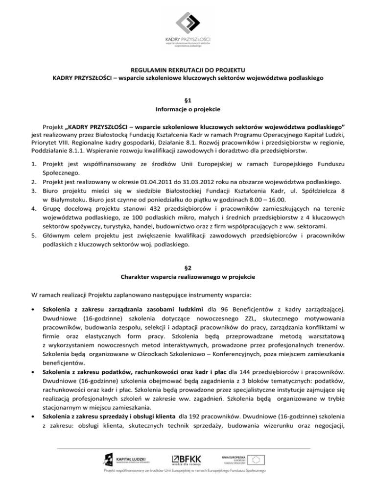 REGULAMIN REKRUTACJI DO PROJEKTU KADRY PRZYSZŁOŚCI – wsparcie szkoleniowe kluczowych sektorów województwa podlaskiego §1 Informacje o projekcie Projekt „KADRY PRZYSZŁOŚCI – wsparcie szkoleniowe kluczowych sektorów województwa podlaskiego” jest realizowany przez Białostocką Fundację Kształcenia Kadr w ramach Programu Operacyjnego Kapitał Ludzki, Priorytet VIII. Regionalne kadry gospodarki, Działanie 8.1. Rozwój pracowników i przedsiębiorstw w regionie, Poddziałanie 8.1.1. Wspieranie rozwoju kwalifikacji zawodowych i doradztwo dla przedsiębiorstw. 1. Projekt jest współfinansowany ze środków Unii Europejskiej w ramach Europejskiego Funduszu Społecznego. 2. Projekt jest realizowany w okresie 01.04.2011 do 31.03.2012 roku na obszarze województwa podlaskiego. 3. Biuro projektu mieści się w siedzibie Białostockiej Fundacji Kształcenia Kadr, ul. Spółdzielcza 8 w Białymstoku. Biuro jest czynne od poniedziałku do piątku w godzinach 8.00 – 16.00. 4. Grupę docelową projektu stanowi 432 przedsiębiorców i pracowników zamieszkujących na terenie województwa podlaskiego, ze 100 podlaskich mikro, małych i średnich przedsiębiorstw z 4 kluczowych sektorów spożywczy, turystyka, handel, budownictwo oraz z firm współpracujących z ww. sektorami. 5. Głównym celem projektu jest zwiększenie kwalifikacji zawodowych przedsiębiorców i pracowników podlaskich z kluczowych sektorów woj. podlaskiego. §2 Charakter wsparcia realizowanego w projekcie W ramach realizacji Projektu zaplanowano następujące instrumenty wsparcia: • • • Szkolenia z zakresu zarządzania zasobami ludzkimi dla 96 Beneficjentów z kadry zarządzającej. Dwudniowe (16-godzinne) szkolenia dotyczące nowoczesnego ZZL, skutecznego motywowania pracowników, budowania zespołu, selekcji i adaptacji pracowników do pracy, zarządzania konfliktami w firmie oraz elastycznych form pracy. Szkolenia będą przeprowadzane metodą warsztatową z wykorzystaniem nowoczesnych metod interaktywnych, prowadzone przez profesjonalnych trenerów. Szkolenia będą organizowane w Ośrodkach Szkoleniowo – Konferencyjnych, poza miejscem zamieszkania beneficjentów. Szkolenia z zakresu podatków, rachunkowości oraz kadr i płac dla 144 przedsiębiorców i pracowników. Dwudniowe (16-godzinne) szkolenia obejmować będą zagadnienia z 3 bloków tematycznych: podatków, rachunkowości oraz kadr i płac. Szkolenia będą prowadzone przez specjalistyczne instytucje zajmujące się realizacją profesjonalnych szkoleń w zakresie ww. zagadnień. Szkolenia będą organizowane w trybie stacjonarnym w miejscu zamieszkania. Szkolenia z zakresu sprzedaży i obsługi klienta dla 192 pracowników. Dwudniowe (16-godzinne) szkolenia z zakresu: obsługi klienta, skutecznych technik sprzedaży, budowania wizerunku oraz negocjacji, zarządzania czasem, zarządzania łańcuchem dostaw, call center. Szkolenia będą organizowane w trybie stacjonarnym w miejscu zamieszkania. §3 Beneficjenci projektu W projekcie może wziąć udział samozatrudniony oraz przedsiębiorca lub pracownik oddelegowany przez pracodawcę, którego przedsiębiorstwo spełnia jednocześnie następujące warunki: 1) jest mikro, małym bądź średnim przedsiębiorstwem; 2) jest przedsiębiorstwem z sektorów: spożywczego, turystyka, handel, budownictwo oraz z przedsiębiorstw współpracujących z ww. sektorami; 3) jest przedsiębiorstwem mającym swoją siedzibę na terenie województwa podlaskiego. Samozatrudniony jest to osoba fizyczna prowadząca działalność gospodarczą, niezatrudniająca pracowników. Mikroprzedsiębiorstwo jest to przedsiębiorstwo, które w co najmniej jednym z dwóch ostatnich lat obrotowych: – zatrudniało średniorocznie mniej niż 10 pracowników oraz – osiągnęło roczny obrót netto ze sprzedaży towarów, wyrobów i usług oraz operacji finansowych nieprzekraczający równowartości w złotych 2 milionów euro lub sumy aktywów jego bilansu sporządzonego na koniec jednego z tych lat nie przekroczyły równowartości w złotych 2 milionów euro. Małe przedsiębiorstwo jest to przedsiębiorstwo, które w co najmniej jednym z dwóch ostatnich lat obrotowych: – zatrudniało średniorocznie mniej niż 50 pracowników oraz – osiągnęło roczny obrót netto ze sprzedaży towarów, wyrobów i usług oraz operacji finansowych nieprzekraczający równowartości w złotych 10 milionów euro lub sumy aktywów jego bilansu sporządzonego na koniec jednego z tych lat nie przekroczyły równowartości w złotych 10 milionów euro. Średnie przedsiębiorstwo jest to przedsiębiorstwo, które w co najmniej jednym z dwóch ostatnich lat obrotowych: – zatrudniało średniorocznie mniej niż 250 pracowników oraz – osiągnęło roczny obrót netto ze sprzedaży towarów, wyrobów i usług oraz operacji finansowych nieprzekraczający równowartości w złotych 50 milionów euro lub sumy aktywów jego bilansu sporządzonego na koniec jednego z tych lat nie przekroczyły równowartości w złotych 43 milionów euro. Pracownik - w rozumieniu definicji zawartej w Rozporządzeniu Ministra Rozwoju Regionalnego z dnia 15.12.2010 r. §2 pkt.8 przez pracownika należy rozumieć: a) pracownika w rozumieniu art.2 ustawy z dnia 26 czerwca 1974 r. – Kodeks pracy (Dz. U. z 1998 r. Nr 21, poz. 94, z późn. zm.)1, b) właściciela, pełniącego funkcje kierownicze, c) wspólnika, w tym partnera prowadzącego regularną działalność w przedsiębiorstwie i czerpiącego z niego korzyści finansowe. Pracownik znajdujący się w bardzo niekorzystnej sytuacji – należy przez to rozumieć osobę, która pozostawała bez zatrudnienia przez okres co najmniej 24 miesięcy poprzedzających zatrudnienie. Pracownik znajdujący się w szczególnie niekorzystnej sytuacji - należy przez to rozumieć osobę, która spełnia co najmniej jeden z następujących warunków: a) pozostawała bez zatrudnienia przez okres co najmniej 6 miesięcy popr