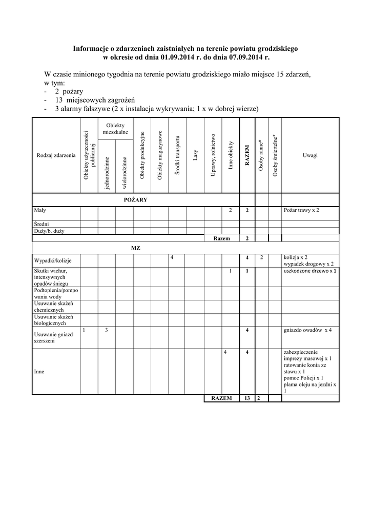 Informacje o zdarzeniach zaistniałych na terenie powiatu grodziskiego w okresie od dnia 01.09.2014 r. do dnia 07.09.2014 r. 2 Osoby śmiertelne* RAZEM 2 Osoby ranne* Inne obiekty Uprawy, rolnictwo Lasy Środki transportu Obiekty magazynowe Obiekty produkcyjne wielorodzinne Obiekty mieszkalne jednorodzinne Rodzaj zdarzenia Obiekty użyteczności publicznej W czasie minionego tygodnia na terenie powiatu grodziskiego miało miejsce 15 zdarzeń, w tym: - 2 pożary - 13 miejscowych zagrożeń - 3 alarmy fałszywe (2 x instalacja wykrywania; 1 x w dobrej wierze) Uwagi POŻARY Mały Pożar trawy x 2 Średni Duży/b. duży Razem 2 MZ 4 Wypadki/kolizje Skutki wichur, intensywnych opadów śniegu Podtopienia/pompo wania wody Usuwanie skażeń chemicznych Usuwanie skażeń biologicznych Usuwanie gniazd szerszeni 1 1 2 1 kolizja x 2 wypadek drogowy x 2 uszkodzone drzewo x 1 4 gniazdo owadów x 4 4 zabezpieczenie imprezy masowej x 1 ratowanie konia ze stawu x 1 pomoc Policji x 1 plama oleju na jezdni x 1 4 3 4 Inne RAZEM 13 2