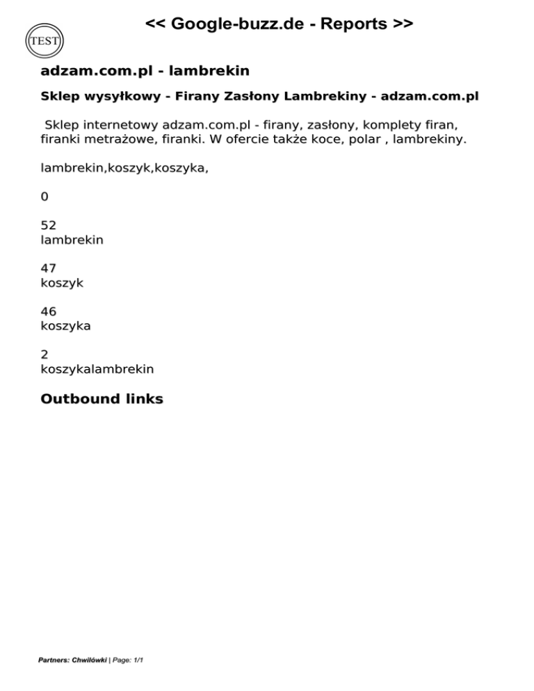 << Google-buzz.de - Reports >> adzam.com.pl - lambrekin Sklep wysyłkowy - Firany Zasłony Lambrekiny - adzam.com.pl Sklep internetowy adzam.com.pl - firany, zasłony, komplety firan, firanki metrażowe, firanki. W ofercie także koce, polar , lambrekiny. lambrekin,koszyk,koszyka, 0 52 lambrekin 47 koszyk 46 koszyka 2 koszykalambrekin Outbound links Partners: Chwilówki | Page: 1/1 Powered by TCPDF (www.tcpdf.org) Powered by TCPDF (www.tcpdf.org)
