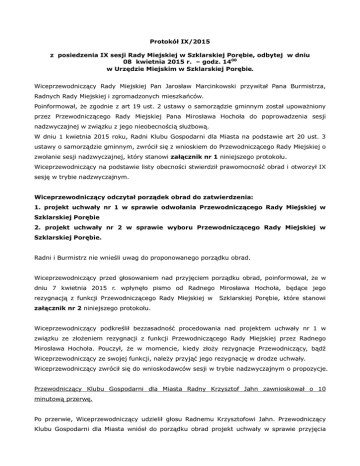 Protokół IX/2015 z posiedzenia IX sesji Rady Miejskiej w Szklarskiej Porębie, odbytej w dniu 08 kwietnia 2015 r. – godz. 1400 w Urzędzie Miejskim w Szklarskiej Porębie. Wiceprzewodniczący Rady Miejskiej Pan Jarosław Marcinkowski przywitał Pana Burmistrza, Radnych Rady Miejskiej i zgromadzonych mieszkańców. Poinformował, że zgodnie z art 19 ust. 2 ustawy o samorządzie gminnym został upoważniony przez Przewodniczącego Rady Miejskiej Pana Mirosława Hochoła do poprowadzenia sesji nadzwyczajnej w związku z jego nieobecnością służbową. W dniu 1 kwietnia 2015 roku, Radni Klubu Gospodarni dla Miasta na podstawie art 20 ust. 3 ustawy o samorządzie gminnym, zwrócił się z wnioskiem do Przewodniczącego Rady Miejskiej o zwołanie sesji nadzwyczajnej, który stanowi załącznik nr 1 niniejszego protokołu. Wiceprzewodniczący na podstawie listy obecności stwierdził prawomocność obrad i otworzył IX sesję w trybie nadzwyczajnym. Wiceprzewodniczący odczytał porządek obrad do zatwierdzenia: 1. projekt uchwały nr 1 w sprawie odwołania Przewodniczącego Rady Miejskiej w Szklarskiej Porębie 2. projekt uchwały nr 2 w sprawie wyboru Przewodniczącego Rady Miejskiej w Szklarskiej Porębie. Radni i Burmistrz nie wnieśli uwag do proponowanego porządku obrad. Wiceprzewodniczący przed głosowaniem nad przyjęciem porządku obrad, poinformował, że w dniu 7 kwietnia 2015 r. wpłynęło pismo od Radnego Mirosława Hochoła, będące jego rezygnacją z funkcji Przewodniczącego Rady Miejskiej w Szklarskiej Porębie, które stanowi załącznik nr 2 niniejszego protokołu. Wiceprzewodniczący podkreślił bezzasadność procedowania nad projektem uchwały nr 1 w związku ze złożeniem rezygnacji z funkcji Przewodniczącego Rady Miejskiej przez Radnego Mirosława Hochoła. Pouczył, że w momencie, kiedy złoży rezygnacje Przewodniczący, bądź Wiceprzewodniczący ze swojej funkcji, należy przyjąć jego rezygnację w drodze uchwały. Wiceprzewodniczący zwrócił się do wnioskodawców sesji w trybie nadzwyczajnym o propozycje. Przewodniczący Klubu Gospodarni dla Miasta Radny Krzysztof Jahn zawnioskował o 10 minutową przerwę. Po przerwie, Wiceprzewodniczący udzielił głosu Radnemu Krzysztofowi Jahn. Przewodniczący Klubu Gospodarni dla Miasta wniósł do porządku obrad projekt uchwały w sprawie przyjęcia rezygnacji Przewodniczącego Rady Miejskiej. Projekt uchwały nr 1 w sprawie odwołania Przewodniczącego Rady Miejskiej zostaje wycofany i w jego miejsce zostaje wprowadzony projekt uchwały nr 1 w sprawie przyjęcia rezygnacji Przewodniczącego Rady Miejskiej w Szklarskiej Porębie. Wiceprzewodniczący zwrócił się do wnioskodawców sesji nadzwyczajnej, czy wyrażają zgodę na zmianę w porządku obrad. Wnioskodawcy nie mieli uwag. Głosowanie nad przyjęciem proponowanego porządku obrad: 9 głosów za, 3 głosy wstrzymujące się. Porządek obrad został przyjęty. Ad. 1 - Wiceprzewodniczący odczytał projekt uchwały nr 1 w sprawie przyjęcia rezygnacji Przewodniczącego Rady Miejskiej w Szklarskiej Porębie. Przebieg głosowania: 9 głosów za, 3 głosy wstrzymujące się. Ad.2 - Wiceprzewodniczący zwrócił się do radnych o zgłaszanie kandydatur do składu osobowego Komisji Skrutacyjnej. • Radny Mirosław Karpiej zgłosił radnego Marka Ludwiczaka (wyraził zgodę) • Radny Krzysztof Jahn zgłosił radną Iwonę Pawłowską (wyraziła zgodę) • Wiceprzewodniczący zgłosił radnego Bohdana Wojciecha Gintera (nie wyraził zgody) • Radny Krzysztof Jahn zgłosił Radną Izabelę Broś (wyraziła zgodę) Proponowany Skład Komisji Skrutacyjnej: Marek Ludwiczak, Iwona Pawłowska, Izabela Broś Wiceprzewodniczący zamknął listę kandydatów i przeprowadził głosowanie blokowe nad składem komisji. Przebieg głosowania: 10 głosów za, 2 głosy wstrzymujące się. Wiceprzewodniczący poprosił Komisję Skrutacyjną aby wybrała spośród siebie Przewodniczącego. Przewodniczącym został Radny Marek Ludwiczak. Pouczył radnych o sposobie głosowania. Wiceprzewodniczący zwrócił się do radnych o zgłaszanie kandydatur na Przewodniczącego Rady Miejskiej. • Jan Taisner zgłosił kandydaturę radnego Krzysztofa Jahna, uzasadniając swój wybór tym, że radny Jahn dał się poznać w klubie jako osoba dynamiczna, a jako Przewodniczący Rady będzie dobrze pełnił tą funkcję. Wiceprzewodniczący pouczył, że radny Jahn jest Przewodniczącym Komisji Rewizyjnej i nie może łączyć funkcji Przewodniczącego Rady Miejskiej z funkcją Przewodniczącego Komisji Rewizyjnej. Wiceprzewodniczący Rady Miejskiej Pan Jarosław Marcinkowski zwrócił się do radców prawnych obecnych na sali, t.j. mec. Romana Słomskiego i mec. Dawida Skowrona, czy będąc Przewodniczącym Komisji Rewizyjnej można być wybranym na Przewodniczącego Rady Miejskiej, czy należy najpierw złożyć rezygnację przed kandydowaniem? Mecenas Roman Słomski poinformował, że nie można obu funkcji pełnić. Potwierdził, że z chwilą wyboru Radny Jahn musi się zrzec Przewodniczenia Komisji Rewizyjnej. Wiceprzewodniczący Rady Miejskiej zapytał, czy jeżeli radny Jahn zostanie wybrany Przewodniczącym Rady Miejskiej będąc równocześnie Przewodniczącym Komisji Rewizyjnej to czy zostanie wybrany zgodnie z prawem? Mecenas Dawid Skowron potwierdził, że zostanie wówczas wybrany zgodnie z prawem. Wiceprzewodniczący Rady Miejskiej zwrócił się do radnych z zapytaniem, czy są inne kandydatury ? Wiceprzewodniczący zwrócił się do radnego Krzysztofa Jahna, czy ten wyraża zgodę na kandydowanie na przewodniczącego Rady Miejskiej? Radny Krzysztof Jahn potwierdził, że wyraża zgodę na kandydowanie i poinformował, że jeżeli będzie wybrany, zrezygnuje z przewodniczenia Komisji Rewizyjnej oraz oświadczył, że nie będzie brał udziału w głosowaniu, czyli nie będzie głosował na siebie. Wiceprzewodniczący zaznaczył, że zgodnie z procedurą wyborczą, radn