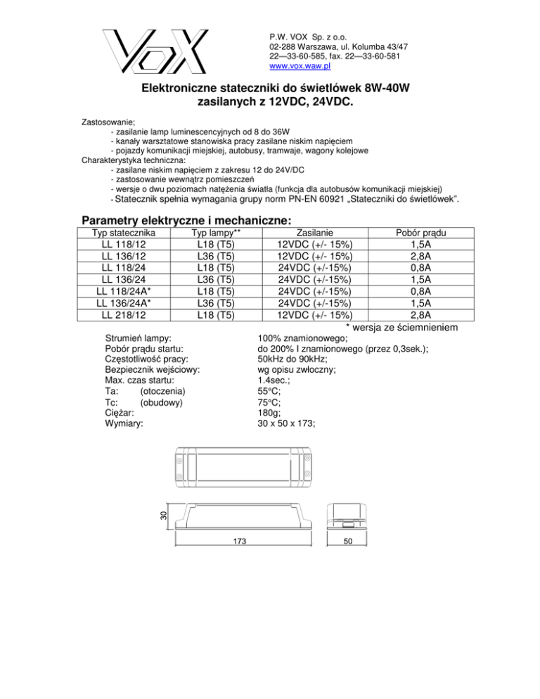 P.W. VOX Sp. z o.o. 02-288 Warszawa, ul. Kolumba 43/47 22—33-60-585, fax. 22—33-60-581 www.vox.waw.pl Elektroniczne stateczniki do świetlówek 8W-40W zasilanych z 12VDC, 24VDC. Zastosowanie; - zasilanie lamp luminescencyjnych od 8 do 36W - kanały warsztatowe stanowiska pracy zasilane niskim napięciem - pojazdy komunikacji miejskiej, autobusy, tramwaje, wagony kolejowe Charakterystyka techniczna: - zasilane niskim napięciem z zakresu 12 do 24V/DC - zastosowanie wewnątrz pomieszczeń - wersje o dwu poziomach natęŜenia światła (funkcja dla autobusów komunikacji miejskiej) - Statecznik spełnia wymagania grupy norm PN-EN 60921 „Stateczniki do świetlówek”. Parametry elektryczne i mechaniczne: Typ statecznika Typ lampy** LL 118/12 LL 136/12 LL 118/24 LL 136/24 LL 118/24A* LL 136/24A* LL 218/12 L18 (T5) L36 (T5) L18 (T5) L36 (T5) L18 (T5) L36 (T5) L18 (T5) Strumień lampy: Pobór prądu startu: Częstotliwość pracy: Bezpiecznik wejściowy: Max. czas startu: Ta: (otoczenia) Tc: (obudowy) CięŜar: Wymiary: Zasilanie Pobór prądu 12VDC (+/- 15%) 1,5A 12VDC (+/- 15%) 2,8A 24VDC (+/-15%) 0,8A 24VDC (+/-15%) 1,5A 24VDC (+/-15%) 0,8A 24VDC (+/-15%) 1,5A 12VDC (+/- 15%) 2,8A * wersja ze ściemnieniem 100% znamionowego; do 200% I znamionowego (przez 0,3sek.); 50kHz do 90kHz; wg opisu zwłoczny; 1.4sec.; 55°C; 75°C; 180g; 30 x 50 x 173;