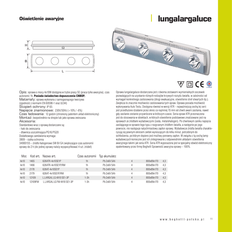 lungalargaluce Oświetlenie awaryjne Opis: oprawa o mocy 4x10W dostępna w trybie pracy SE (praca tylko awaryjna), czas autonomii 1h. Posiada świadectwo dopuszczenia CNBOP. Materiały: oprawa wykonana z samogasnącego tworzywa (zgodność z normami EN 60598-1 oraz UL94) Stopień ochrony: IP 65 Napięcie znamionowe: 230V/50Hz (+10% / -6%) Czas ładowania: 12 godzin (chroniony patentem układ elektroniczny) Montaż: bezpośrednio na stropie lub jako oprawa zwieszana Akcesoria: Standardowo wraz z oprawą dostarczane są: - haki do zwieszania - dławnica uszczelniająca PG16/PG20 Dodatkowego zamówienia wymaga: 3909 – siatka ochronna 34900155 – źródło halogenowe 5W 6V G4 zwiększające czas autonomii oprawy do 2 h (do jednej oprawy należy wyspecyfikować 4 szt. źródeł) Moc Kod art. Nazwa art. Oprawa lungalargaluce dostarczana jest z dwoma zestawami wymienialnych soczewek pozwalających na uzyskanie różnych rodzajów krzywych rozsyłu światła, w zależności od wymagań konkretnego zastosowania (drogi ewakuacyjne, oświetlenie stref otwartych itp.). Zwiększa to znacznie możliwości zastosowania tych opraw. Oprawa posiada możliwość wykonywania Auto Testu. Dostępna również w wersji ATR – najważniejszą cechą tej serii jest przedłużone działanie przez okres co najmniej 15 min od chwili awarii zasilania, nawet gdy zasilanie zostanie przywrócone w krótszym czasie. Seria opraw ATR przeznaczona jest do stosowania w obiektach, w których oświetlenie podstawowe zrealizowane jest na oprawach ze źródłami wyładowczymi (soda, metalohalogen). Po chwilowym zaniku napięcia zasilającego w oprawie tego typu z rozgrzanym źródłem światła, a następnie po jego powrocie, nie następuje natychmiastowy zapłon oprawy. Wyładowcze źródła światła charakteryzują się pewnym okresem zwłoki wynoszącym do kilku minut, potrzebnym do ochłodzenia, po którym dopiero jest możliwy ponowny zapłon. W związku z tą cechą lamp wyładowczych konieczne jest ich zintegrowanie z odpowiednimi układami oświetlenia awaryjnego takimi jak seria ATR. Seria ATR wyposażona jest w specjalny obwód elektroniczny opatentowany przez firmę Beghelli Sprawność awaryjna oprawy – 100%. Czas autonomii Typ akumulatora Szt./opakowanie LxBxH (mm) Kg 4x10 1465 626ATR-4x10SE1P 1h Pb 2x6V 5Ah 4 800x89x170 4,3 4x10 1466 626ATR-4x10SE1P/RM 1h Pb 2x6V 5Ah 4 800x89x170 4,3 4x10 2178 626AT-4x10SE1P 1h Pb 2x6V 5Ah 4 800x89x170 4,3 4x10 2179 626AT-4x10SE1P/RM 1h Pb 2x6V 5Ah 4 800x89x170 4,3 4x10 12109 L.LARGAL LG 4X10 SE1-3P 1-3h Pb 2x6V 5Ah 4 800x89x170 4,3 4x10 12109FM L.LARGAL LG FM 4X10 SE1-3P 1-3h Pb 2x6V 5Ah 4 800x89x170 4,3 11