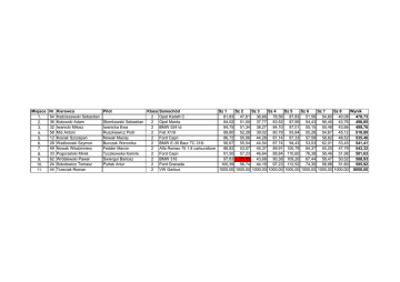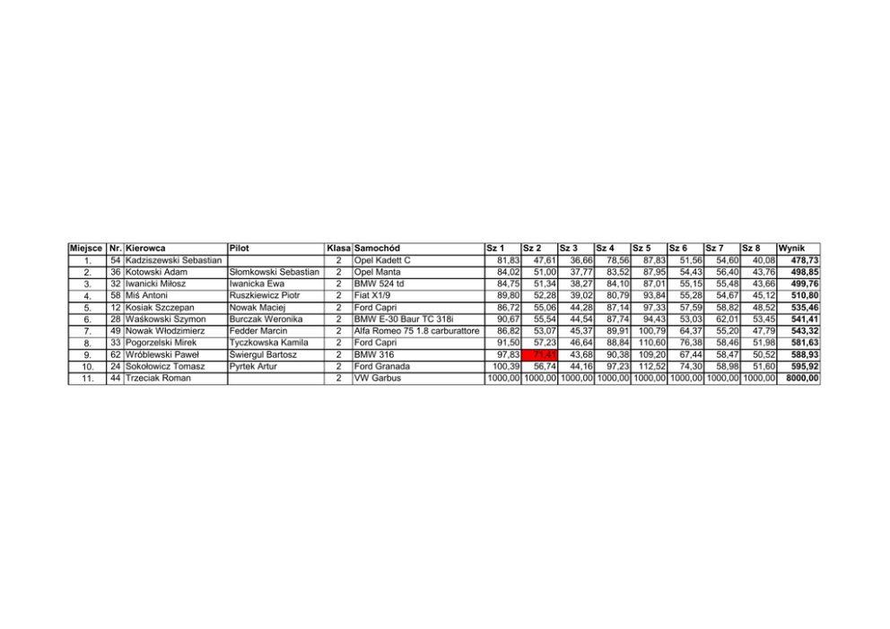 Miejsce 1. 2. 3. 4. 5. 6. 7. 8. 9. 10. 11. Nr. 54 36 32 58 12 28 49 33 62 24 44 Kierowca Kadziszewski Sebastian Kotowski Adam Iwanicki Miłosz Miś Antoni Kosiak Szczepan Waśkowski Szymon Nowak Włodzimierz Pogorzelski Mirek Wróblewski Paweł Sokołowicz Tomasz Trzeciak Roman Pilot Klasa 2 Słomkowski Sebastian 2 Iwanicka Ewa 2 Ruszkiewicz Piotr 2 Nowak Maciej 2 Burczak Weronika 2 Fedder Marcin 2 Tyczkowska Kamila 2 Świergul Bartosz 2 Pyrtek Artur 2 2 Samochód Sz 1 Sz 2 Sz 3 Sz 4 Sz 5 Sz 6 Sz 7 Sz 8 Wynik Opel Kadett C 81,83 47,61 36,66 78,56 87,83 51,56 54,60 40,08 478,73 Opel Manta 84,02 51,00 37,77 83,52 87,95 54,43 56,40 43,76 498,85 BMW 524 td 84,75 51,34 38,27 84,10 87,01 55,15 55,48 43,66 499,76 Fiat X1/9 89,80 52,28 39,02 80,79 93,84 55,28 54,67 45,12 510,80 Ford Capri 86,72 55,06 44,28 87,14 97,33 57,59 58,82 48,52 535,46 BMW E-30 Baur TC 318i 90,67 55,54 44,54 87,74 94,43 53,03 62,01 53,45 541,41 Alfa Romeo 75 1.8 carburattore 86,82 53,07 45,37 89,91 100,79 64,37 55,20 47,79 543,32 Ford Capri 91,50 57,23 46,64 88,84 110,60 76,38 58,46 51,98 581,63 BMW 316 97,83 71,41 43,68 90,38 109,20 67,44 58,47 50,52 588,93 Ford Granada 100,39 56,74 44,16 97,23 112,52 74,30 58,98 51,60 595,92 VW Garbus 1000,00 1000,00 1000,00 1000,00 1000,00 1000,00 1000,00 1000,00 8000,00