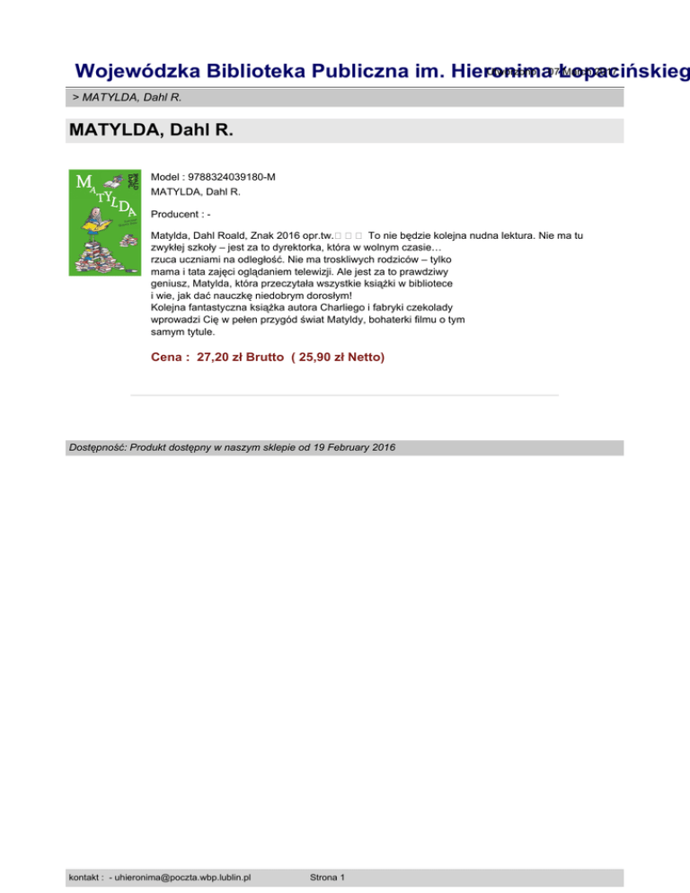 Utworzono : 07Łopacińskieg March 2017 Wojewódzka Biblioteka Publiczna im. Hieronima > MATYLDA, Dahl R. MATYLDA, Dahl R. Model : 9788324039180-M MATYLDA, Dahl R. Producent : Matylda, Dahl Roald, Znak 2016 opr.tw.��� To nie będzie kolejna nudna lektura. Nie ma tu zwykłej szkoły – jest za to dyrektorka, która w wolnym czasie… rzuca uczniami na odległość. Nie ma troskliwych rodziców – tylko mama i tata zajęci oglądaniem telewizji. Ale jest za to prawdziwy geniusz, Matylda, która przeczytała wszystkie książki w bibliotece i wie, jak dać nauczkę niedobrym dorosłym! Kolejna fantastyczna książka autora Charliego i fabryki czekolady wprowadzi Cię w pełen przygód świat Matyldy, bohaterki filmu o tym samym tytule. Cena : 27,20 zł Brutto ( 25,90 zł Netto) Dostępność: Produkt dostępny w naszym sklepie od 19 February 2016 kontakt : - [email protected] Strona 1