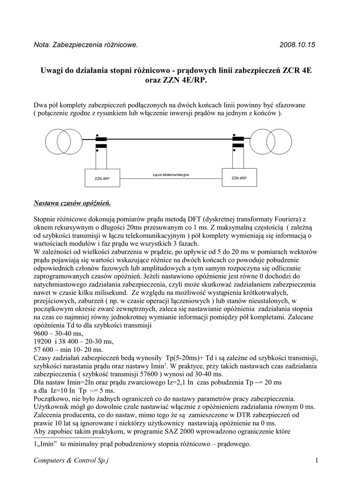Nota. Zabezpieczenia różnicowe. 2008.10.15 Uwagi do działania stopni różnicowo - prądowych linii zabezpieczeń ZCR 4E oraz ZZN 4E/RP. Dwa pół komplety zabezpieczeń podłączonych na dwóch końcach linii powinny być sfazowane ( połączenie zgodne z rysunkiem lub włączenie inwersji prądów na jednym z końców ). ZZN 4RP Łącze telekomunikacyjne ZZN 4RP Nastawa czasów opóźnień. Stopnie różnicowe dokonują pomiarów prądu metodą DFT (dyskretnej transformaty Fouriera) z oknem rekursywnym o długości 20ms przesuwanym co 1 ms. Z maksymalną częstością ( zależną od szybkości transmisji w łączu telekomunikacyjnym ) pół komplety wymieniają się informacją o wartościach modułów i faz prądu we wszystkich 3 fazach. W zależności od wielkości zaburzenia w prądzie, po upływie od 5 do 20 ms w pomiarach wektorów prądu pojawiają się wartości wskazujące różnice na dwóch końcach co powoduje pobudzenie odpowiednich członów fazowych lub amplitudowych a tym samym rozpoczyna się odliczanie zaprogramowanych czasów opóźnień. Jeżeli nastawiono opóźnienie jest równe 0 dochodzi do natychmiastowego zadziałania zabezpieczenia, czyli może skutkować zadziałaniem zabezpieczenia nawet w czasie kilku milisekund. Ze względu na możliwość wystąpienia krótkotrwałych, przejściowych, zaburzeń ( np. w czasie operacji łączeniowych ) lub stanów nieustalonych, w początkowym okresie zwarć zewnętrznych, zaleca się nastawianie opóźnienia zadziałania stopnia na czas co najmniej równy jednokrotnej wymianie informacji pomiędzy pół kompletami. Zalecane opóźnienia Td to dla szybkości transmisji 9600 – 30-40 ms, 19200 i 38 400 – 20-30 ms, 57 600 – min 10- 20 ms. Czasy zadziałań zabezpieczeń bedą wynosiły Tp(5-20ms)+ Td i są zależne od szybkości transmisji, szybkości narastania prądu oraz nastawy Imin1. W praktyce, przy takich nastawach czas zadziałania zabezpieczenia ( szybkość transmisji 57600 ) wynosi od 30-40 ms. Dla nastaw Imin=2In oraz prądu zwarciowego Iz=2,1 In czas pobudzenia Tp ~= 20 ms a dla Iz=10 In Tp ~= 5 ms. Początkowo, nie było żadnych ograniczeń co do nastawy parametrów pracy zabezpieczenia. Użytkownik mógł go dowolnie czule nastawiać włącznie z opóźnieniem zadziałania równym 0 ms. Zalecenia producenta, co do nastaw, mimo tego że są zamieszczone w DTR zabezpieczeń od prawie 10 lat są ignorowane i niektórzy użytkownicy nastawiają opóźnienie na 0 ms. Aby zapobiec takim praktykom, w programie SAZ 2000 wprowadzono ograniczenie które 1„Imin” to minimalny prąd pobudzeniowy stopnia różnicowo – prądowego. Computers & Control Sp.j 1 Nota. Zabezpieczenia różnicowe. 2008.10.15 uniemożliwia taką nastawę. Nastawa maksymalnej różnicy modułów. Zabezpieczenia różnicowe linii, dla stopni pracujących w oparciu o różnicę modułów są wyposażone w funkcję stabilizacji ΔI od prądu fazowego. Stabilizacja działa w odniesieniu do danej fazy. Jej przebieg dla urządzeń serii ZCR 4E i ZZN 4E przedstawia poniższy rysunek. Dla urządzeń serii ZZN 4E TP charakterystyka stabilizująca zamieszczona jest poniżej. Nastawiając parametr „ maksymalna różnica modułów prądu” należy uwzględnić następujące kryteria : 1. parametry przekładników prądowych zainstalowanych na dwóch końcach linii, Computers & Control Sp.j 2 Nota. Zabezpieczenia różnicowe. 2008.10.15 2. maksymalny prąd zwarciowy dla zwarć zewnętrznych zasilanych przez chroniony odcinek linii. Jeżeli wystąpi zwarcie zewnętrzne którego prąd osiągnie wartość Izmax, w wyniku różnic w transformacji prądów pierwotnych na dwóch końcach linii, powstaną różnice modułów których wielkość może osiągać : ΔImax = Izmax x ( ε₁ + ε₂ )/100 gdzie : Izmax – maksymalny prąd zwarciowy dla zwarć zewnętrznych ε₁ – błąd względny przekładnika prądowego na pierwszym końcu, ε₂ – błąd względny przekładnika pomiarowego na drugim końcu, Przykład. Na stronie A zastosowano przekładnik 5P10 o klasie 1% dla prądów w zakresie 1In oraz 5 % dla prądów do 10In, a na stronie B przekładnik 10P20 o klasie 3% dla prądów do 1In i klasie 10 % dla zakresów do 10In. Przyjmując że maksymalny prąd dla zwarć zewnętrznych wynosi 2 In oraz przyjmując maksymalne błędy wyznaczamy maksymalną różnicę : ΔImax= 2 x ( 10+5 )/100 = 0,3 [In]; Jak można zauważyć w takich warunkach, przy zewnętrznym zwarciu różnica modułów może osiągnąć 0,3 In. Nastawienie w zabezpieczeniu niższego poziomu maksymalnej różnicy faz za skutkuje nieselektywnym wyłączeniem. W następnym przykładzie przyjmijmy że maksymalny prąd zwarcia wynosi 10 In a nastawiony próg różnicy modułów równy jest 0,3 In . Wtedy ΔImax= 10 x ( 10+5 )/100 = 1,5 [In]; próg ΔIprog po uwzględnieniu stabilizacji prądu różnicowego będzie równy ΔIprog = 0,3 + 0,1 x 10 = 1,3 [ In]; lub w przypadku urządzeń serii TP ΔIprog = 0,3 + 0,125 x 10 = 1,55 [ In]; Jak widać nastawa ΔIprog = 0,3 In będzie zbyt niska lub praktycznie na granicy dla tego typu przekładników. Prawidłowa nastawa powinna uwzględniać parametry przekładników jak i charakterystykę stabilizującą i dla tego przykładu powinna być większa od 0,5 In. Dodatkowym czynnikiem który należy uwzględnić jest charakterystyka transformacji przez przekładniki, prądów zawierających wyższe częstotliwości co ma na przykład miejsce w przypadku załączania transformatorów. Z obserwacji wynika że różnice takie mogą zwiększać błąd nawet o dalsze 10 %. Może się okazać że nastawa dla ΔIprog musi być większa nawet od 1 In. Należy zwrócić uwagę że taka wysoka nastawa nie ma w zasadzie wpływu na czułość działania zabezpieczeń różnicowo prądowych. W czasie zwarcia na odcinku chronionym zasadnicze znaczenie ma człon porównawczo fazowy, jedynie w przypadku dużych różnic mocy zwarciowych Computers & Control
