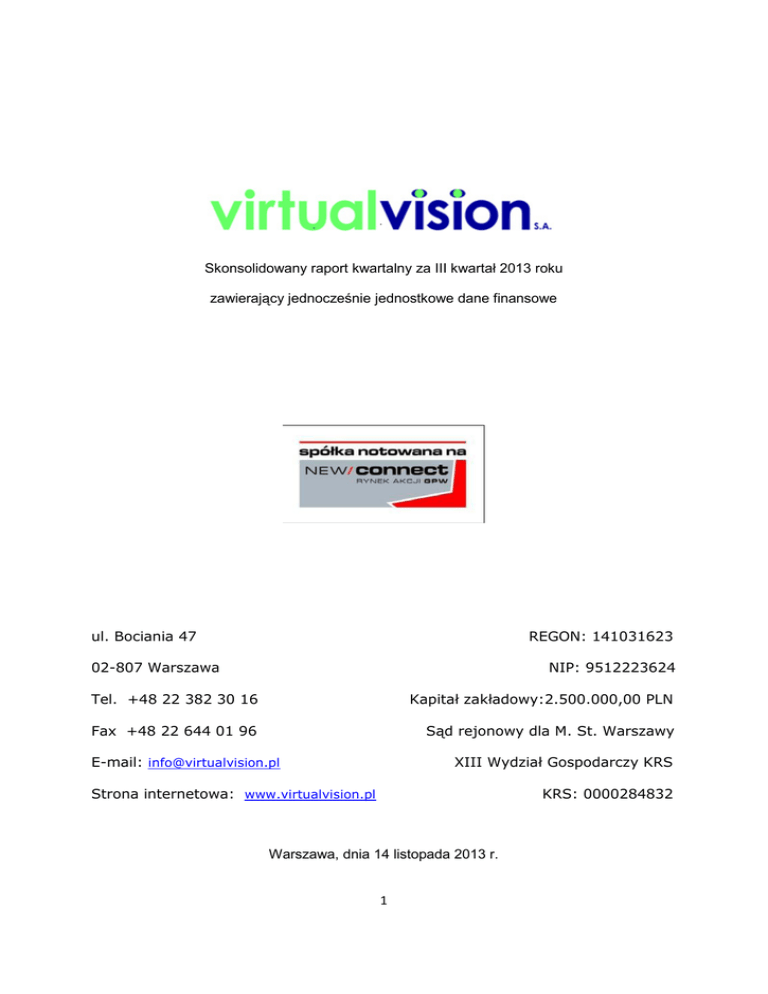 Skonsolidowany raport kwartalny za III kwartał 2013 roku zawierający jednocześnie jednostkowe dane finansowe ul. Bociania 47 REGON: 141031623 02-807 Warszawa NIP: 9512223624 Tel. +48 22 382 30 16 Kapitał zakładowy:2.500.000,00 PLN Fax +48 22 644 01 96 Sąd rejonowy dla M. St. Warszawy E-mail: [email protected] XIII Wydział Gospodarczy KRS Strona internetowa: www.virtualvision.pl KRS: 0000284832 Warszawa, dnia 14 listopada 2013 r. 1 SPIS TREŚCI 1. INFORMACJE OGÓLNE ..................................................................................................................... 3 1. 1 Podstawowe informacje o Emitencie .......................................................................................................... 3 1.2 Organy Emitenta ........................................................................................................................................... 3 1. 3 Struktura akcjonariatu ................................................................................................................................. 3 2. KWARTALNE SKONSOLIDOWANE SKRÓCONE SPRAWOZDANIE FINANSOWE ....................... 4 2.1 Skrócony skonsolidowany bilans ........................................................................................................... 4 2.2 Skrócony skonsolidowany rachunek zysków i strat ............................................................................... 5 2.3 Skrócone skonsolidowane zestawienie zmian w kapitale (funduszu) własnym .................................... 6 2.4 Skrócony skonsolidowany rachunek przepływów pieniężnych – metoda pośrednia ............................ 6 3. KWARTALNE SKRÓCONE SPRAWOZDANIE FINANSOWE VIRTUAL VISION S.A. ...................... 7 3.1 Skrócony bilans ...................................................................................................................................... 7 3.2 Skrócony rachunek zysków i strat.......................................................................................................... 9 3.3 Skrócone zestawienie zmian w kapitale (funduszu) własnym ............................................................. 11 3.4 Skrócony rachunek przepływów pieniężnych – metoda pośrednia .................................................... 12 4. INFORMACJE O ZASADACH PRZYJĘTYCH PRZY SPORZĄDZANIU RAPORTU, W TYM INFORMACJE O ZMIANACH STOSOWANYCH ZASAD (POLITYKI) RACHUNKOWOŚCI ............... 13 5. ZWIĘZŁA CHARAKTERYSTYKA ISTOTNYCH DOKONAŃ LUB NIEPOWODZEŃ EMITENTA W OKRESIE, KTÓREGO DOTYCZY RAPORT WRAZ Z OPISEM NAJWAŻNIEJSZYCH CZYNNIKÓW I ZDARZAŃ, W SZCZEGÓLNOŚCI O NIETYPOWYCH CHARAKTERZE, MAJĄCYCH WPŁYW NA OSIĄGNIĘTE WYNIKI ........................................................................................................................... 13 6. STANOWISKO ODNOŚNIE MOŻLIWOŚCI ZREALIZOWANIA PUBLIKOWANYCH PROGNOZ WYNIKÓW NA DANY ROK W ŚWIETLE WYNIKÓW ZAPREZENTOWANYCH W RAPORCIE ........ 15 7. OPIS STANU REALIZACJI DZIAŁAŃ I INWESTYCJI PRZWIDZIANYCH W DOKUMENCIE INFORMACYJNYM I HARMONOGRAM ICH REALIZACJI .................................................................. 15 8. INFORMACJE O AKTYWNOŚCI NASTAWIONEJ NA WPROWADZENIE ROZWIĄZAŃ INNOWACYJNYCH W PRZEDSIĘBIORSTWIE EMITENTA ................................................................ 15 9. OPIS GUPY KAPITAŁOWEJ ZE WSKAZANIEM JEDNOSTEK PODLEGAJĄCYCH KONSOLIDACJI .................................................................................................................................... 15 10. PRZYCZYNY NIESPORZĄDZANIA SKONSOLIDOWANYCH SPRAWOZDAŃ FINANSOWYCH 15 11. INFORMACJE DOTYCZĄCE LICZBY OSÓB ZATRUDNIONYCH PRZEZ EMITENTA W PRZEPICZENIU NA PEŁNE ETATY ..................................................................................................... 15 2 1. INFORMACJE OGÓLNE 1. 1 Podstawowe informacje o Emitencie a. Virtual Vision S.A. została zawiązana Aktem notarialnym sporządzonym w dniu 29.06.2007 r., Repertorium A nr 3282/2007, w Kancelarii Notarialnej Marek Rudziński w Warszawie przy ul. Powązkowskiej 44 C. Zgodnie ze statutem Spółka została zawiązana na czas nieokreślony. b. Siedziba Spółki mieści się w Warszawie przy ul. Bocianiej 47. c. Spółka posługuje się numerem REGON 141031623 oraz numerem NIP 9512223624. d. Otwarcie ksiąg rachunkowych oraz rozpoczęcie działalności nastąpiło z dniem 16 lipca 2007 roku. e. Postanowieniem Sądu Rejonowego dla m.st. Warszawy XIII Wydział Gospodarczy Krajowego Rejestru Sądowego Spółka została wpisana do Krajowego Rejestru Sądowego – Rejestru Przedsiębiorców pod numerem KRS 0000284832. f. Przedmiotem działalności Spółki jest przede wszystkim: Działalność w dziedzinie produkcji filmowo-telewizyjnej działalność gospodarcza pozostała, 1.2 Organy Emitenta Osoby zarządzające Zarząd Spółki jest jednoosobowy. Funkcję Prezesa Zarządu pełni Pan Richard Kunicki. Osoby nadzorujące Skład Rady Nadzorczej Spółki jest następujący: 1. Szymon Dąbrowski - Członek Rady Nadzorczej (od dnia 29.06.2012) 2. Sandra Maria Kunicki - Członek Rady Nadzorczej (od dnia 29.06.2007), 3. Ivan Solvason - Członek Rady Nadzorczej (od dnia 03.08.2007), 4. Andrzej Górski - Przewodniczący Rady Nadzorczej (od dnia 27.05.2008). 5. Ralph Christians - Członek Rady Nadzorczej (od 30.06.2009) 1. 3 Struktura akcjonariatu Na dzień sporządzenia Raportu struktura akcjonariatu ze wskazaniem akcjonariuszy posiadających co najmniej 5% głosów na walnym zgromadzeniu (zgodnie z zawiadomieniami akcjonariuszy w trybie art. 69 Ustawy o ofercie publicznej) wygląda następująco: Akcjonariusz VAP Video Art. Production GmbH Roderyk Invest Ltd Liczba akcji Liczba głosów Udział w kapitale zakładowym Udział w ogólnej liczbie głosów 102 467 065 132 467 064 40,99% 47,31% 40 186 000 40 186 000 16,07% 14,35% 42,94% 38,34% Pozostali (free float) 3 2. KWARTALNE FINANSOWE 2.1 SKONSOLIDOWANE 