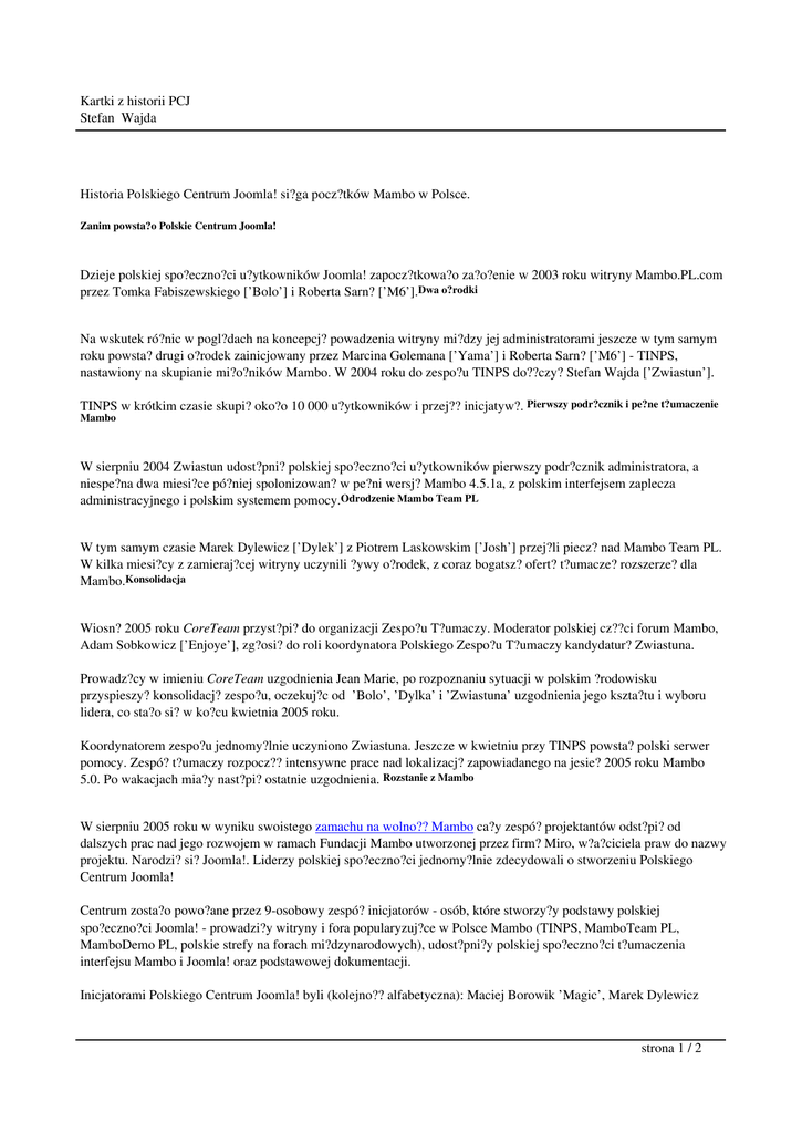 Kartki z historii PCJ Stefan Wajda Historia Polskiego Centrum Joomla! si?ga pocz?tków Mambo w Polsce. Zanim powsta?o Polskie Centrum Joomla! Dzieje polskiej spo?eczno?ci u?ytkowników Joomla! zapocz?tkowa?o za?o?enie w 2003 roku witryny Mambo.PL.com przez Tomka Fabiszewskiego [’Bolo’] i Roberta Sarn? [’M6’].Dwa o?rodki Na wskutek ró?nic w pogl?dach na koncepcj? powadzenia witryny mi?dzy jej administratorami jeszcze w tym samym roku powsta? drugi o?rodek zainicjowany przez Marcina Golemana [’Yama’] i Roberta Sarn? [’M6’] - TINPS, nastawiony na skupianie mi?o?ników Mambo. W 2004 roku do zespo?u TINPS do??czy? Stefan Wajda [’Zwiastun’]. TINPS w krótkim czasie skupi? oko?o 10 000 u?ytkowników i przej?? inicjatyw?. Pierwszy podr?cznik i pe?ne t?umaczenie Mambo W sierpniu 2004 Zwiastun udost?pni? polskiej spo?eczno?ci u?ytkowników pierwszy podr?cznik administratora, a niespe?na dwa miesi?ce pó?niej spolonizowan? w pe?ni wersj? Mambo 4.5.1a, z polskim interfejsem zaplecza administracyjnego i polskim systemem pomocy.Odrodzenie Mambo Team PL W tym samym czasie Marek Dylewicz [’Dylek’] z Piotrem Laskowskim [’Josh’] przej?li piecz? nad Mambo Team PL. W kilka miesi?cy z zamieraj?cej witryny uczynili ?ywy o?rodek, z coraz bogatsz? ofert? t?umacze? rozszerze? dla Mambo.Konsolidacja Wiosn? 2005 roku CoreTeam przyst?pi? do organizacji Zespo?u T?umaczy. Moderator polskiej cz??ci forum Mambo, Adam Sobkowicz [’Enjoye’], zg?osi? do roli koordynatora Polskiego Zespo?u T?umaczy kandydatur? Zwiastuna. Prowadz?cy w imieniu CoreTeam uzgodnienia Jean Marie, po rozpoznaniu sytuacji w polskim ?rodowisku przyspieszy? konsolidacj? zespo?u, oczekuj?c od ’Bolo’, ’Dylka’ i ’Zwiastuna’ uzgodnienia jego kszta?tu i wyboru lidera, co sta?o si? w ko?cu kwietnia 2005 roku. Koordynatorem zespo?u jednomy?lnie uczyniono Zwiastuna. Jeszcze w kwietniu przy TINPS powsta? polski serwer pomocy. Zespó? t?umaczy rozpocz?? intensywne prace nad lokalizacj? zapowiadanego na jesie? 2005 roku Mambo 5.0. Po wakacjach mia?y nast?pi? ostatnie uzgodnienia. Rozstanie z Mambo W sierpniu 2005 roku w wyniku swoistego zamachu na wolno?? Mambo ca?y zespó? projektantów odst?pi? od dalszych prac nad jego rozwojem w ramach Fundacji Mambo utworzonej przez firm? Miro, w?a?ciciela praw do nazwy projektu. Narodzi? si? Joomla!. Liderzy polskiej spo?eczno?ci jednomy?lnie zdecydowali o stworzeniu Polskiego Centrum Joomla! Centrum zosta?o powo?ane przez 9-osobowy zespó? inicjatorów - osób, które stworzy?y podstawy polskiej spo?eczno?ci Joomla! - prowadzi?y witryny i fora popularyzuj?ce w Polsce Mambo (TINPS, MamboTeam PL, MamboDemo PL, polskie strefy na forach mi?dzynarodowych), udost?pni?y polskiej spo?eczno?ci t?umaczenia interfejsu Mambo i Joomla! oraz podstawowej dokumentacji. Inicjatorami Polskiego Centrum Joomla! byli (kolejno?? alfabetyczna): Maciej Borowik ’Magic’, Marek Dylewicz strona 1 / 2 Kartki z historii PCJ Stefan Wajda ’Dylek’, Tomasz Fabiszewski ’Bolo’, Marcin Goleman ’Yama’, Artur Moska?a ’Stone’, Piotr Laskowski ’Josh’, Robert Sarna (’M6’), Adam Sobkowicz ’Enjoye’, Stefan Wajda ’Zwiastun’. 1 wrze?nia 2005, tu? po "oficjalnych narodzinach" Joomla! i rozstrzygni?ciu konkursu na nazw? nowego projektu, zarejestrowali?my now? domen? - joomla.pl. 26 wrze?nia ?wiatlo dzienne ujrza?a witryna www.joomla.pl strona 2 / 2